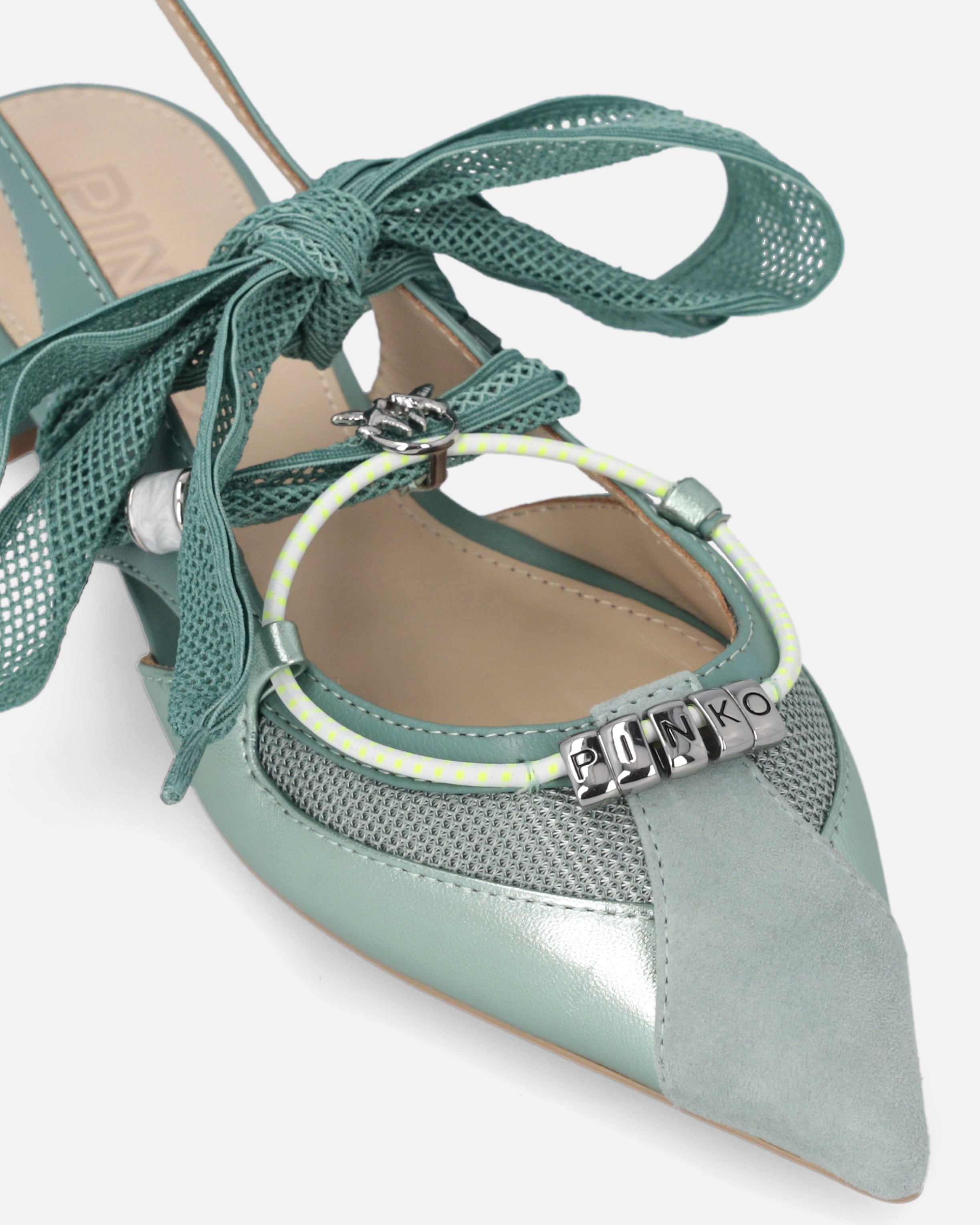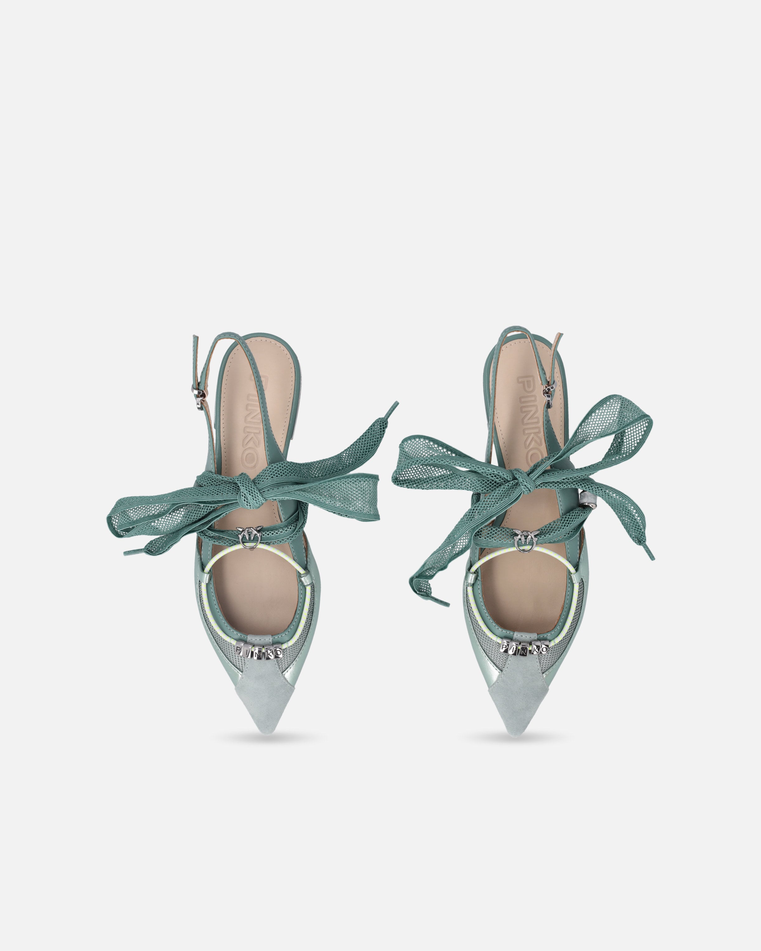 Give your wardrobe a touch of sophisticated femininity this spring with these flat slingbacks in soft smooth nappa leather with a suede toe and mesh panels. The straps to be tied in a bow, again made of mesh, are embellished with a charm and a metal detail with the Love Birds logo, while the lower strap, with subtle graphic elements, is enriched by metal rings arranged to form the iconic PINKO lettering logo. This model features a streamlined silhouette with a tapered toe that gives elegance to the fit, and a flat sole that ensures lightness and comfort for everyday wear, without compromising on style. Perfect for both daytime and evening looks, these ballerinas are sure to turn heads. - GIANIRA 30