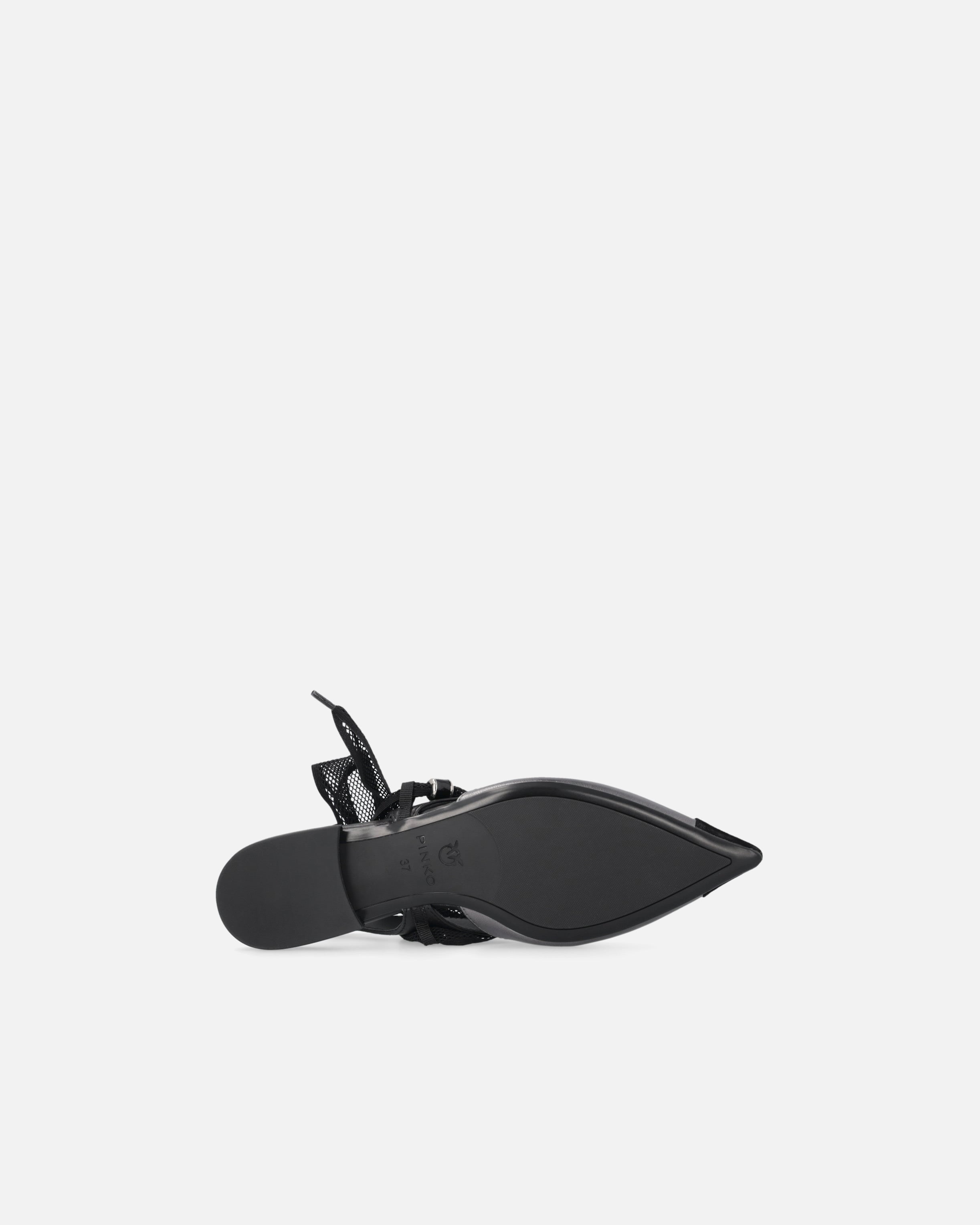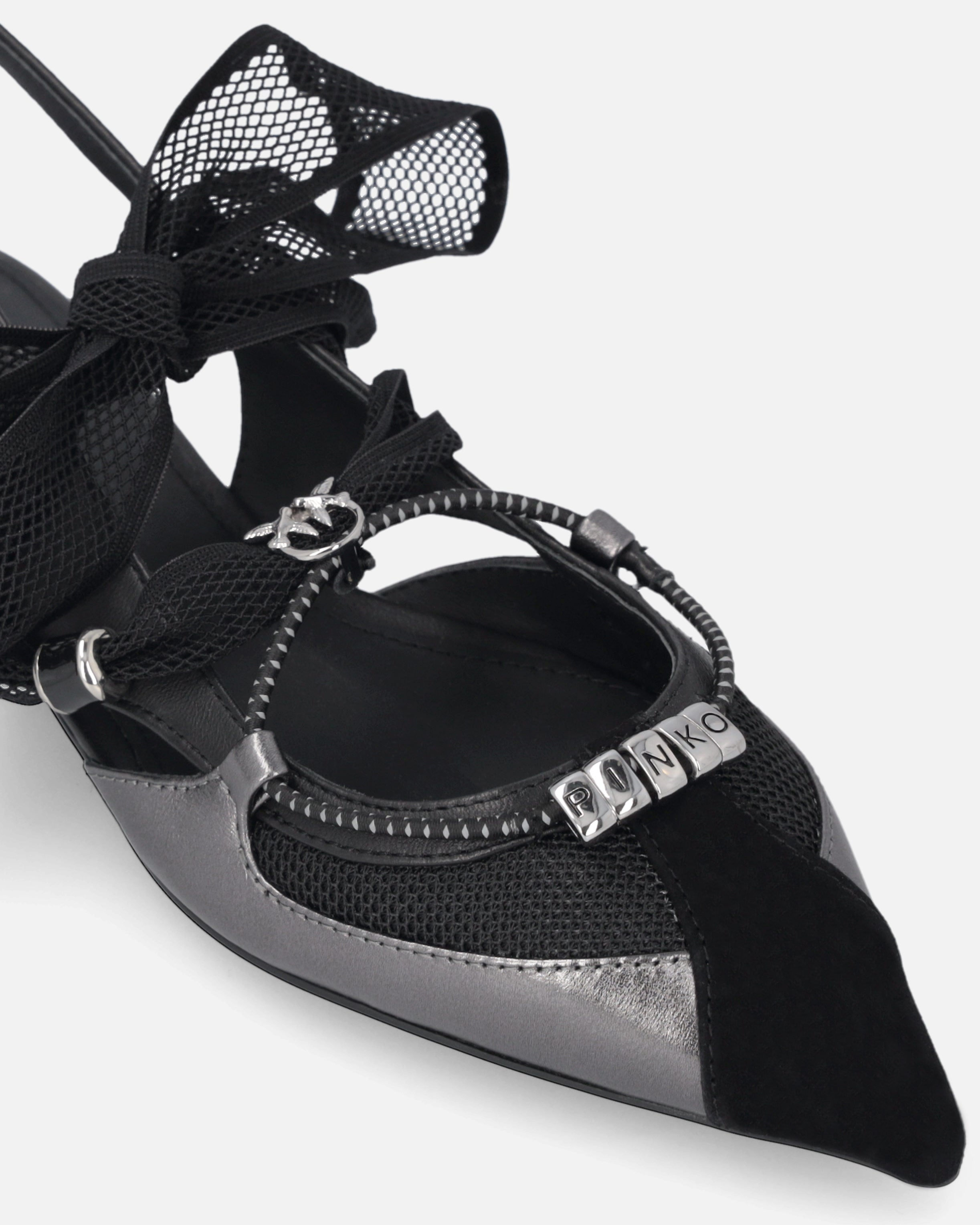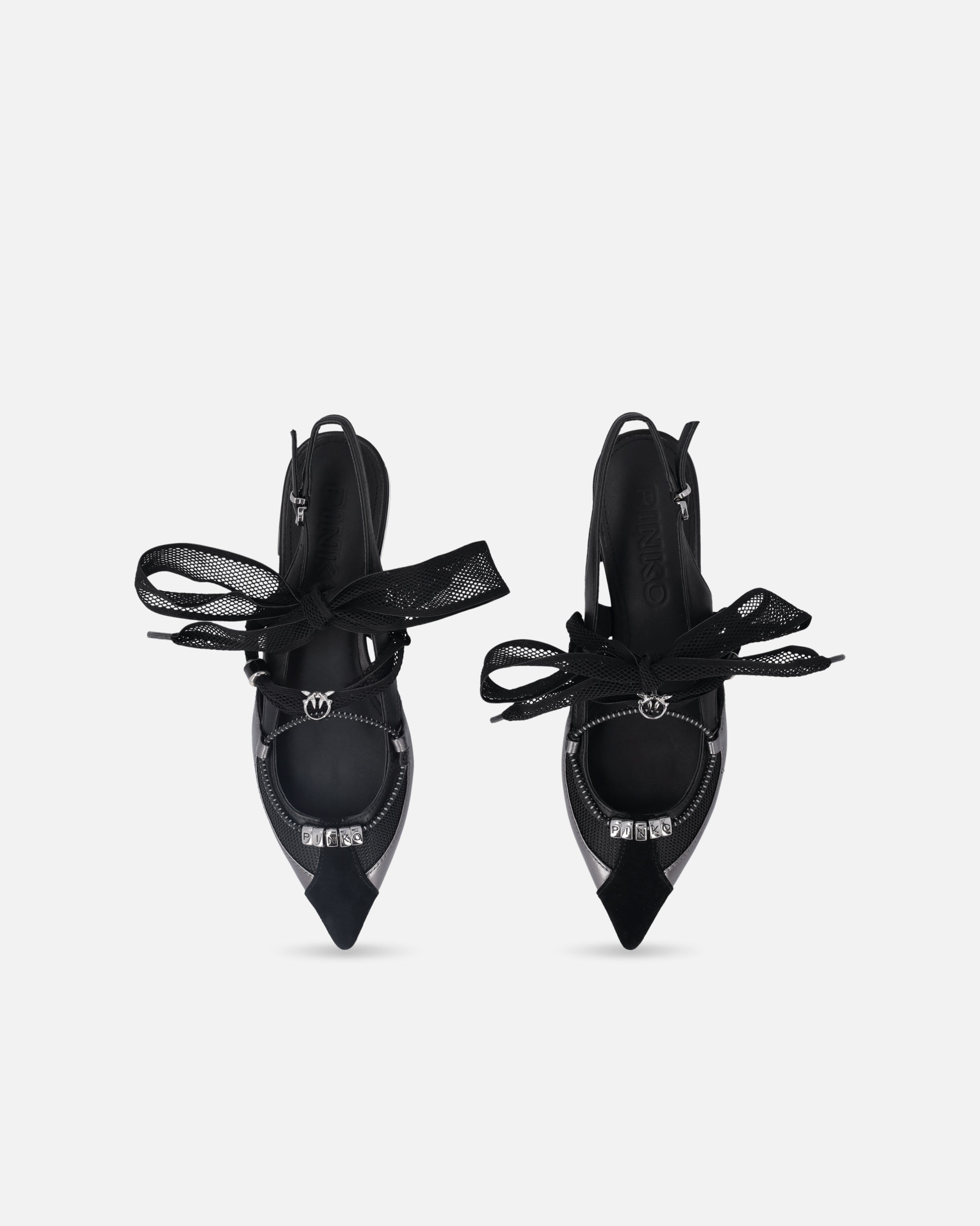 Give your wardrobe a touch of sophisticated femininity this spring with these flat slingbacks in soft smooth nappa leather with a suede toe and mesh panels. The straps to be tied in a bow, again made of mesh, are embellished with a charm and a metal detail with the Love Birds logo, while the lower strap, with subtle graphic elements, is enriched by metal rings arranged to form the iconic PINKO lettering logo. This model features a streamlined silhouette with a tapered toe that gives elegance to the fit, and a flat sole that ensures lightness and comfort for everyday wear, without compromising on style. Perfect for both daytime and evening looks, these ballerinas are sure to turn heads. - GIANIRA 30