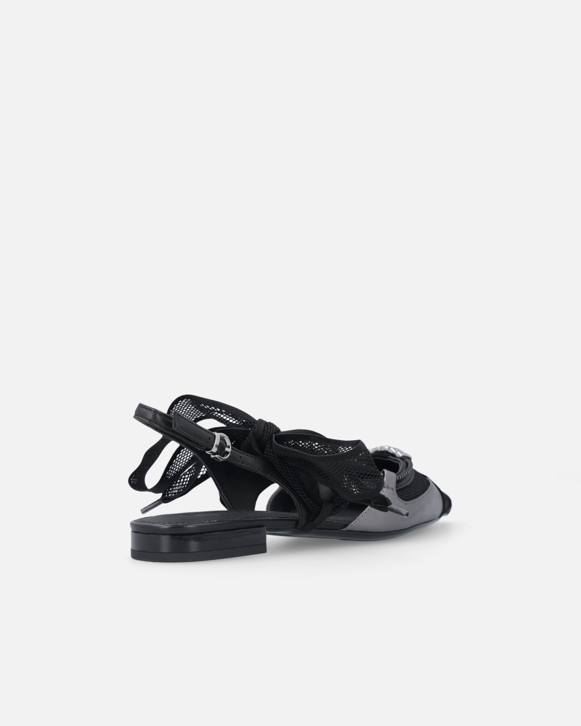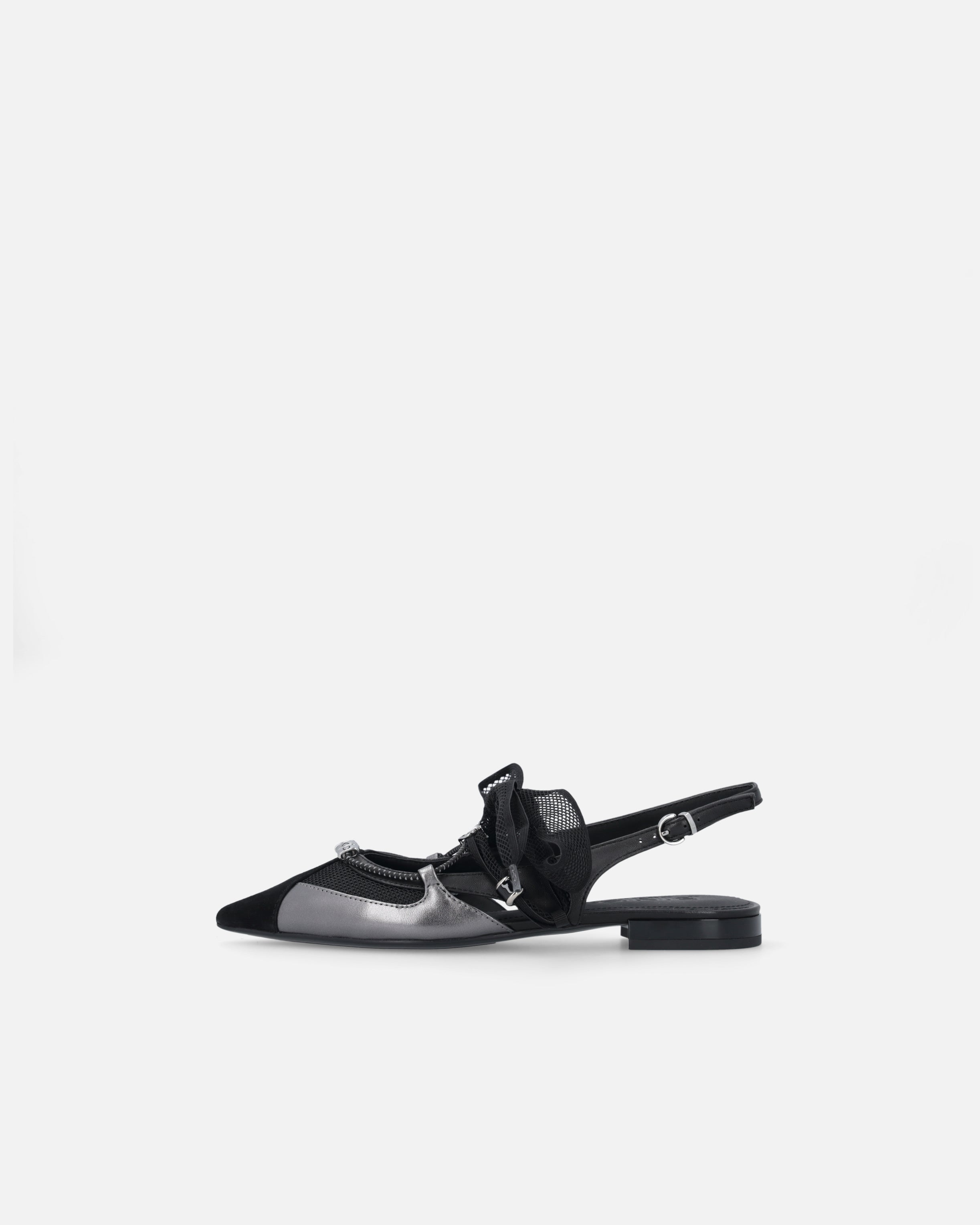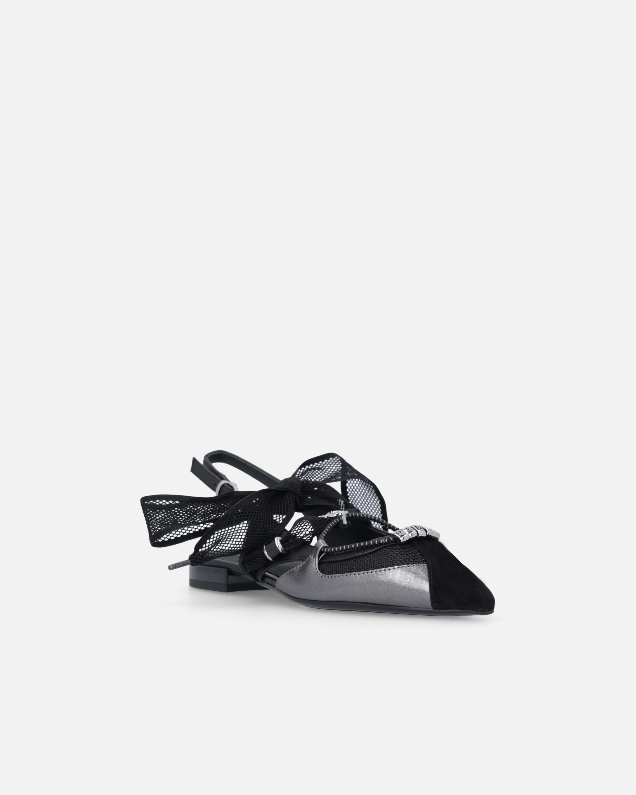Give your wardrobe a touch of sophisticated femininity this spring with these flat slingbacks in soft smooth nappa leather with a suede toe and mesh panels. The straps to be tied in a bow, again made of mesh, are embellished with a charm and a metal detail with the Love Birds logo, while the lower strap, with subtle graphic elements, is enriched by metal rings arranged to form the iconic PINKO lettering logo. This model features a streamlined silhouette with a tapered toe that gives elegance to the fit, and a flat sole that ensures lightness and comfort for everyday wear, without compromising on style. Perfect for both daytime and evening looks, these ballerinas are sure to turn heads. - GIANIRA 30