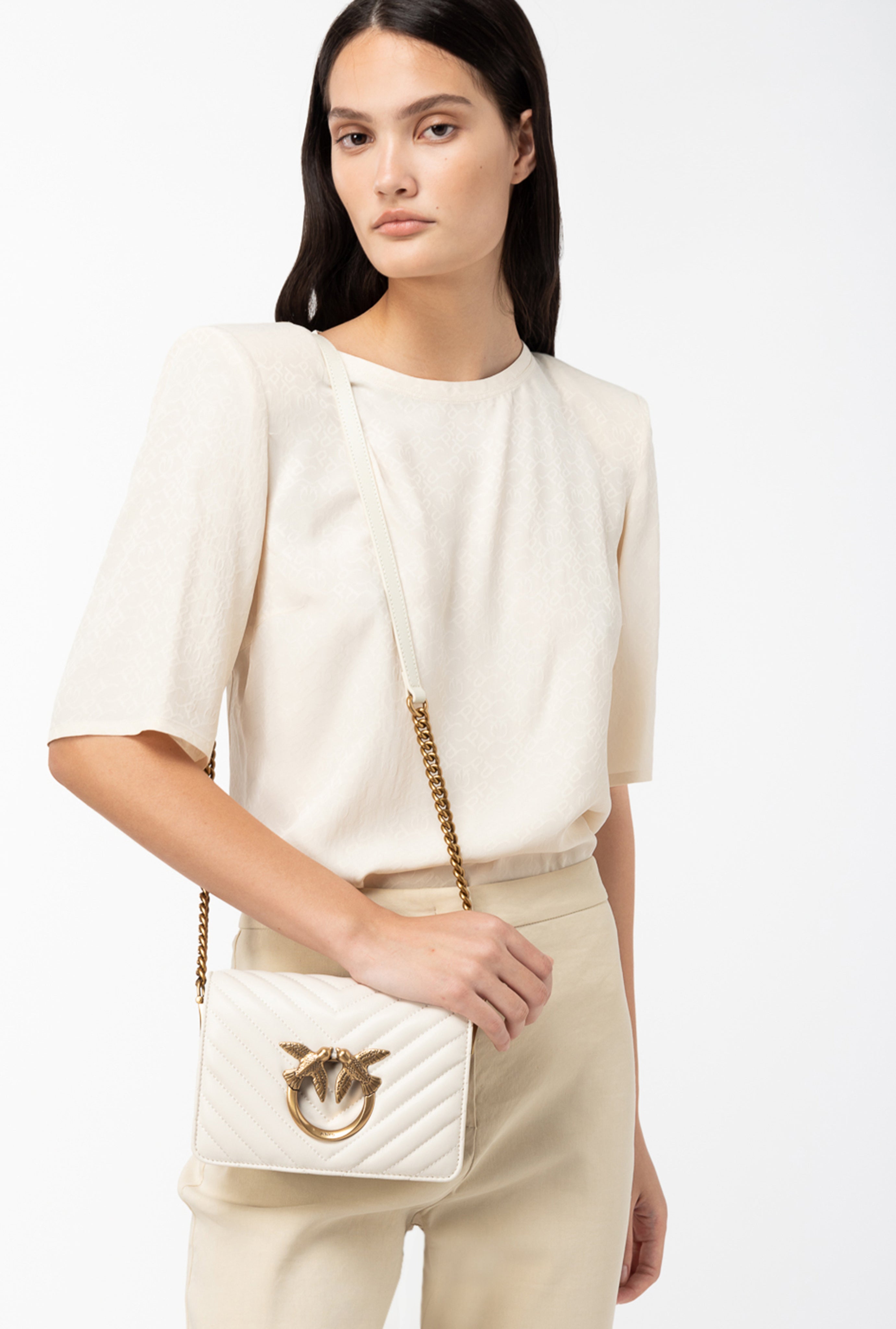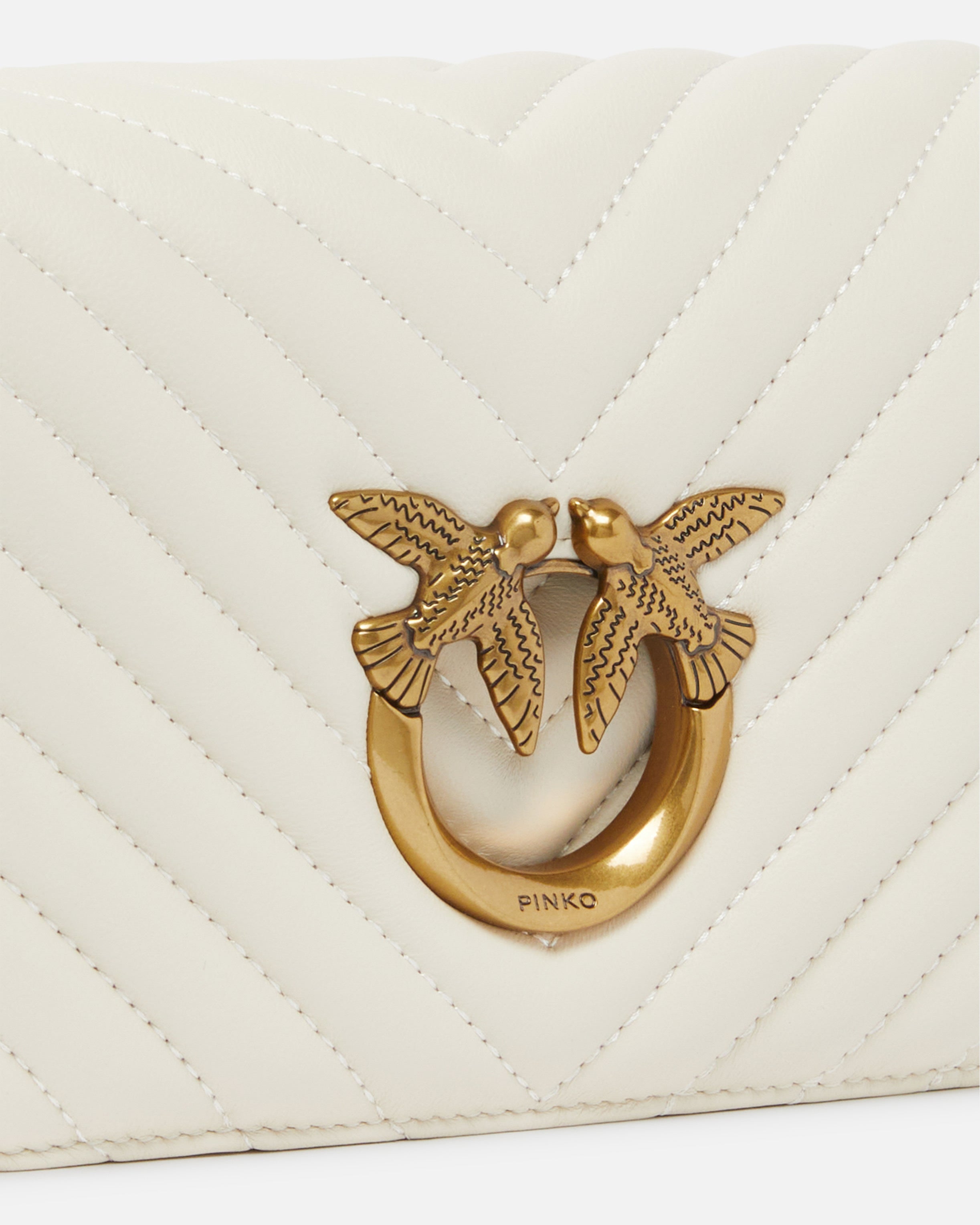 Mini Love Bag Click in quilted nappa leather with chevron design. The concealed press-stud fastening is embellished by the iconic metal Love Birds Diamond Cut buckle with cut-out effect. The accessory boasts a suede microfibre-lined interior, complete with a zipped centre divider pocket and leather slip pocket. The shoulder strap combines the metal round-link chain with a practical, adjustable leather pad.