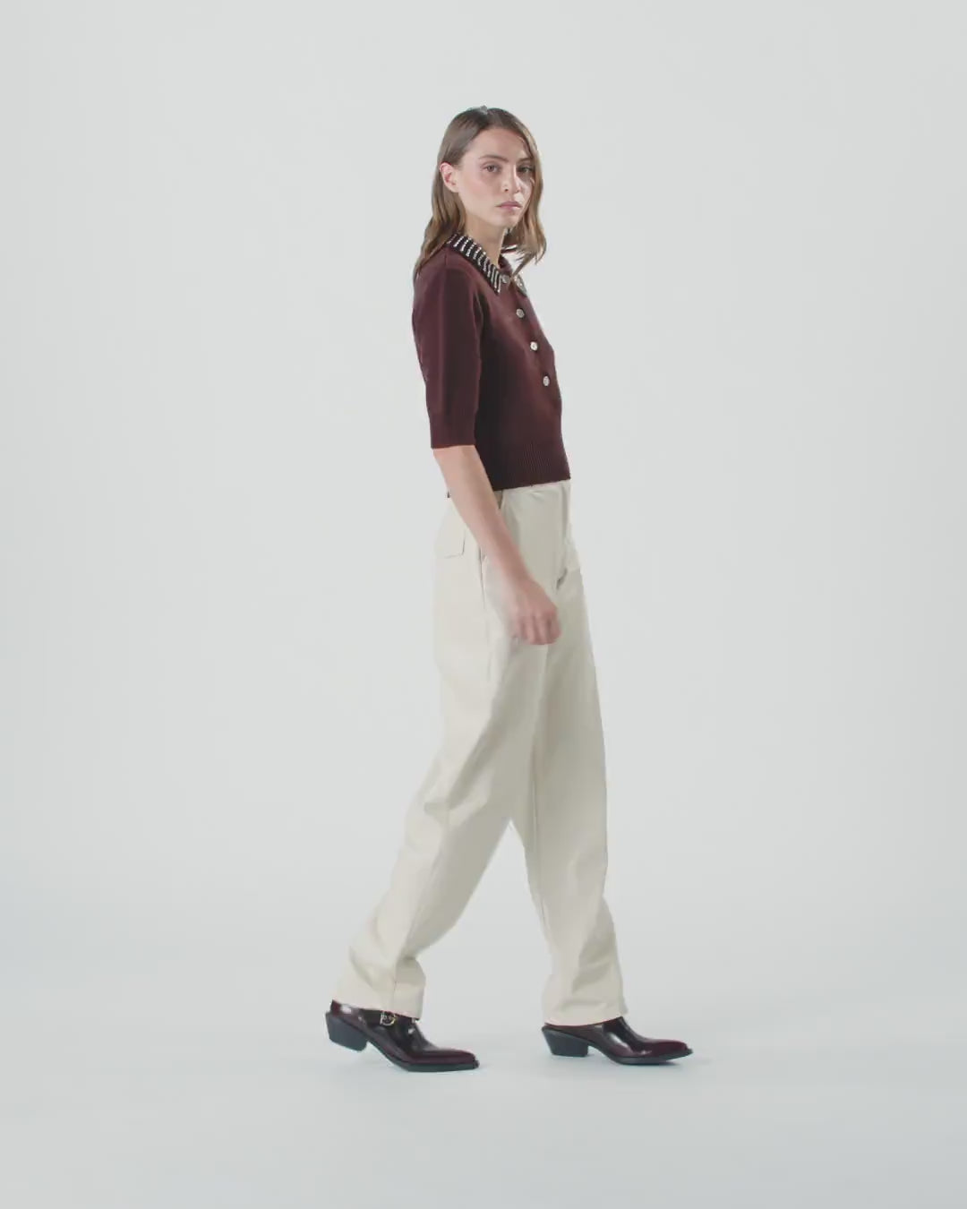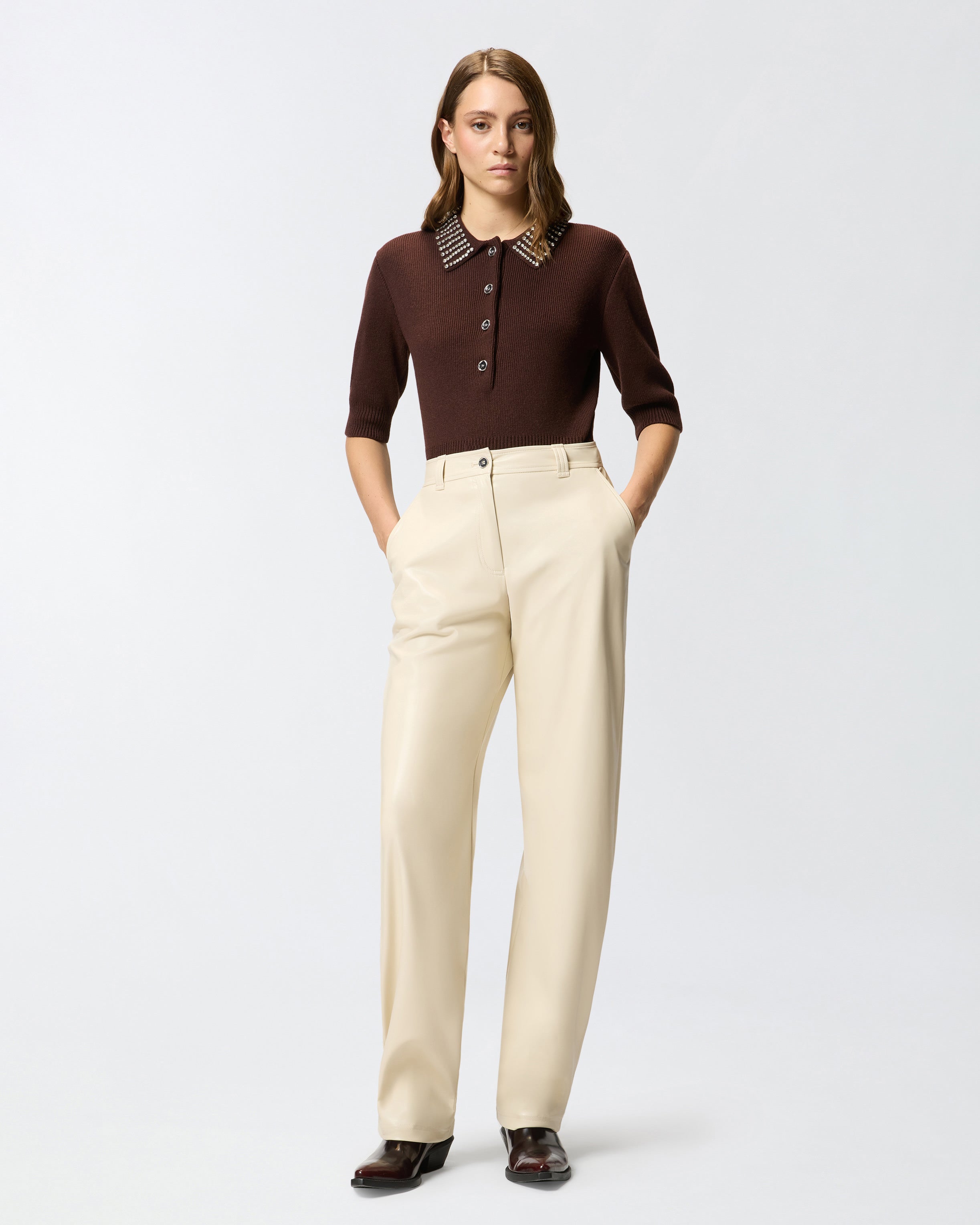 Balloon-fit trousers with a soft balloon leg that is rounded at the top and more cinched on the hem. This soft touch faux leather coated fabric piece is equipped with belt loops and faux flap pockets on the back. Concealed zip and button fastening. The clean and simple lines of this garment makes it a staple to add immediately to your wardrobe.