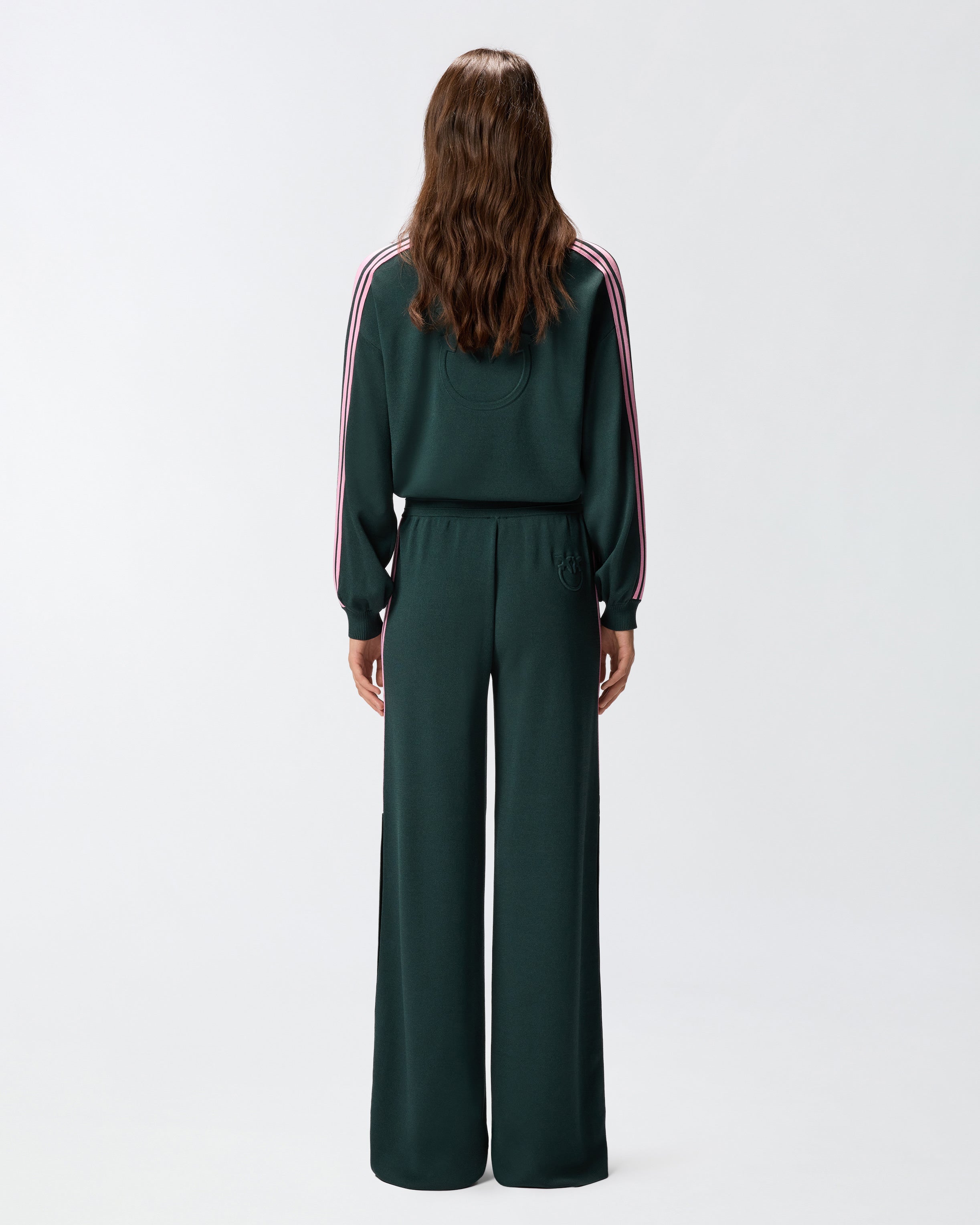 Tracksuit-style sports trousers in technical fleece-effect pique fabric, featuring practical side pockets, trimmed with a contrasting side band down the wide leg. This style’s fit can be adjusted using the stretch drawstring on the waist, while the final touch is given by the Love Birds logo on the back. The piece has undergone finishing tests to minimise the possible formation of pilling, ensuring greater fabric softness and durability.