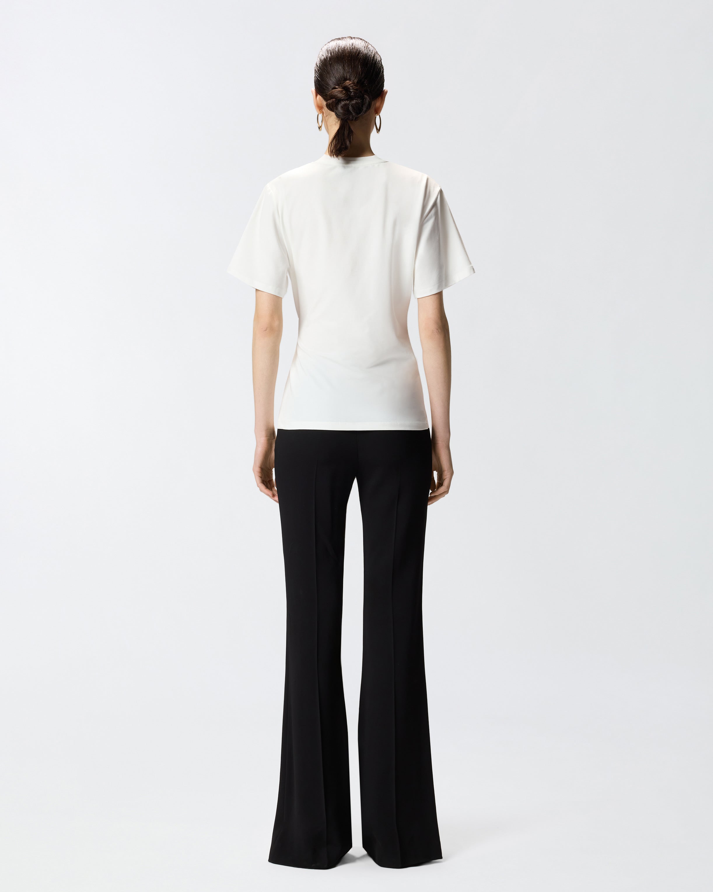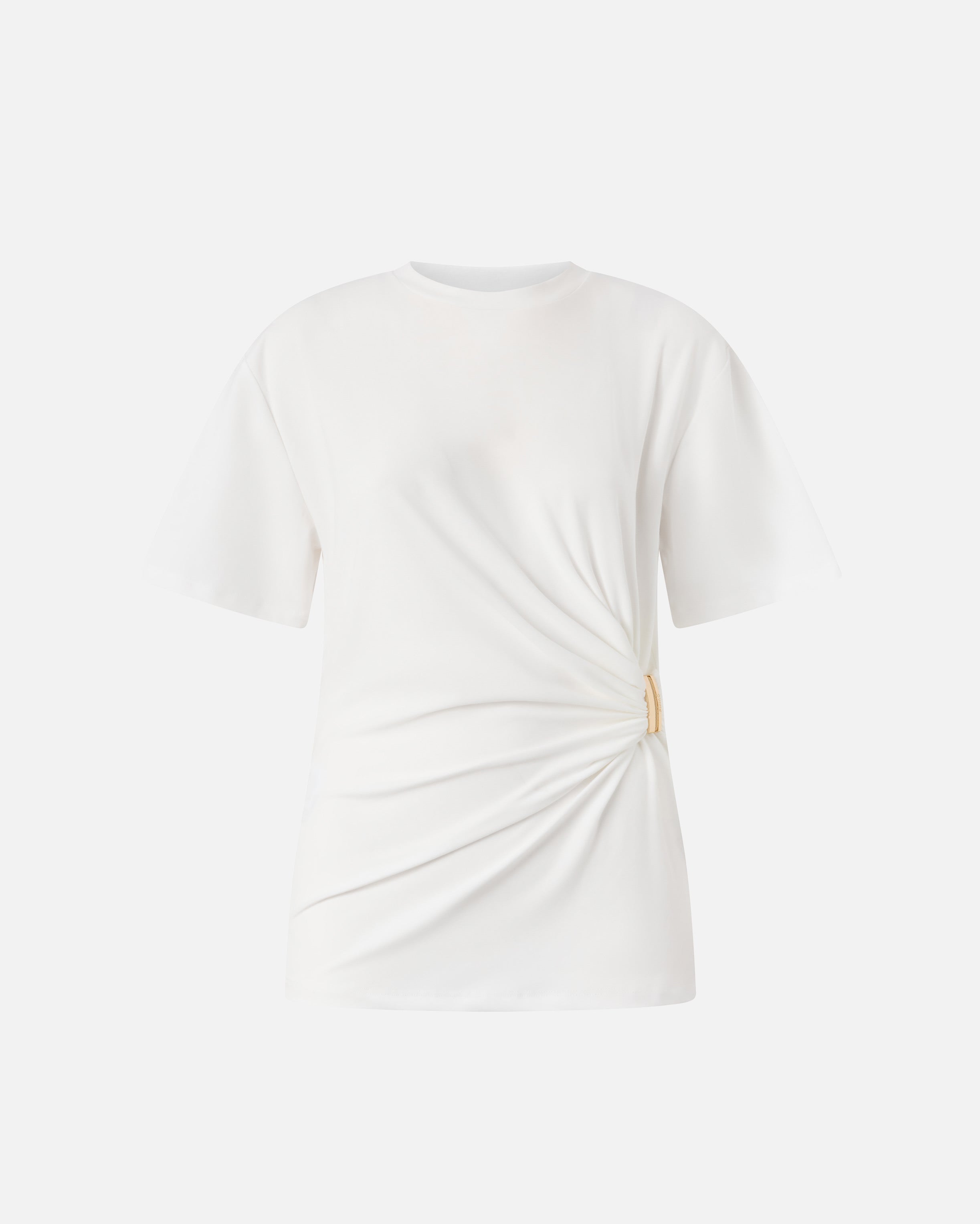 Short-sleeved crew-neck T-shirt in Supima stretch cotton interlock, a premium fabric with a soft and compact feel and a shiny effect. Enhancing the garment is an unmistakably glamorous detail in true PINKO style: a gold-toned detail at the waist that creates a refined draped effect at the front. A versatile piece that is easy to wear with a pair of jeans or layer under a jacket for a casual look.