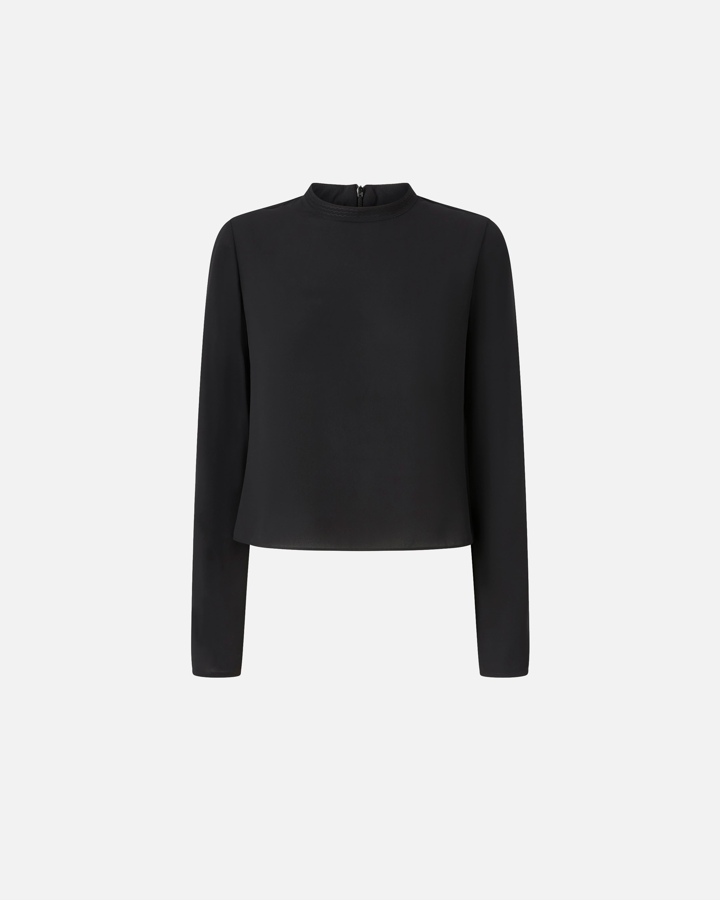 Blouse with long sleeves finished with buttons, the first of which is decorated with a star. The very fine, fluid and light technical crepe fabric is particularly suitable for everyday wear. The collar is slightly raised and is embellished with a glossy tonal embroidered ribbon. Invisible zip fastening on the back.