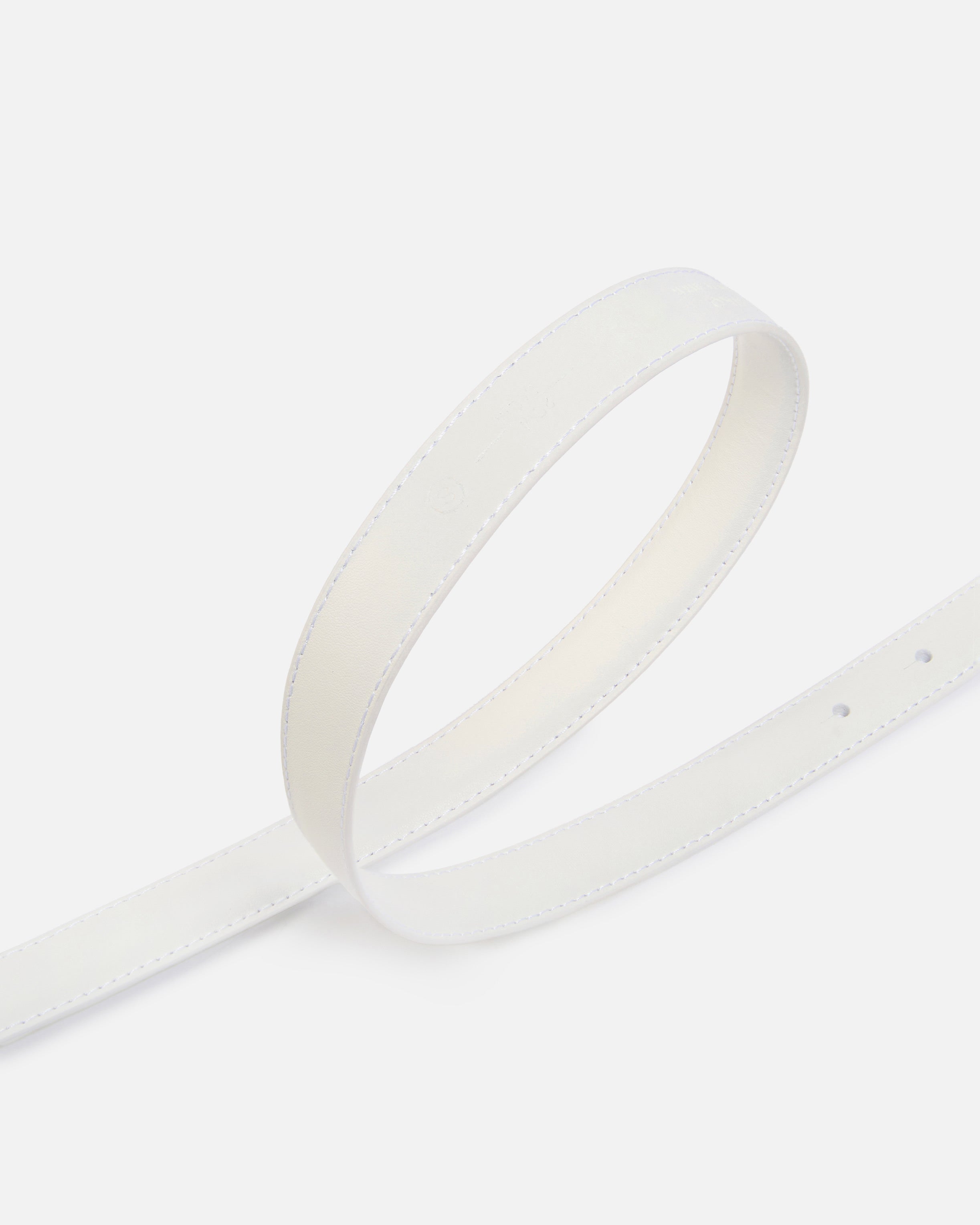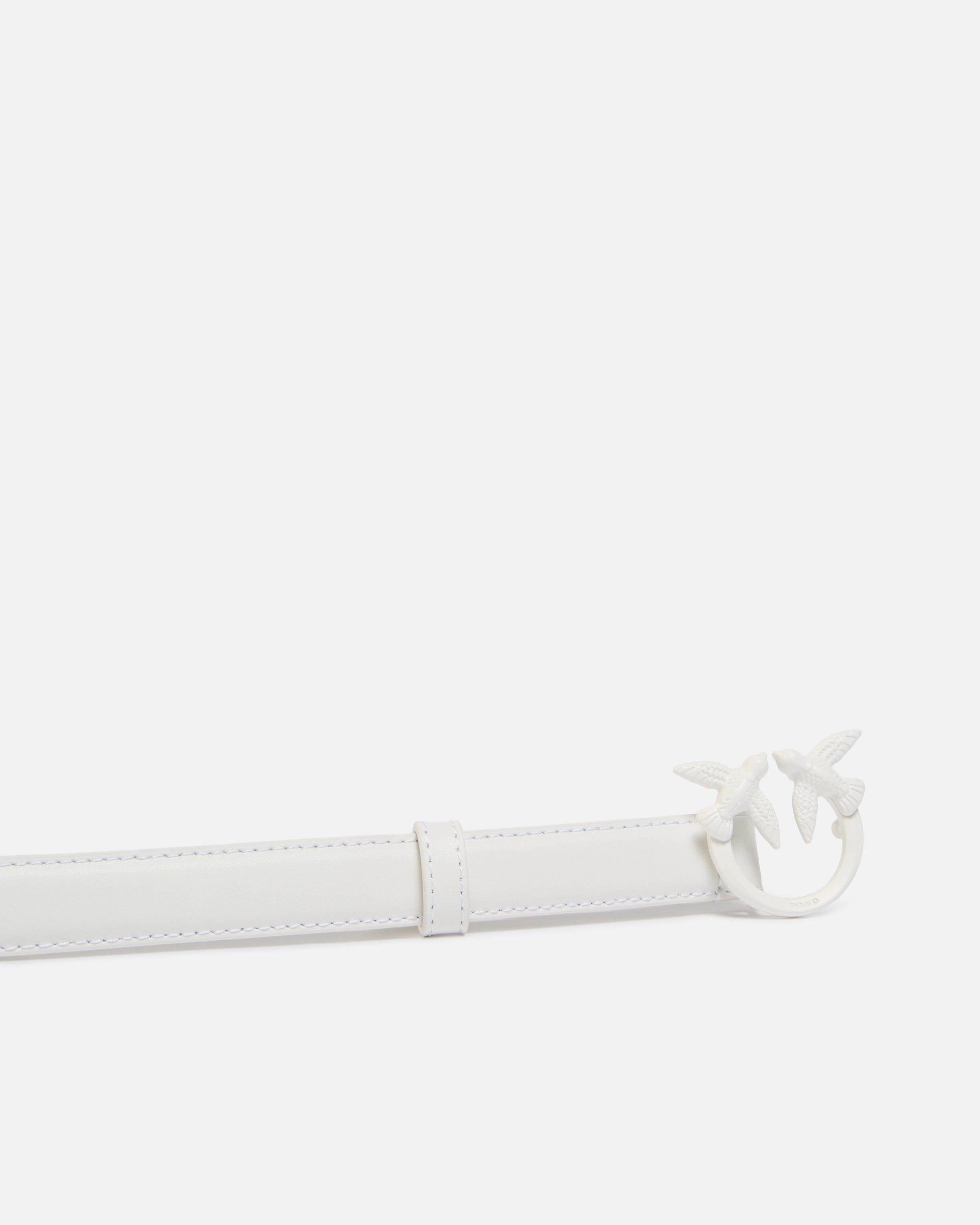 Thin belt in soft, silky colour-block leather with mini, matching-colour electroplated enamelled metal Love Birds Diamond Cut buckle.
