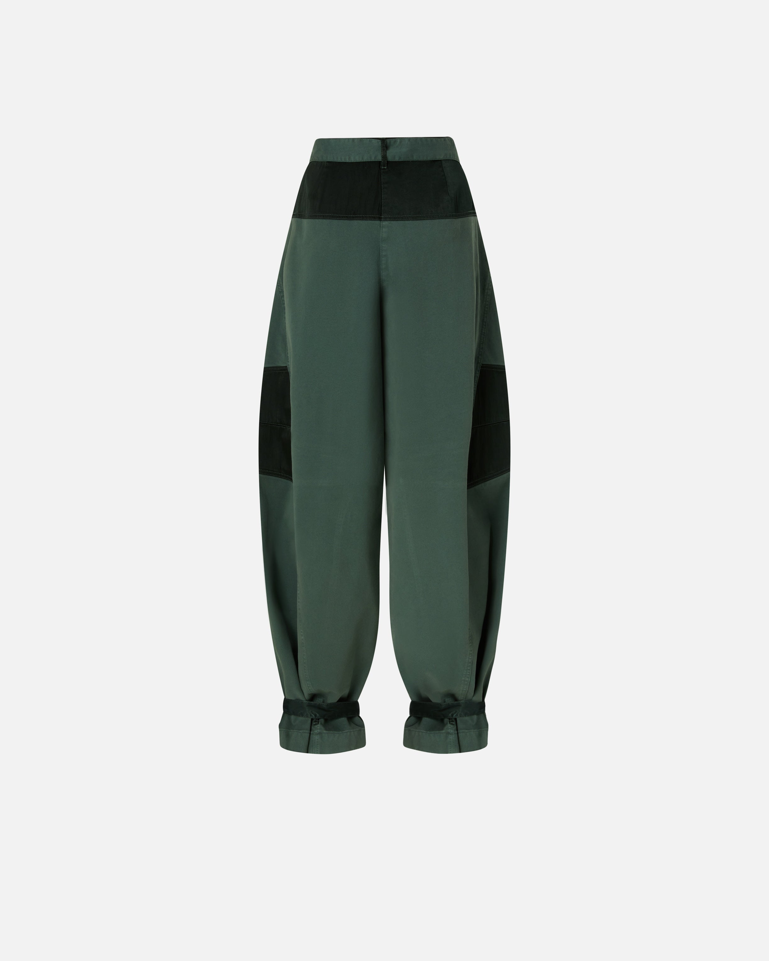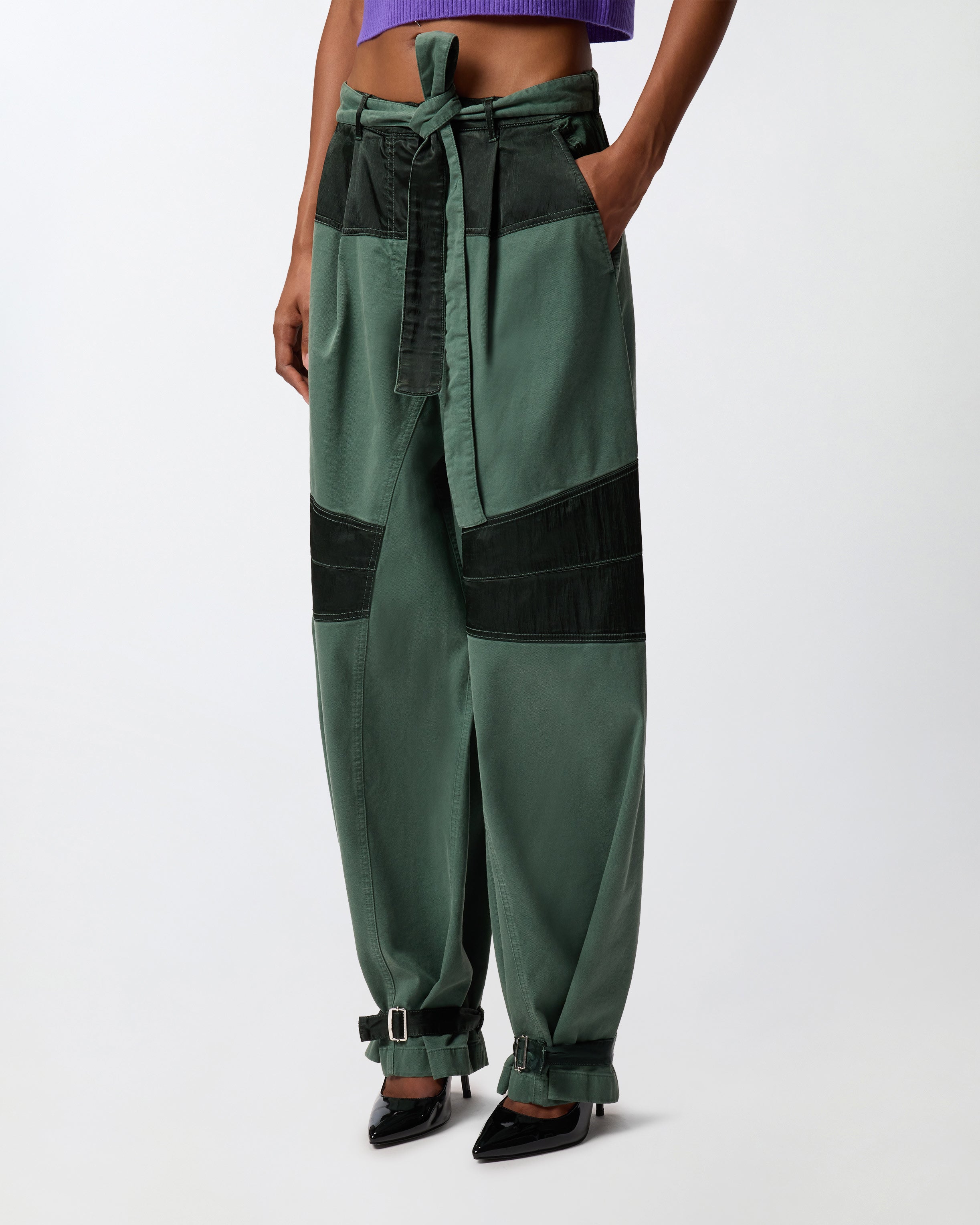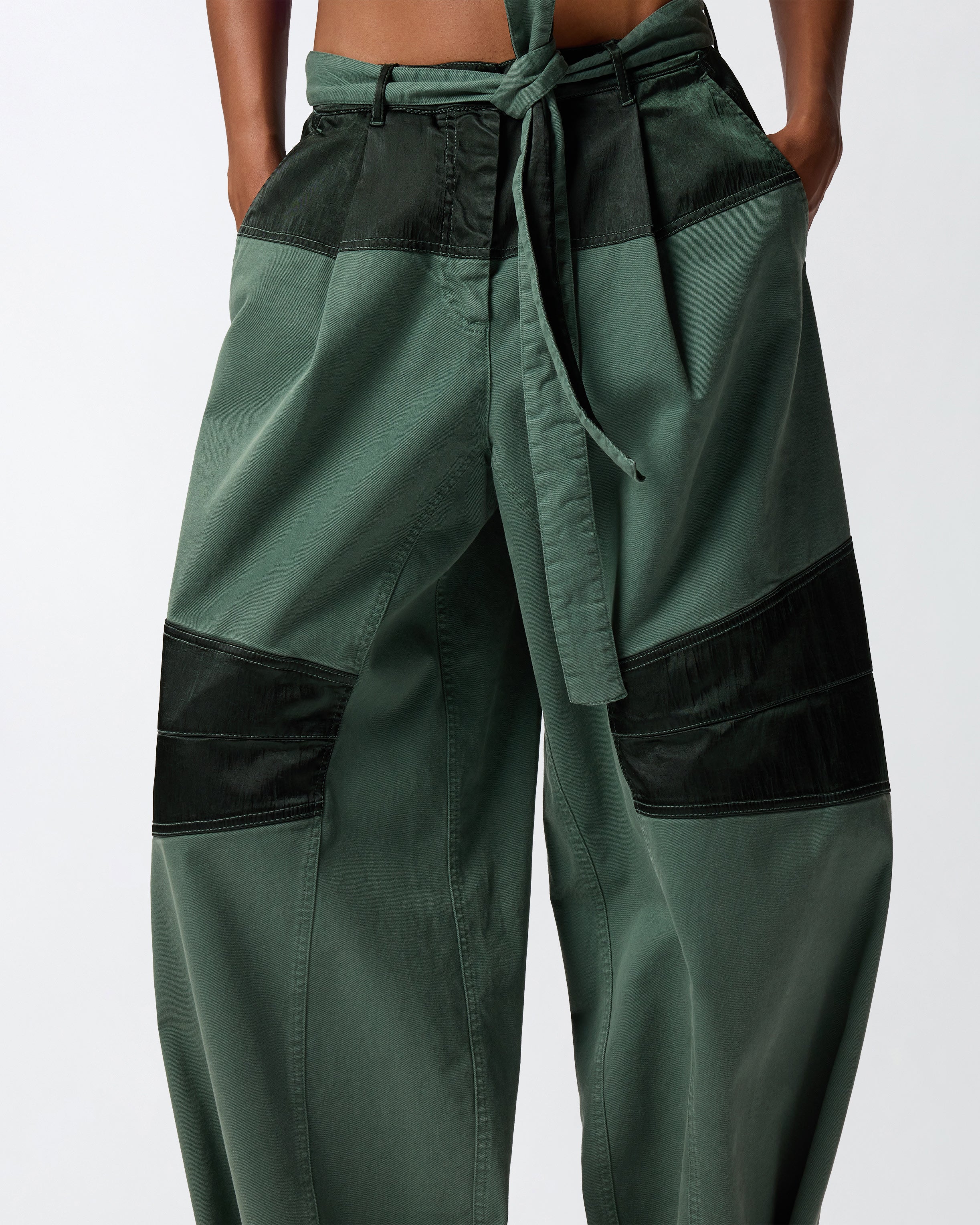 Cotton trousers with very wide, rounded barrel-leg fit with garment-dyed satin sections that create a fabric contrast typical of the PINKO universe. This pair features belt loops, topstitching, seams and inserts that give it its signature utility style, and is complete with a matching belt to tie at the waist and adjustable hem straps to tailor the fit and style. Embrace sporty, functional style with this contemporary piece, ideal for casual occasions.