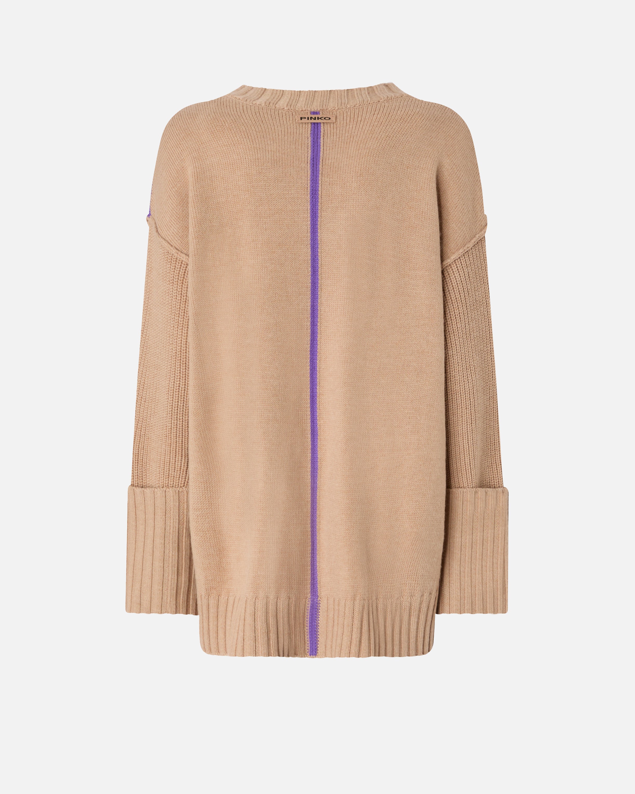 V-neck cardigan in fine merino wool, which makes the garment soft and light to the touch. Wear the casual elegance of this design with dropped shoulders and large functional pockets, one of which features the iconic tone-on-tone label with PINKO lettering logo. The neck, hem, cuffs and pocket trims come in a rib knit, while a contrasting vertical yarn stands out on the back. The piece has undergone finishing tests to minimise the possible formation of pilling, ensuring greater fabric softness and durability.