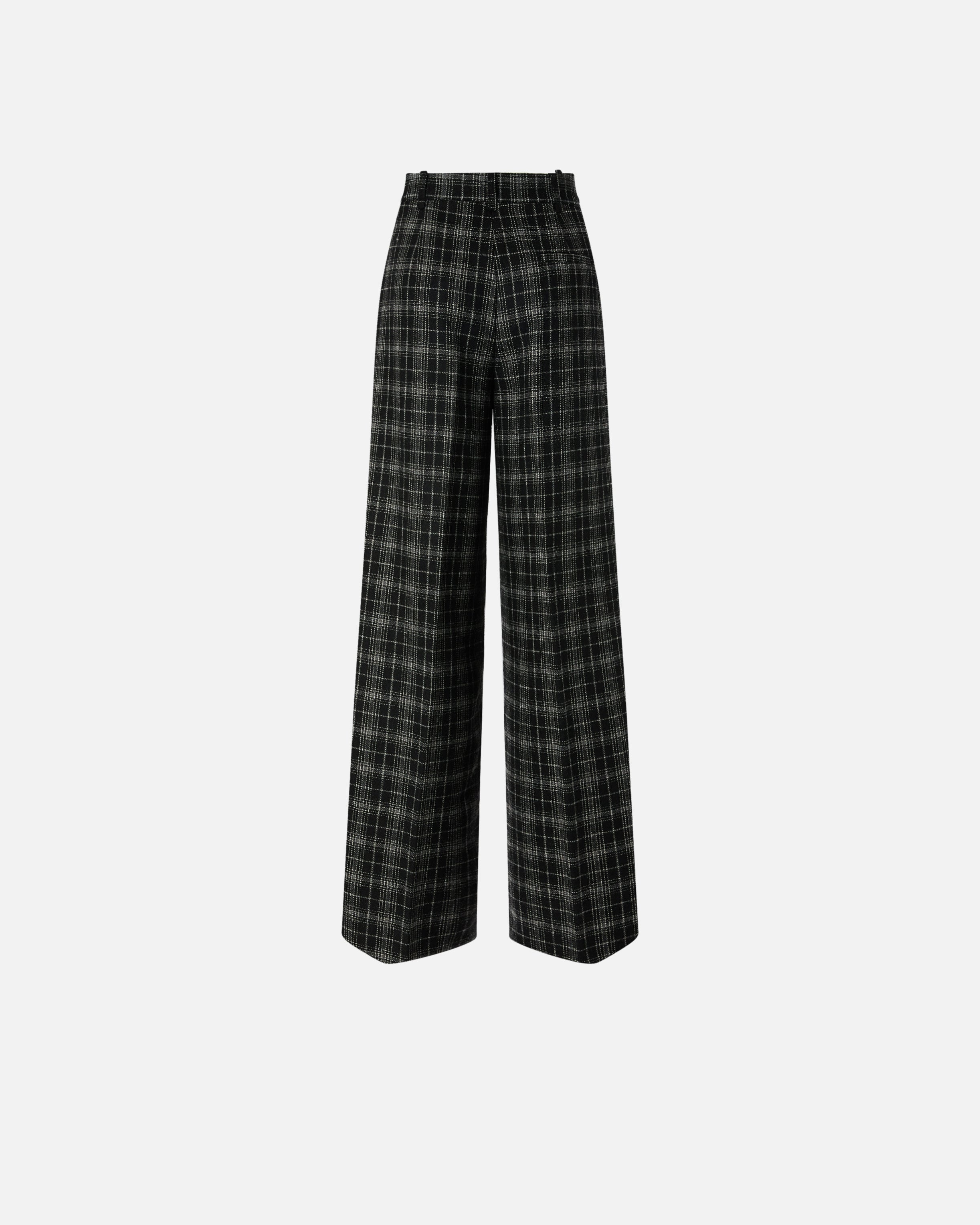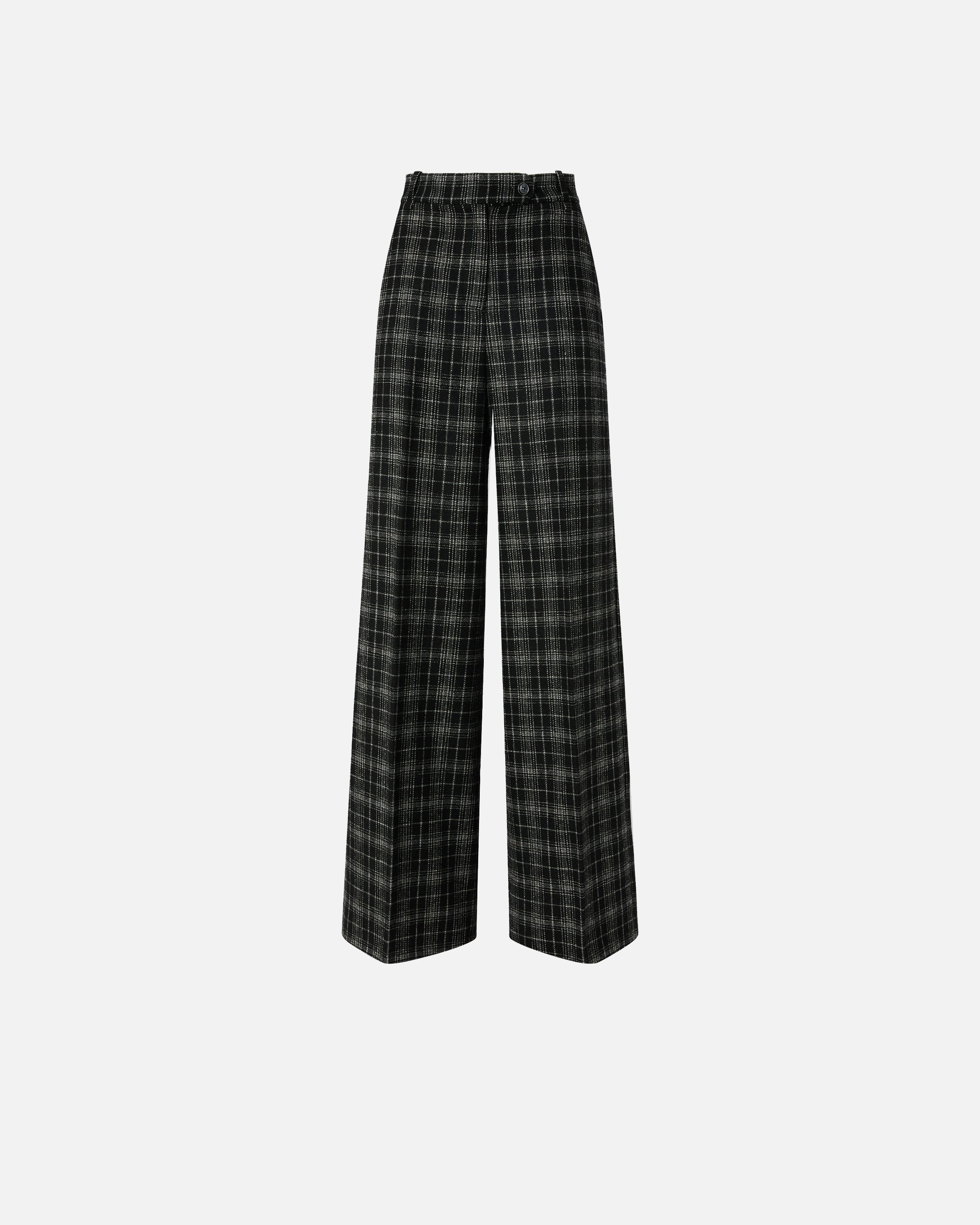 Tailored-style long trousers in yarn-dyed wool-blend fabric with all-over check motif. This garment, boasting a wide palazzo fit and a pressed crease down the middle of the legs, is complete with an off-centre zip and button fastening at the front. Wear this pair with its matching jacket for a head-to-toe look that's ideal for formal occasions or pair with more casual garments for an everyday outfit that doesn't sacrifice style.