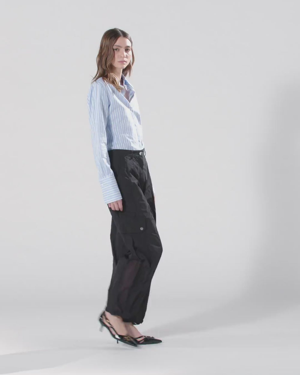 Trousers made of taffeta-like technical canvas, with side inserts made of organza ripstop for a combination of strength and transparency. This garment features an adjustable drawstring at the leg hem, two side pockets, two back patch pockets and two workwear-effect pockets with flap and press studs down the legs. A versatile, modern garment that reinterprets the streetwear spirit with a PINKO twist. - ROMEY TROUSERS