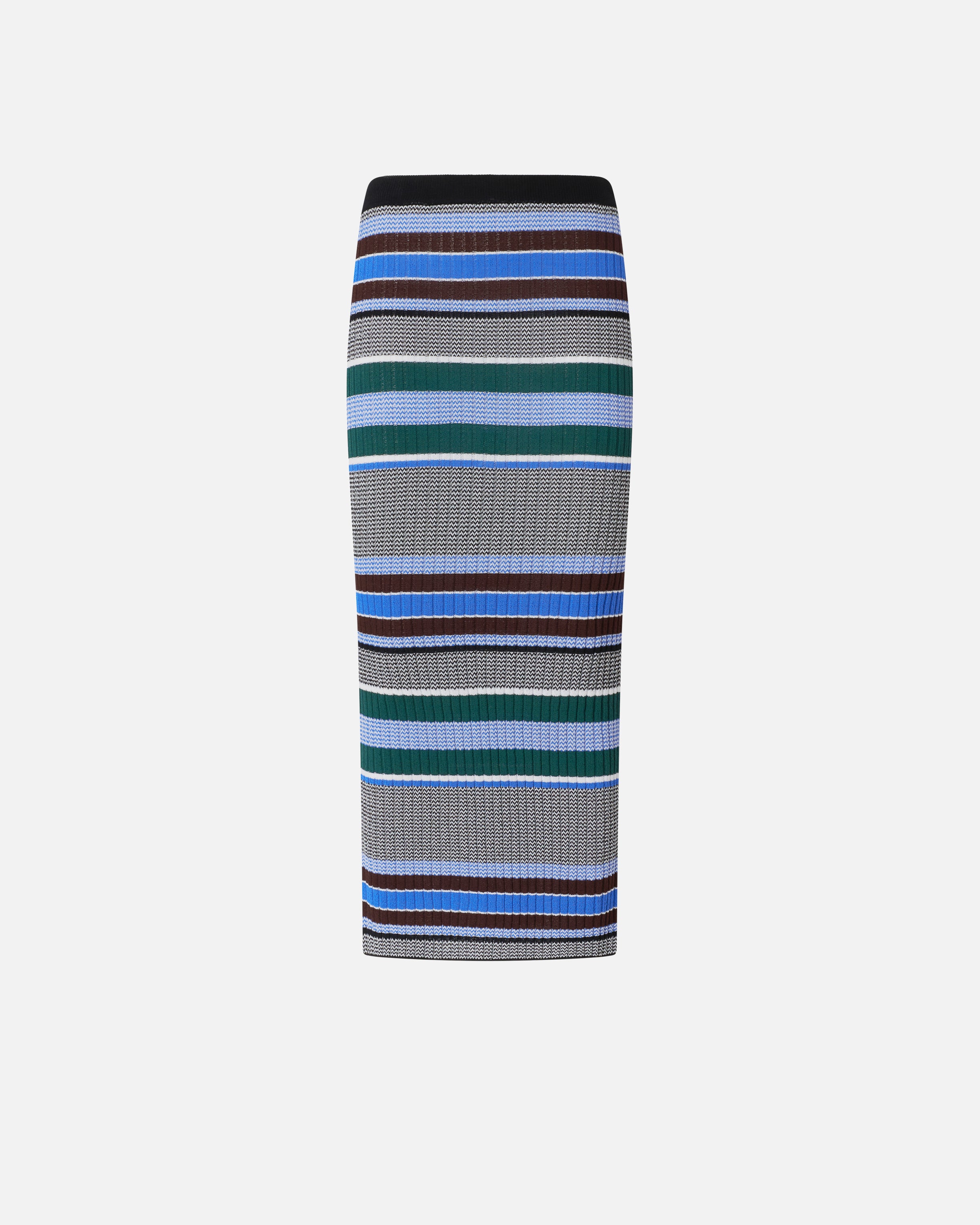 Slim-fitting calf-length skirt with comfortable elasticated waist. Perfect for breathing life into new daytime looks, this model is made from ribbed knit viscose fabric—a particularly stretchy and comfortable material designed to caress the body in a natural way—and is customised with a multicoloured pattern with stripes that differ in thickness, lending a dynamic edge and extra movement. The final touch is given by the label with PINKO logo lettering on the back.