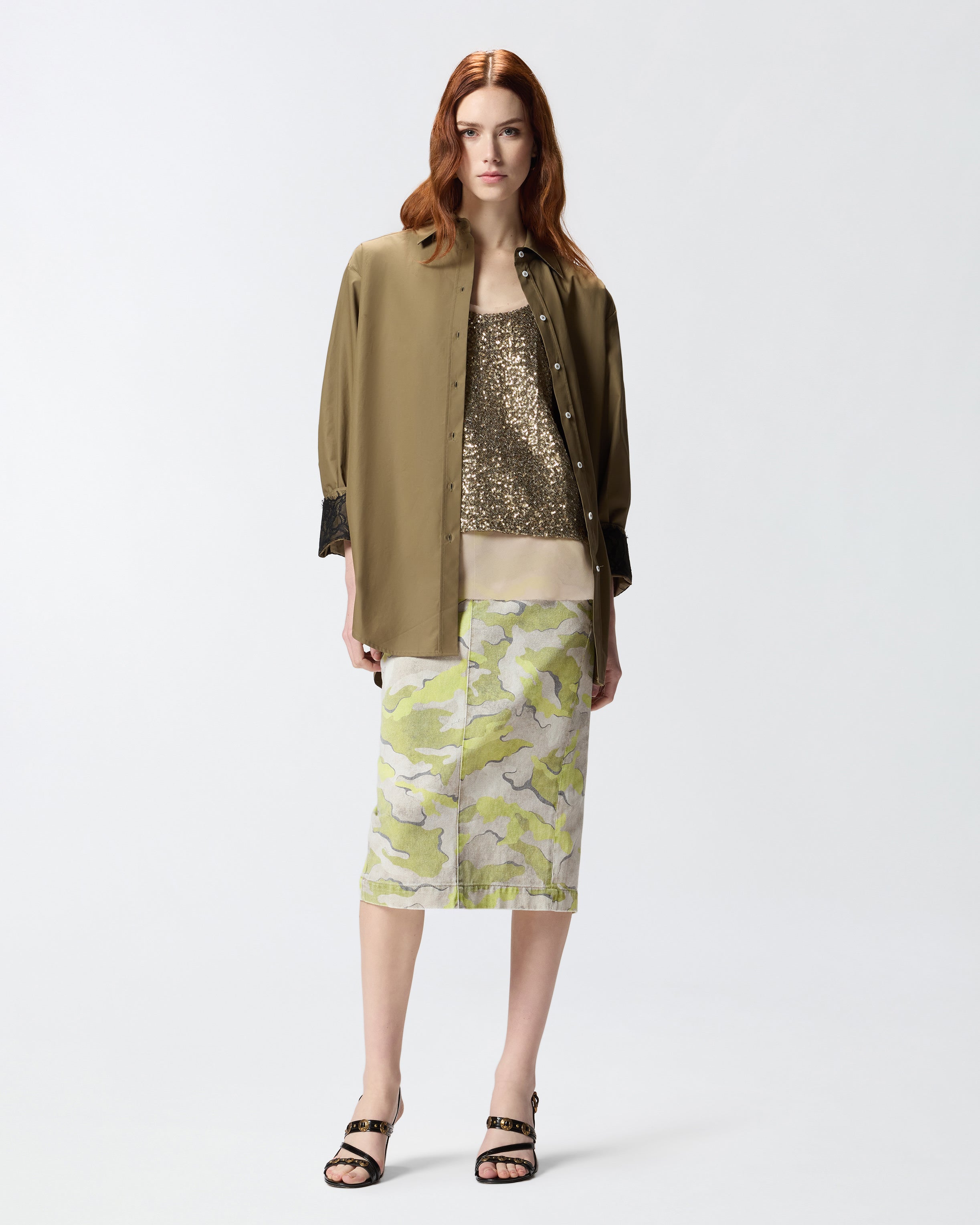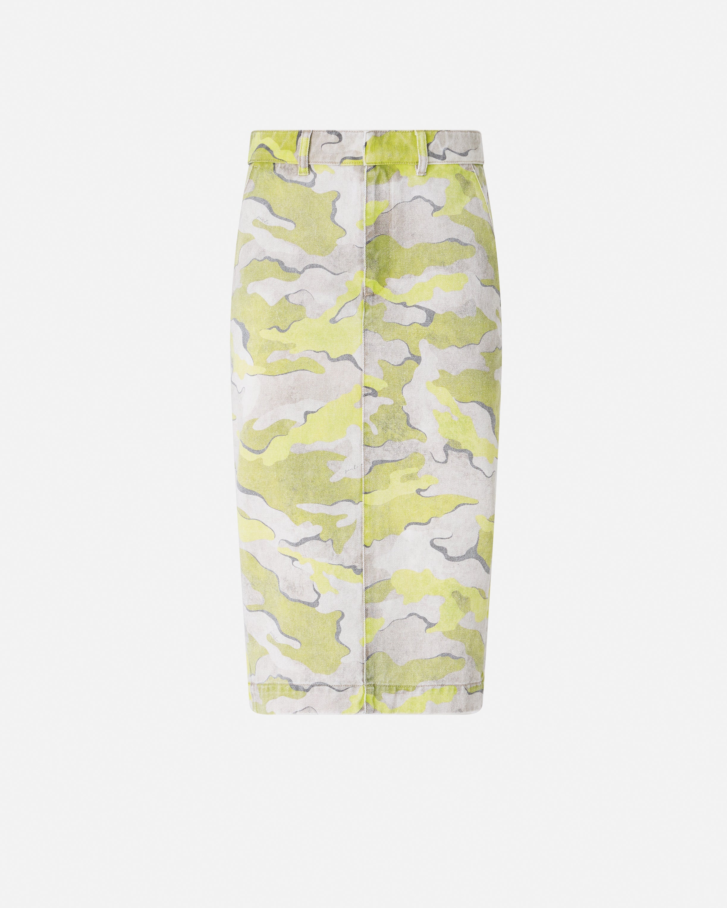 Straight-cut, slim-fit calf-length skirt with concealed front fastening, slanted side pockets, one buttoned rear welt pocket and a central slit at the back. This cotton bull pair stands out for its modern, urban-style camouflage pattern all over and is complete with loops at the waist that allow you to customise the look your way by adding your favourite belt. - TINAIA SKIRT
