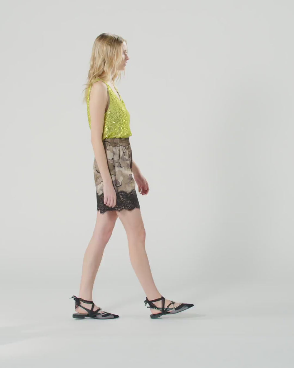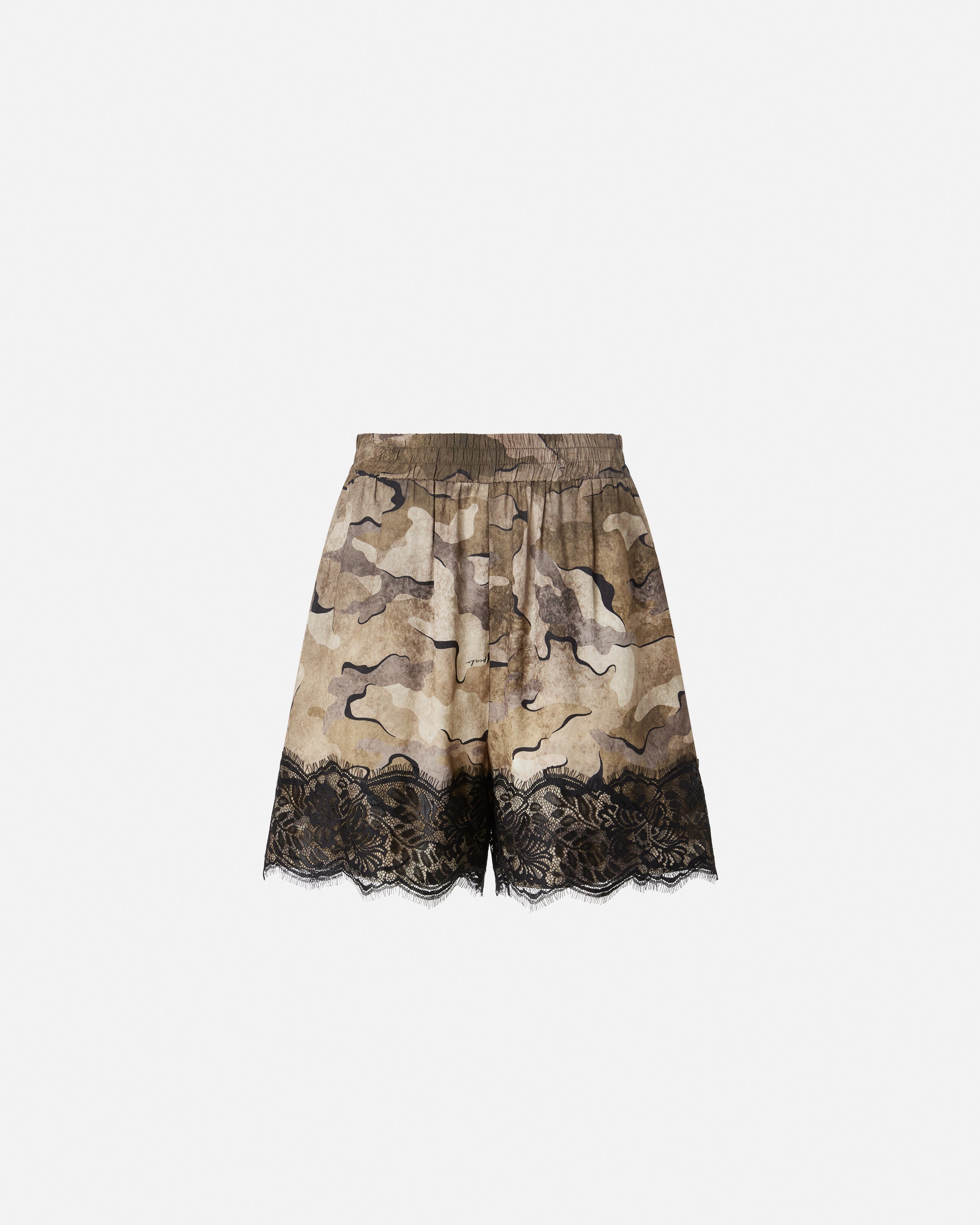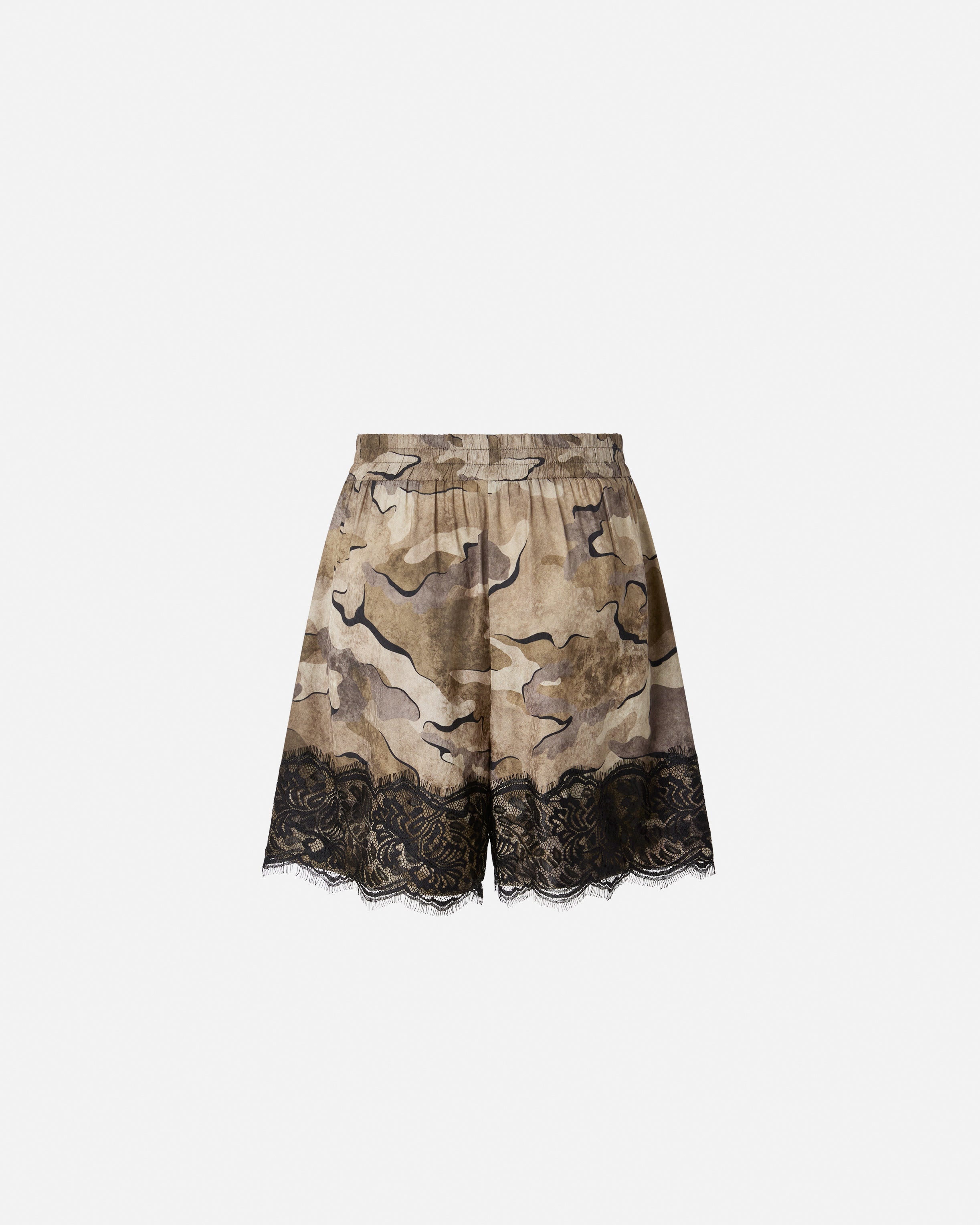Fluid-fit shorts with convenient side pockets and elasticated waist, made from lightweight satin jacquard fabric with all-over camouflage print that lends a military-chic touch. Perfect as part of a bold evening outfit, this model, which pairs perfectly with its matching top, is embellished with a lingerie-inspired lace trim on the lower hem, with a raw-cut edge that has a slightly frayed effect.
