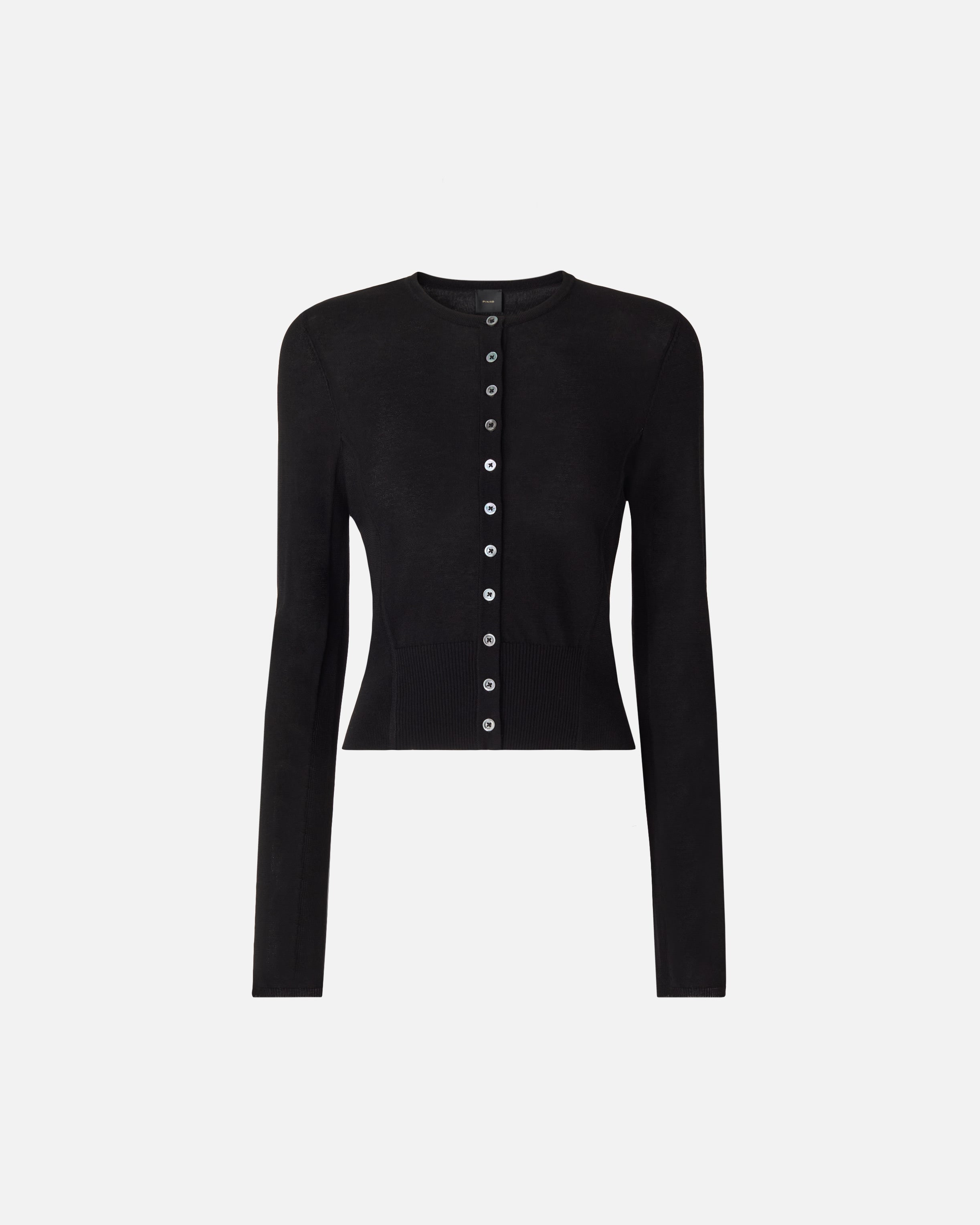Cardigan in ultra-cool cotton and viscose knit fabric, featuring ribbing at the bottom and along the armholes. The fastening with small mother-of-pearl buttons provides subtle elegance perfect for everyday use, while the final touch is given by the label with PINKO logo lettering on the back.