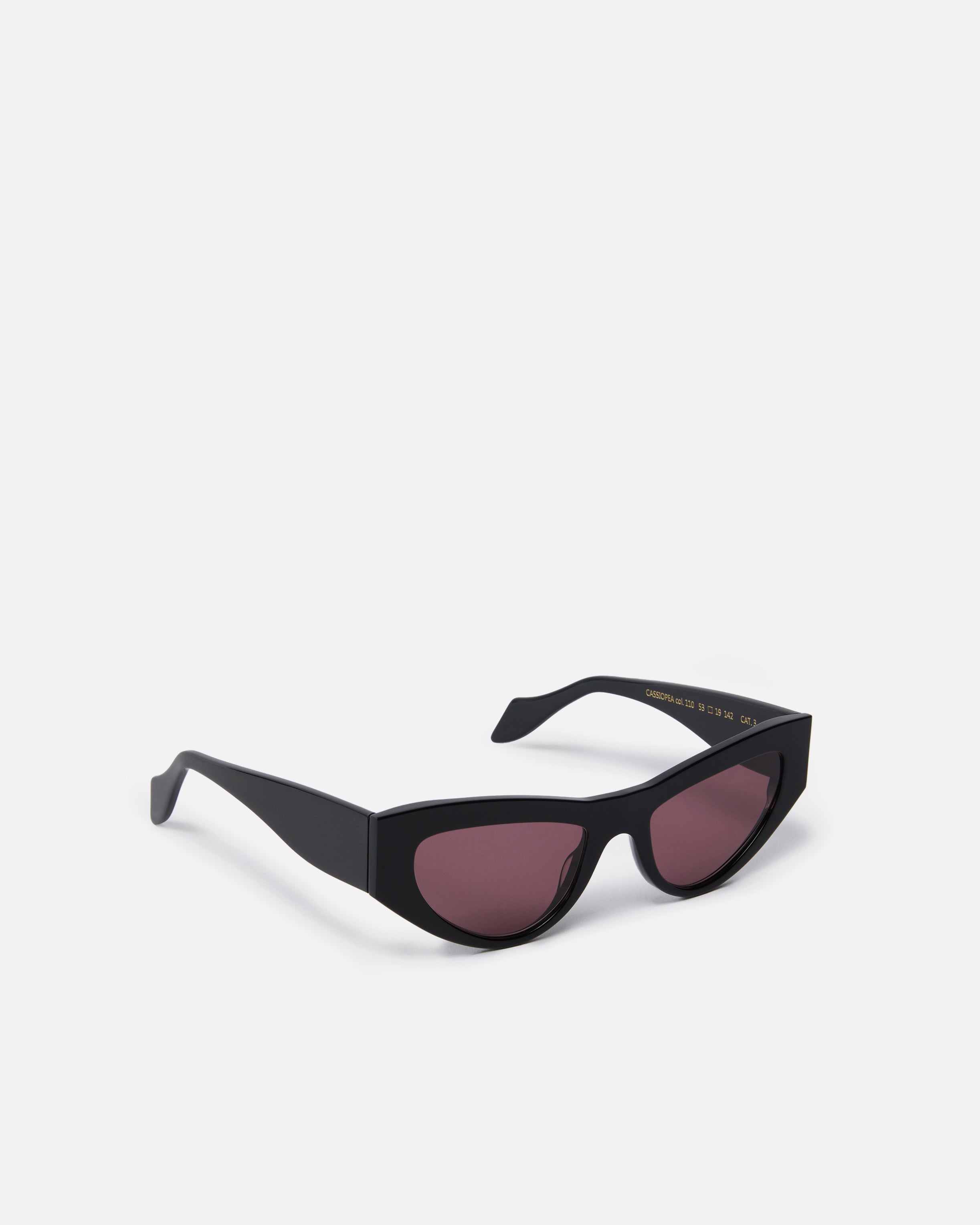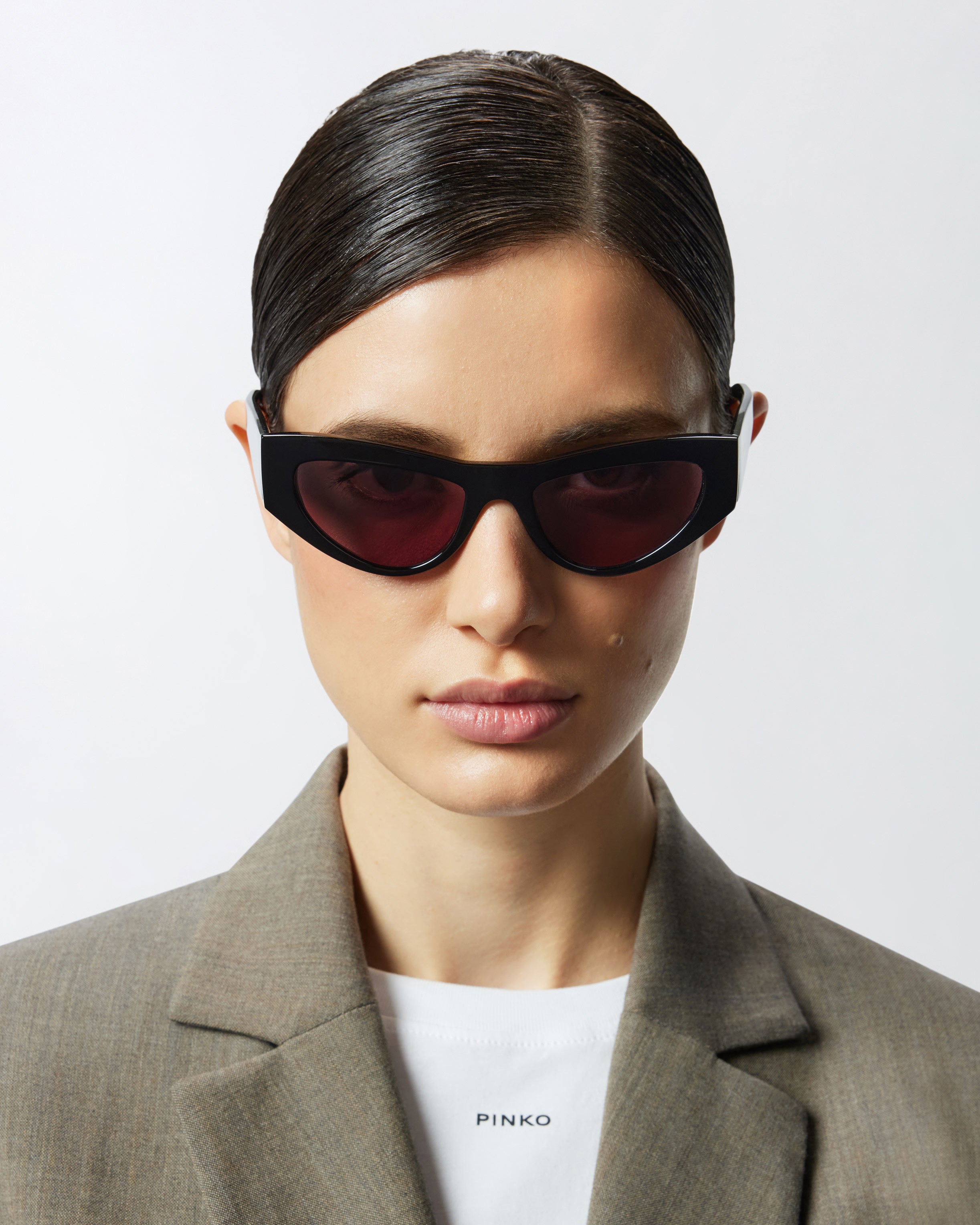Sunglasses with elongated cat-eye shape, made from lightweight cellulose acetate and customised with the PINKO logo on the side of the temples. These sunglasses combine the elegant and somewhat retro style of cat-eye lenses with a bold, slightly oversized frame. From designing the model to creating the finished glasses, this capsule collection is produced entirely in Italy. Even the small parts, such as front hinges, temple cores and screws, are all purchased from Italian companies.
