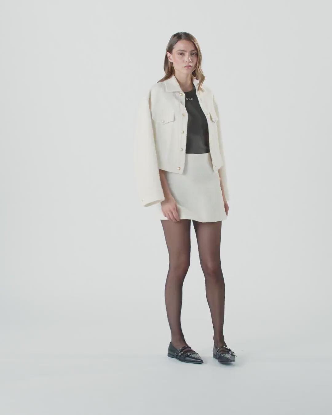 A-line miniskirt made from cotton and wool-blend bouclé fabric. The piece features a straight hem, a darted back to improve the fit and a wrap fastening embellished with three metal buttons decorated with stars. Perfect paired with the trucker jacket in the same material or with a fitted top.
