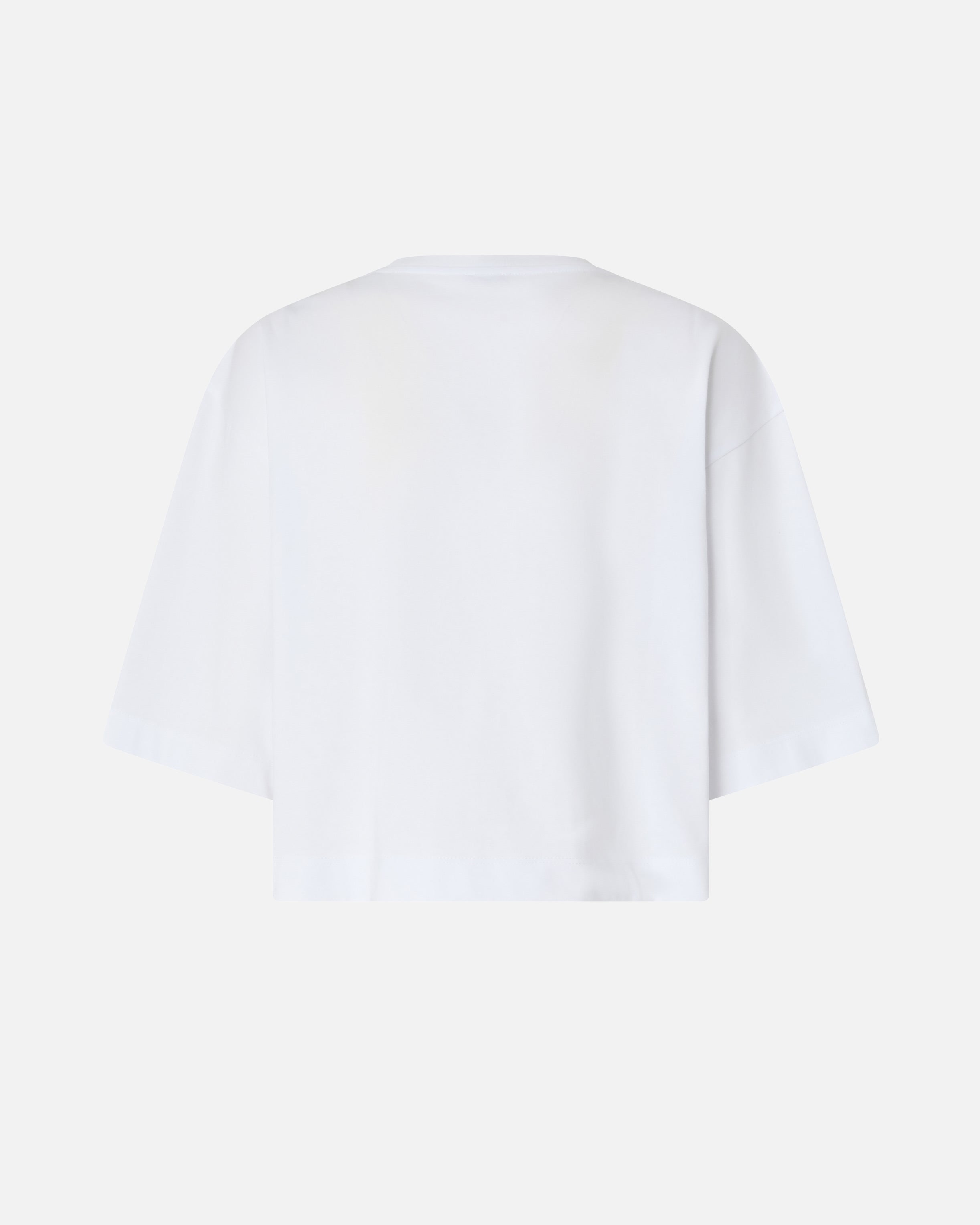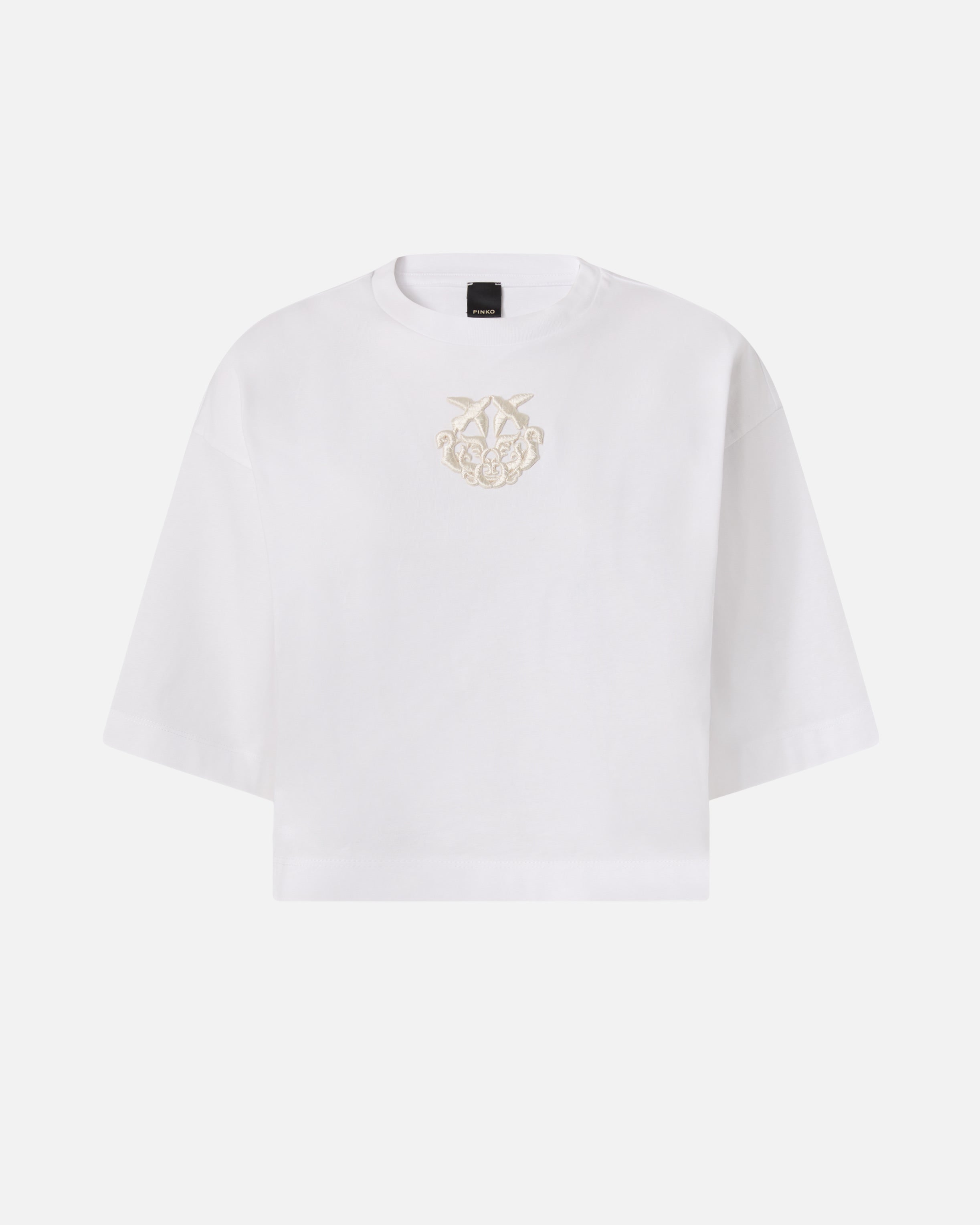 Cropped crew-neck T-shirt in cool, soft stretch cotton jersey. The garment features wide short-sleeves with dropped shoulders, and contrasting embroidery on the chest with the Texan-style Love Birds logo. Practical, original and with unique style: this style is destined to become a real go-to piece.