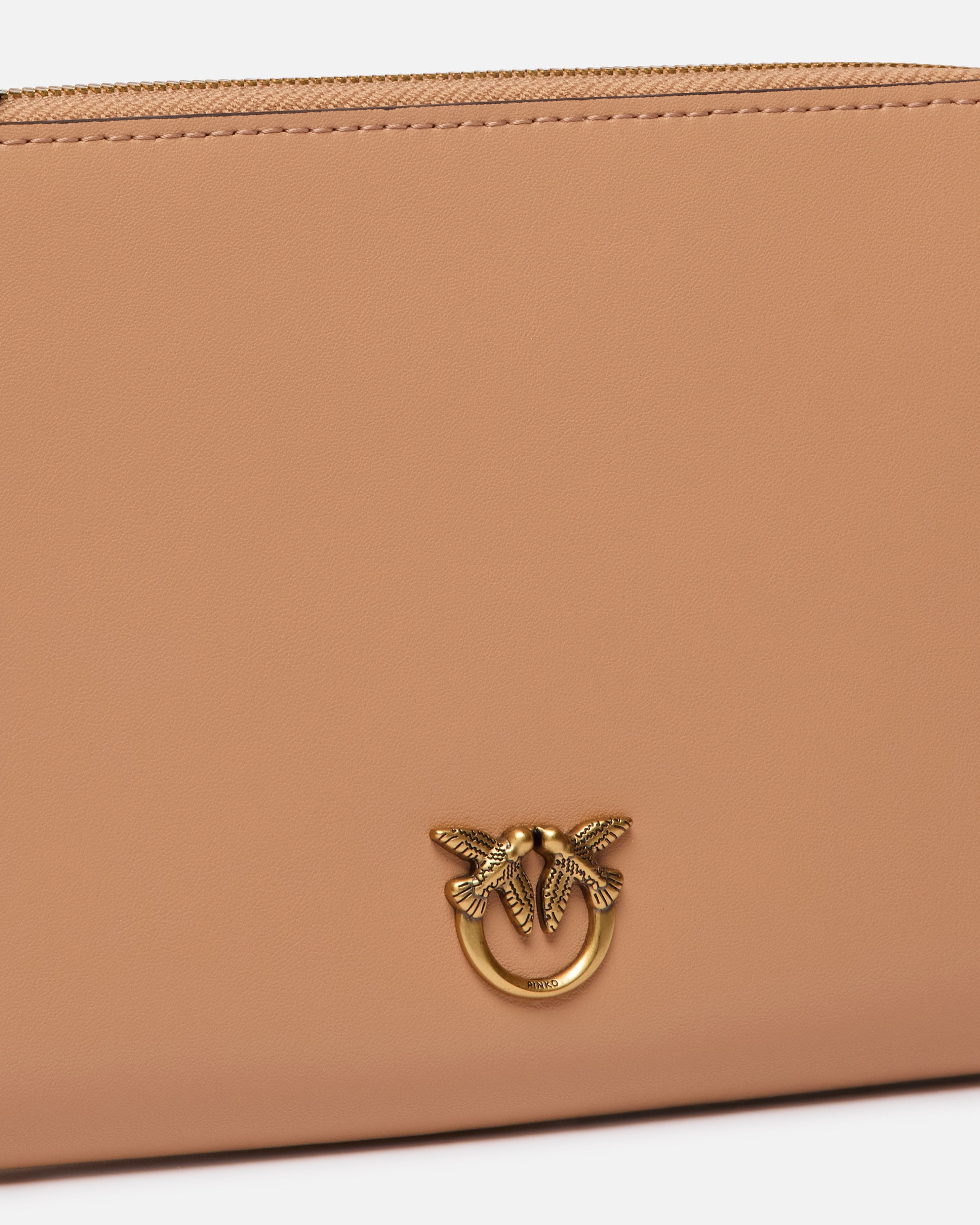 Flat, elongated crossbody bag in soft, silky leather. Customised with antique gold-electroplated Love Birds Diamond Cut plaque. Lined with polycotton and complete with thin chain shoulder strap. Zip fastening. Activate your PINKO bag: verify the authenticity of your product and access a personalised experience by scanning the Love Birds embroidery on the back of the bag with your smartphone!