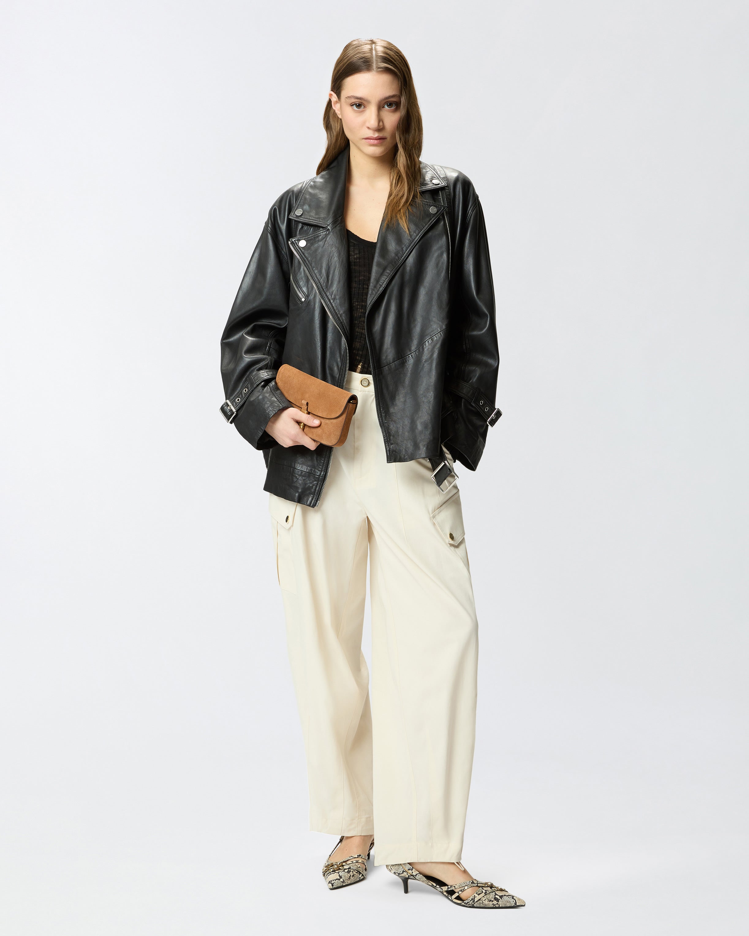 Biker-style jacket with buttoned wide lapels, a strap with buckle on the cuffs, slanted side pockets, off-centre zip fastening at the front and a zipped chest pocket. This piece is available in a leather version with an eye-catching distressed effect, obtained through a special dyeing and finishing process, and features a belt with buckle at the bottom that you can wear open or fastened for a bespoke fit. This outerwear jacket offers a fresh, modern take on the classic leather biker jacket, with a slightly more relaxed and less structured fit, making it ideal to pair with everyday looks and elevate them with style.