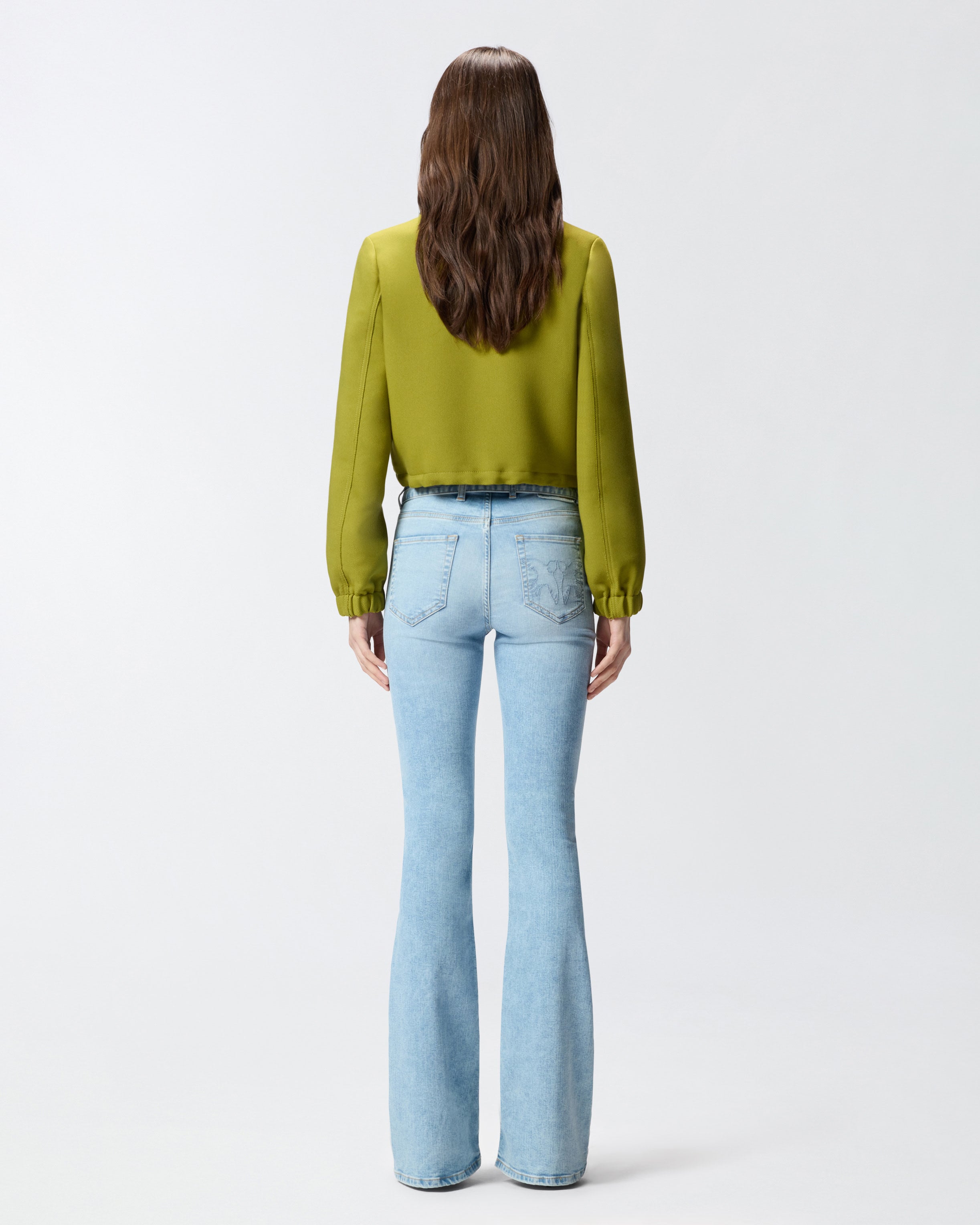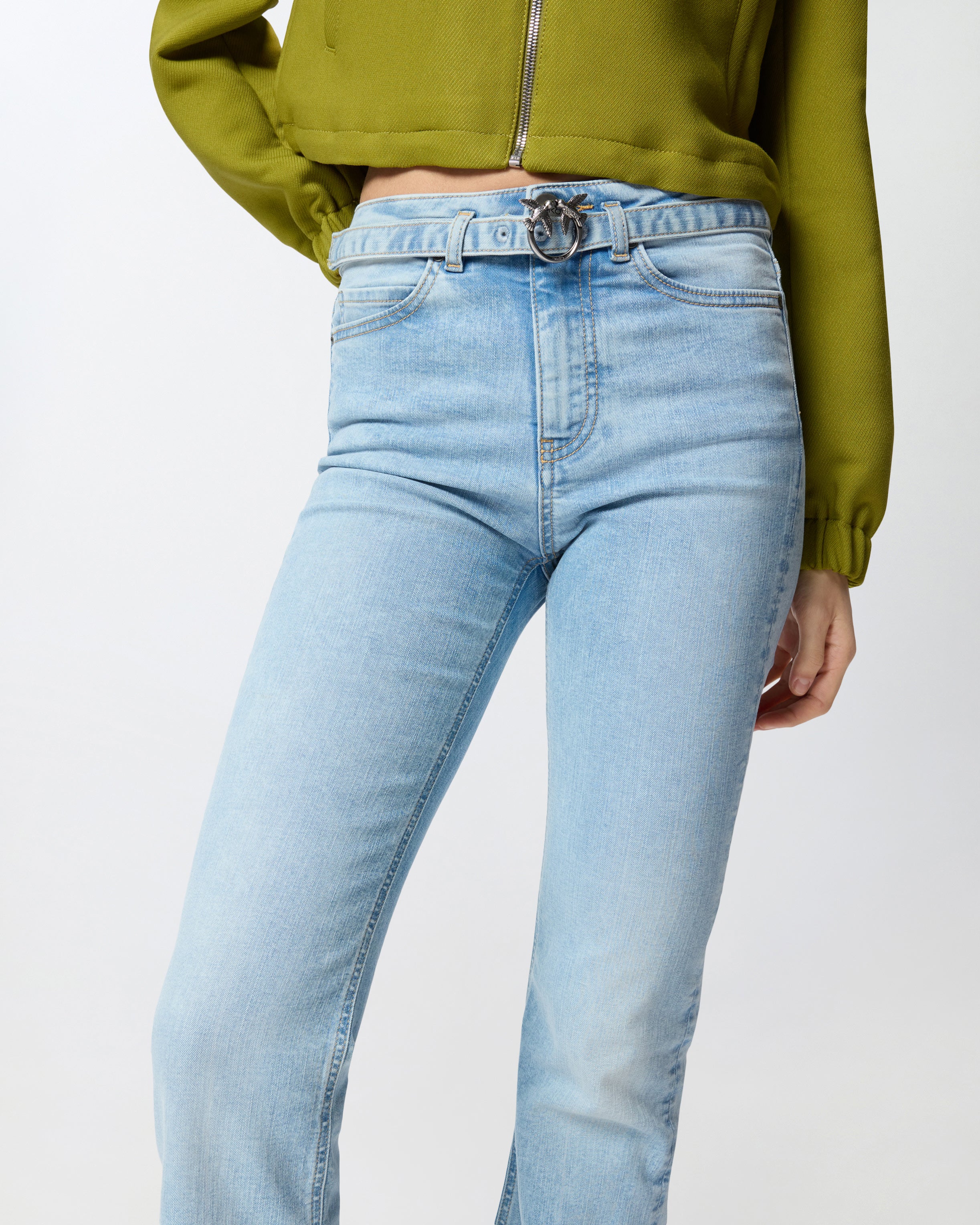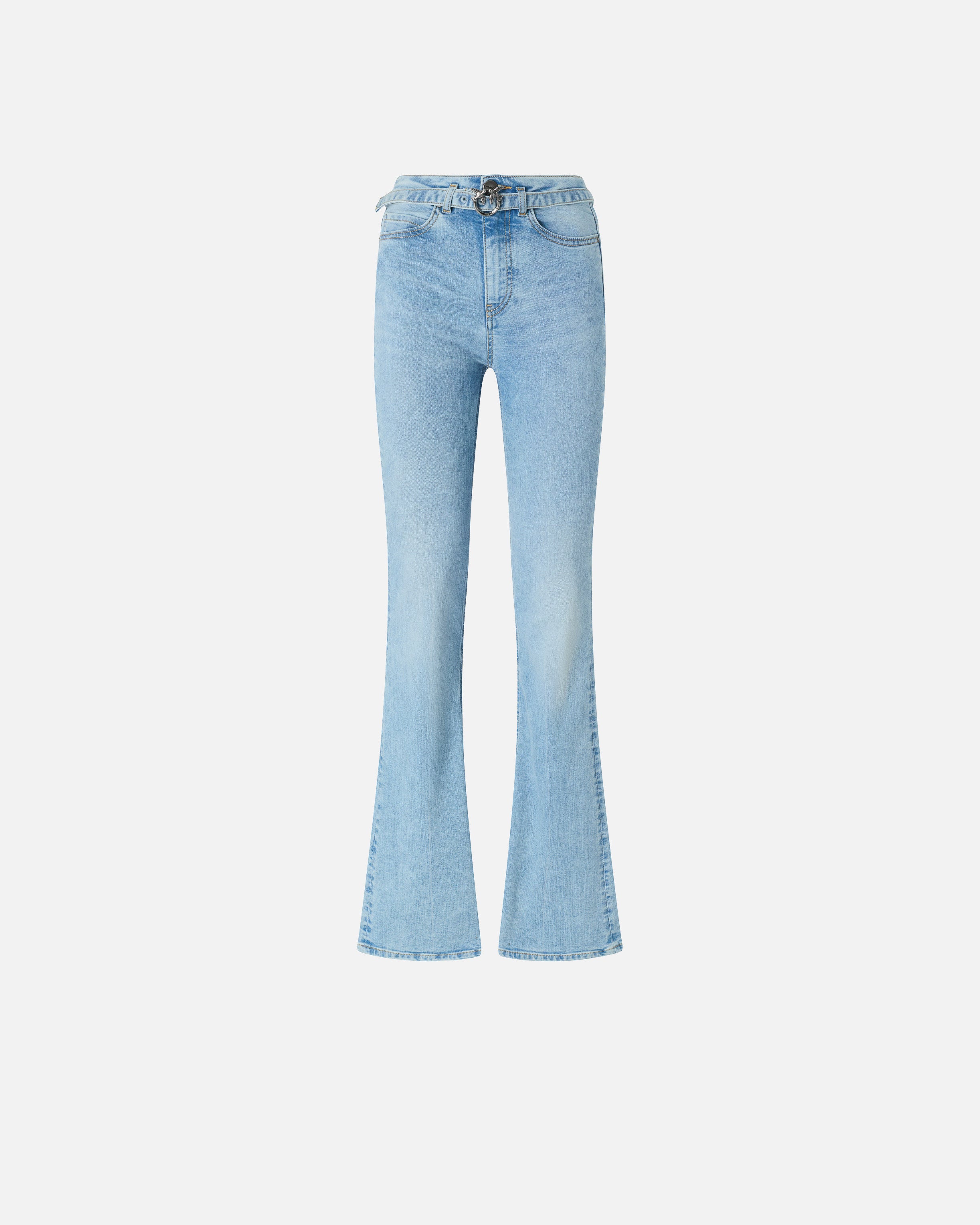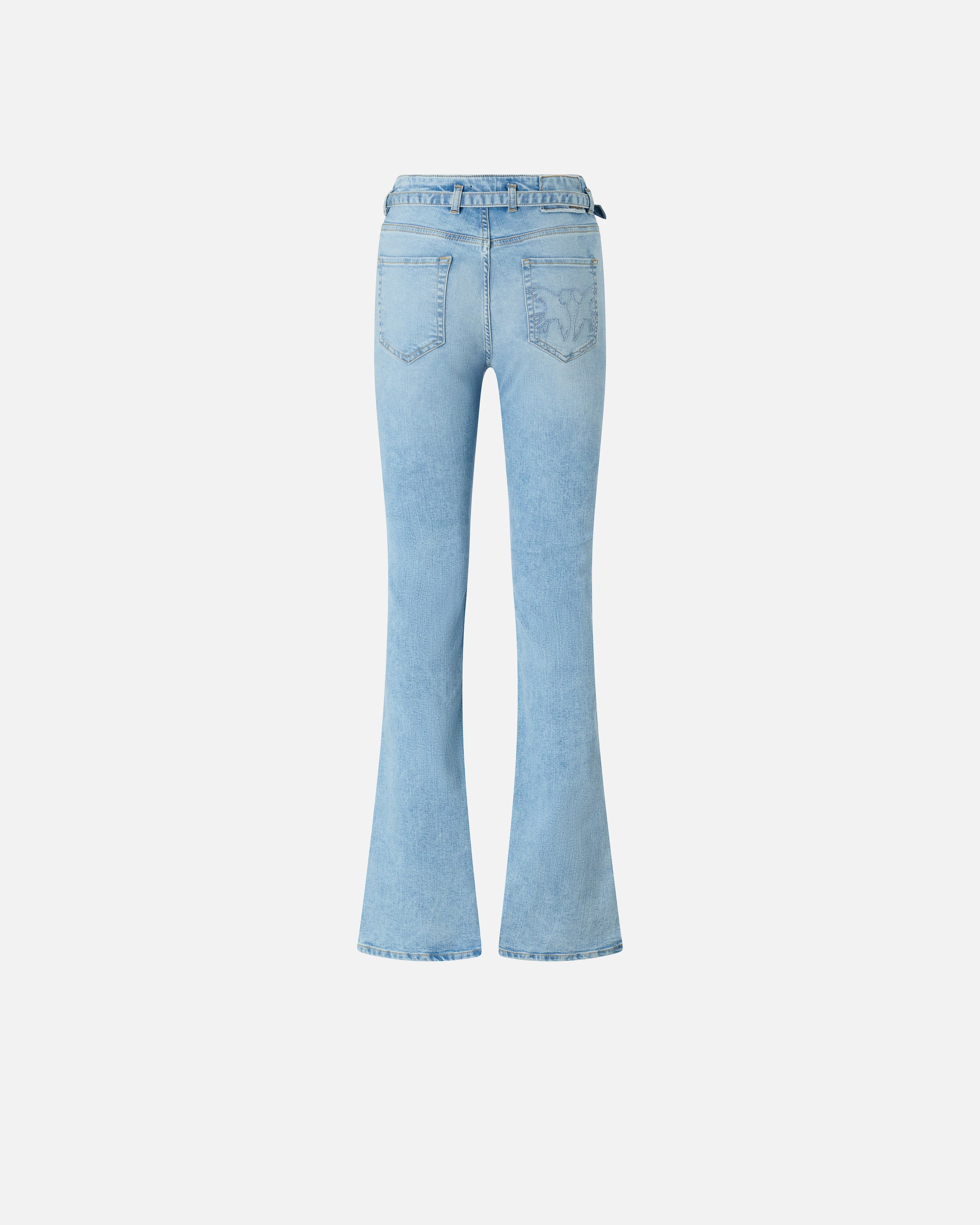 Flared five-pocket jeans with legs that are slim-fitting down to the knee and flared at the bottom, made from cotton-blend power stretch denim with soft feel and light wash. The brand's logo lettering embroidered on the back of the waistband and the Love Birds logo with embroidered birds on the right back pocket add pure PINKO style to the design. Complete with a matching-fabric belt with the metal Love Birds Diamond Cut buckle. - FLORA FLARE
