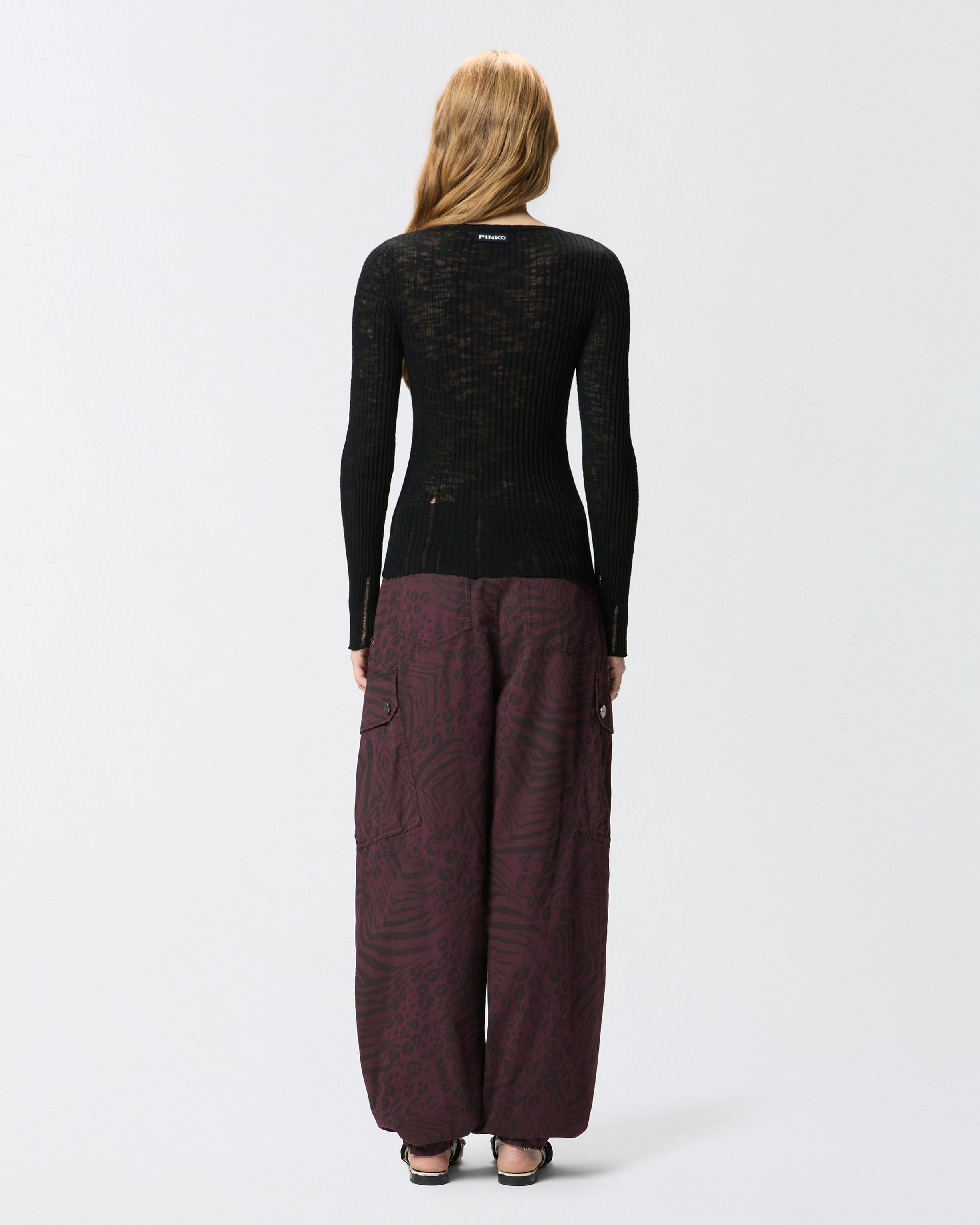 Long-sleeved sweater with wide crew neck and granddad button placket. Made from a lightweight jacquard fabric in a slub cotton blend with tears, the style features a ribbed construction that highlights the textured, uneven surface characteristic of the yarn. The final touch is given by the label with jacquard PINKO logo lettering on the back. A must-have garment with a naturally lived-in character, perfect for completing your contemporary outfits without sacrificing comfort.