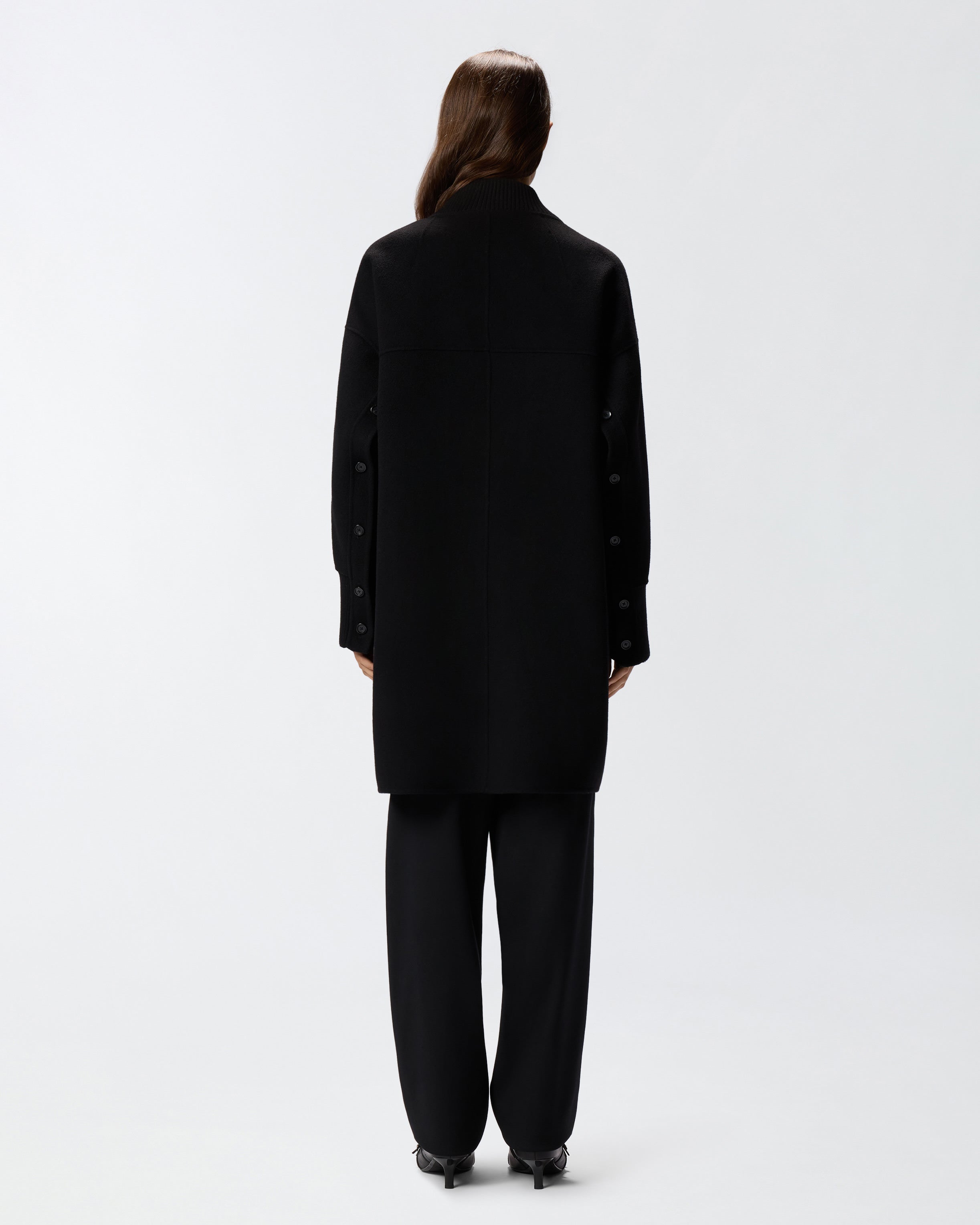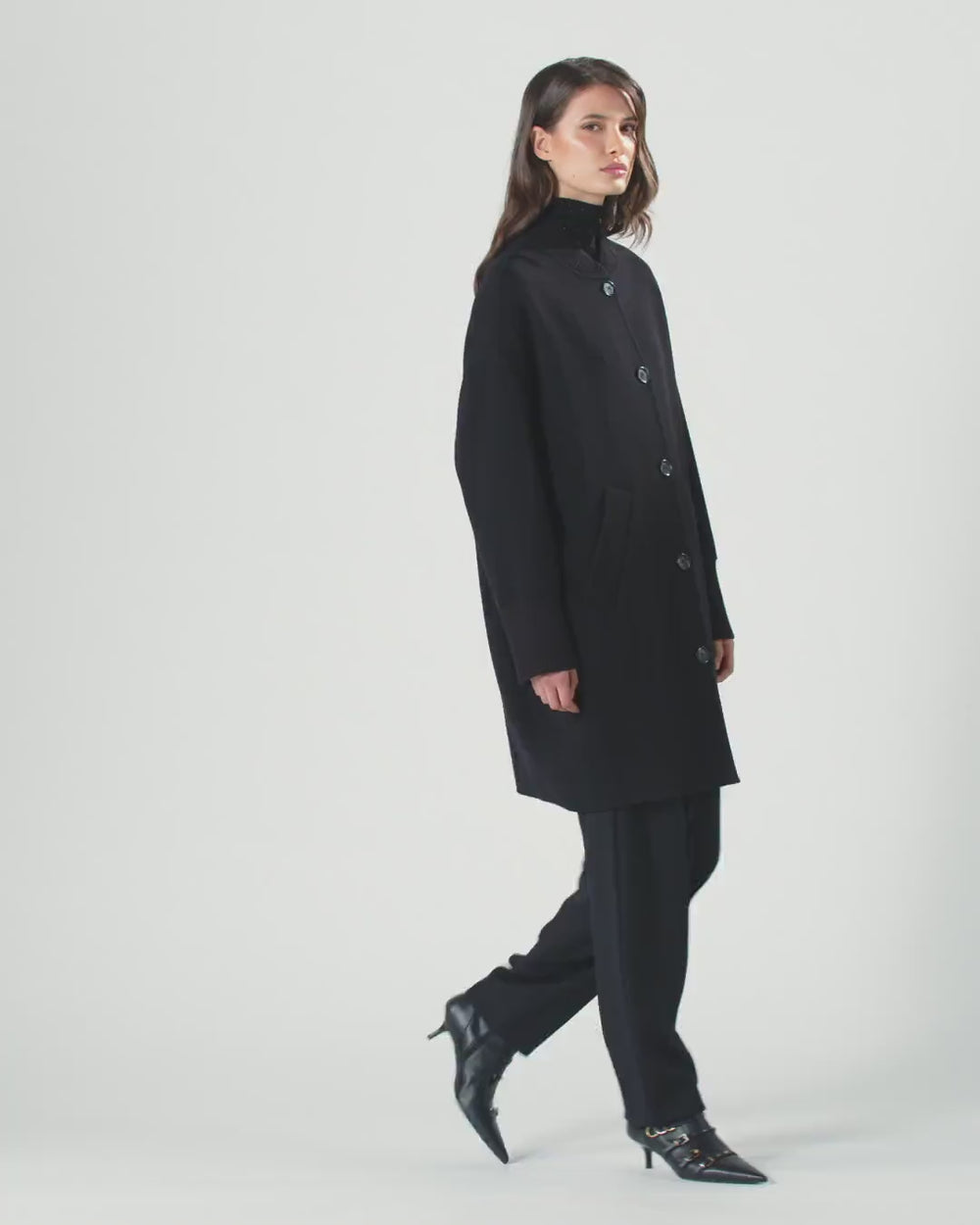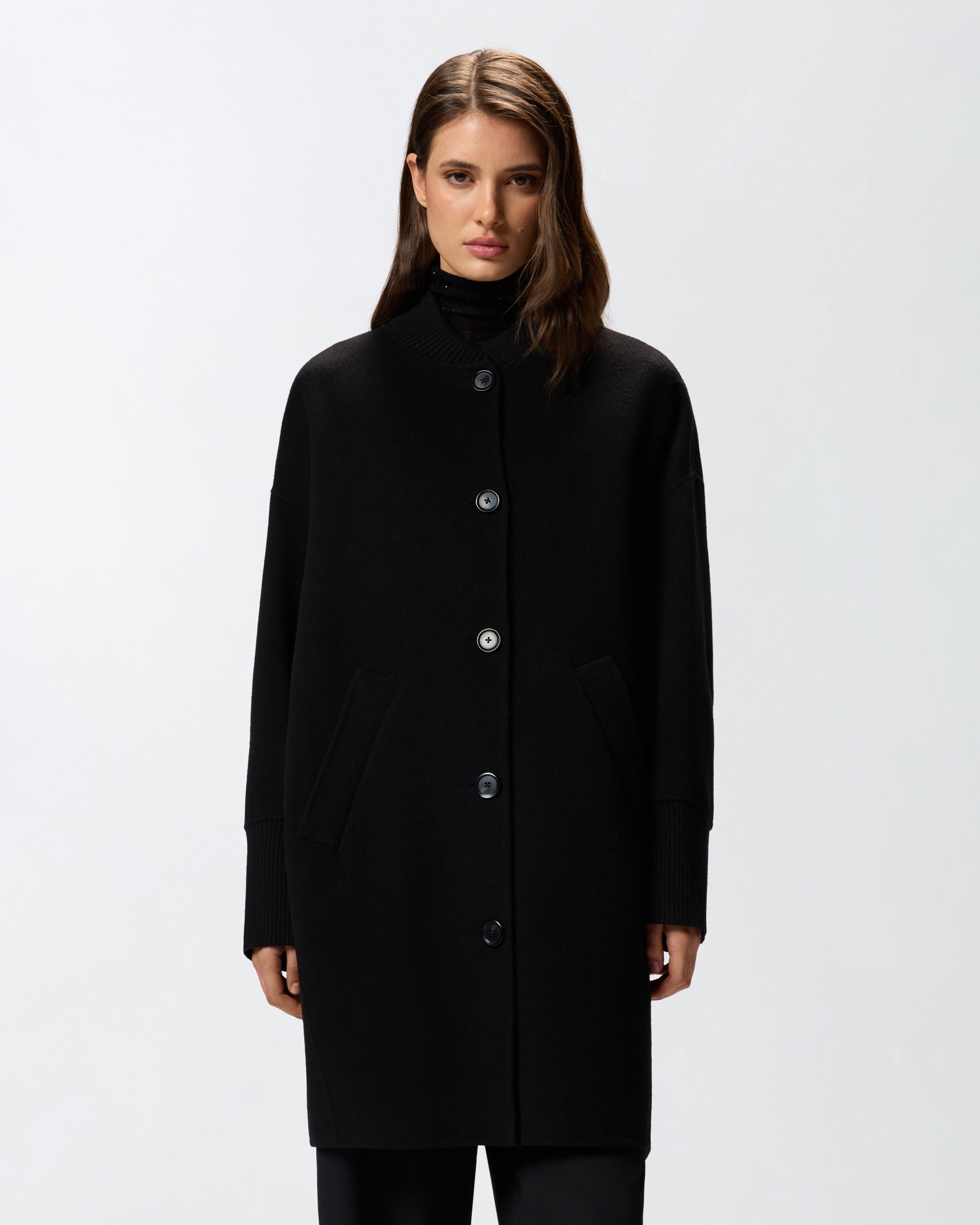 Lined and slightly rounded cocoon coat in double wool-blend cloth. This piece of outerwear is completed with slanted pockets, long sleeves with buttoned cuffs, and a rib knit on the bomber-style collar and wide cuffs. Front button fastening. No other outerwear piece will protect you from the cold in class like this single-breasted coat, the perfect blend of comfort and timeless style.