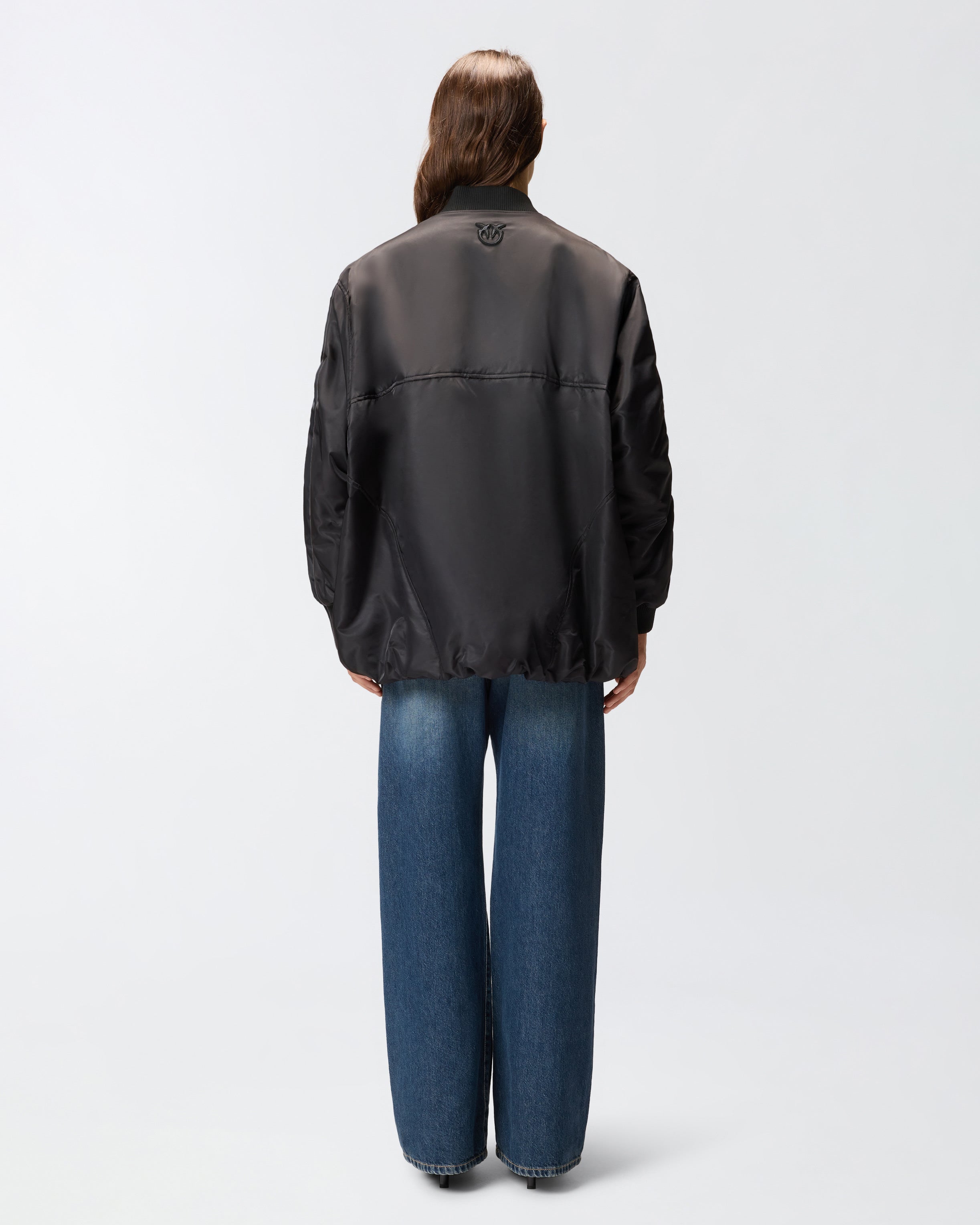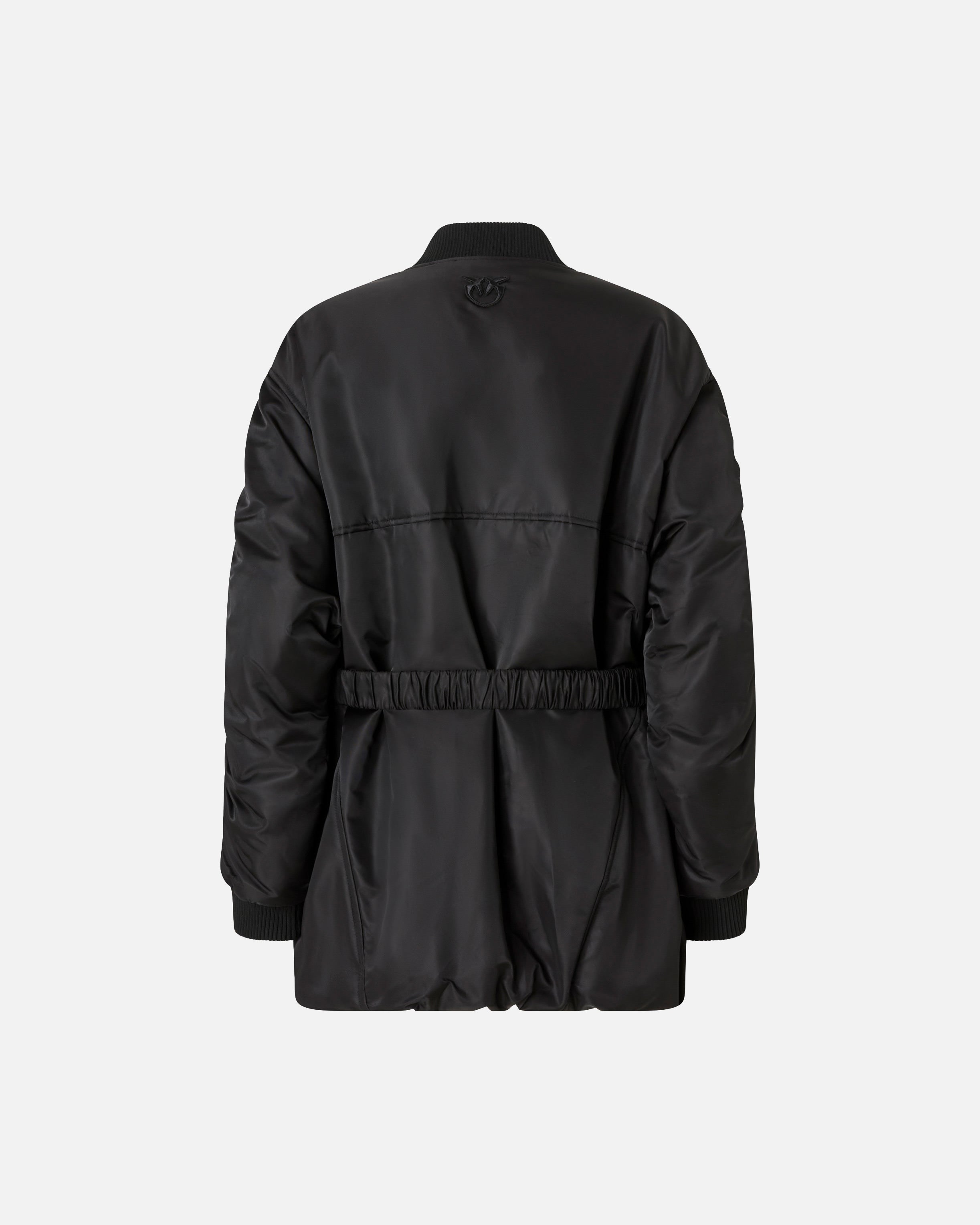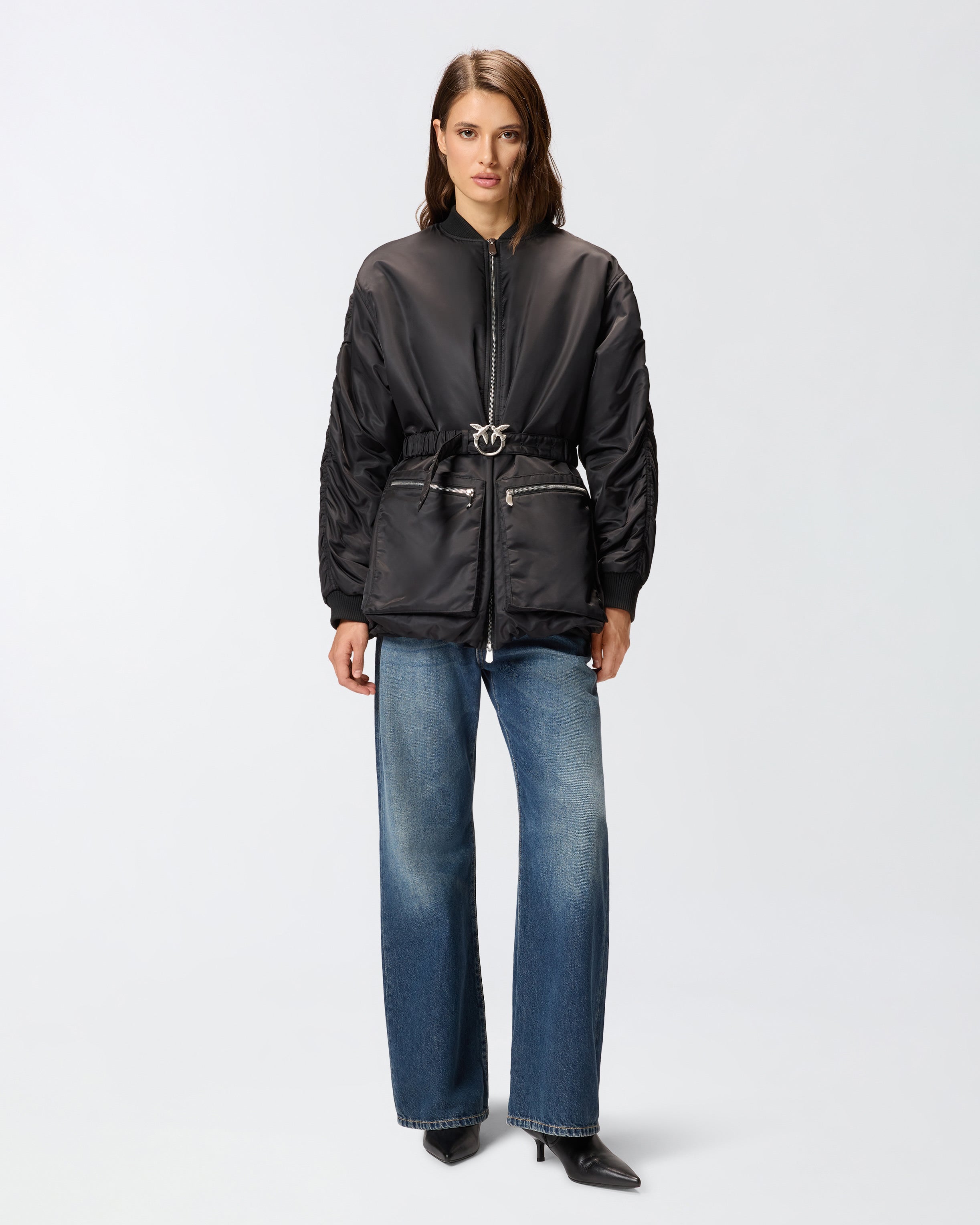 Technical satin jacket with long dropped-shoulder sleeves and utility-style maxi-pockets with zip on the front. The model features typical bomber details, such as the classic rib-knit collar and cuffs, but also flaunts more original accents, such as the elongated silhouette and gathered sleeves. Detachable waist belt embellished with the iconic Love Birds Diamond Cut buckle. Two-way zip fastening on the front. For extra comfort when worn, this bomber jacket is lined with contrasting fabric.