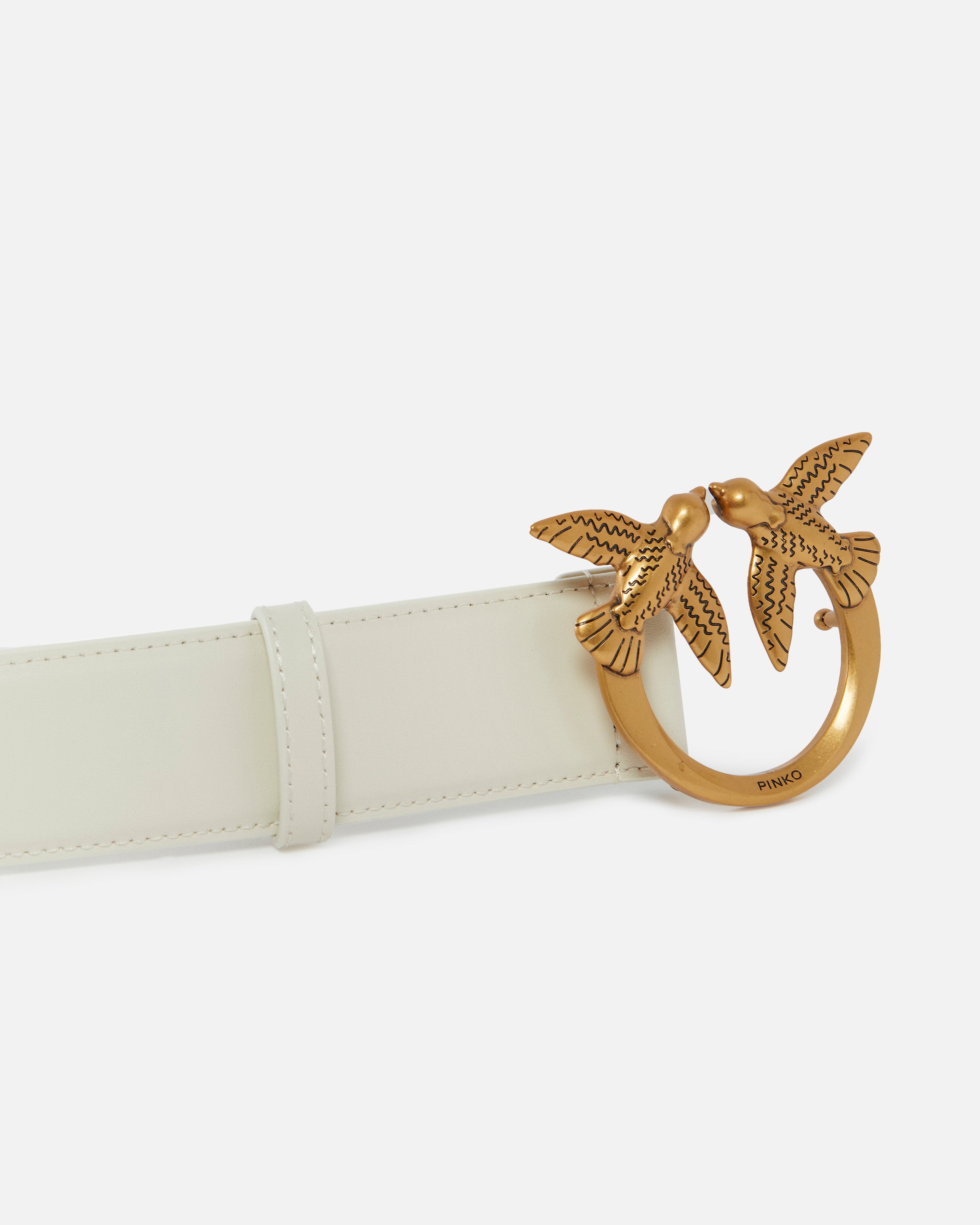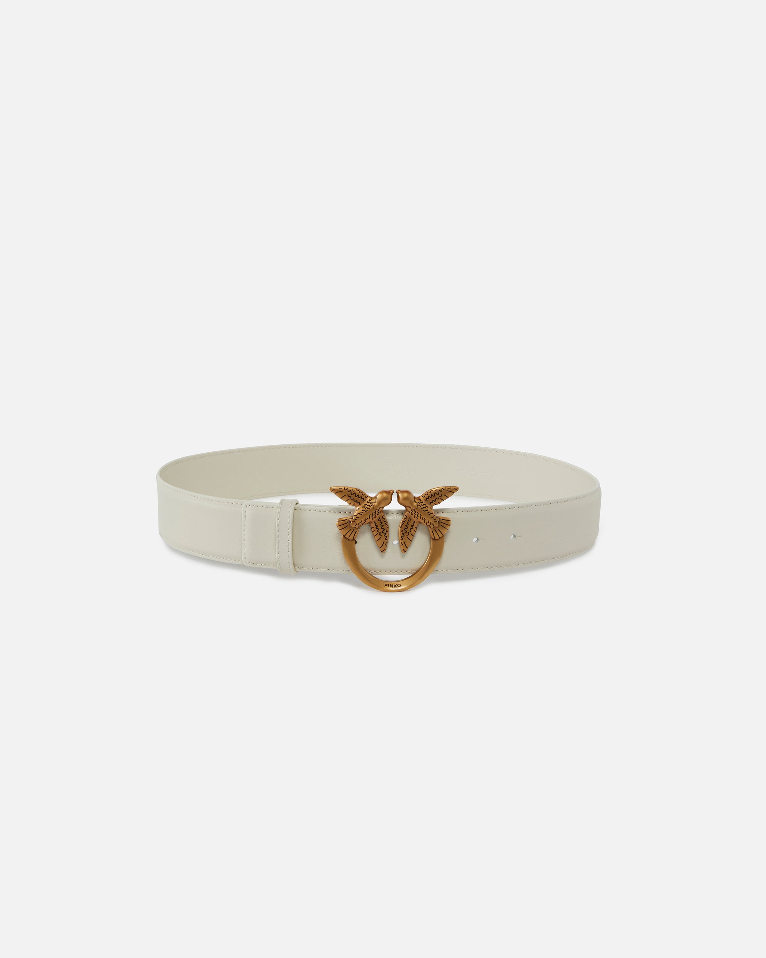 High-waist belt in soft, silky leather with metal Love Birds Diamond Cut buckle.