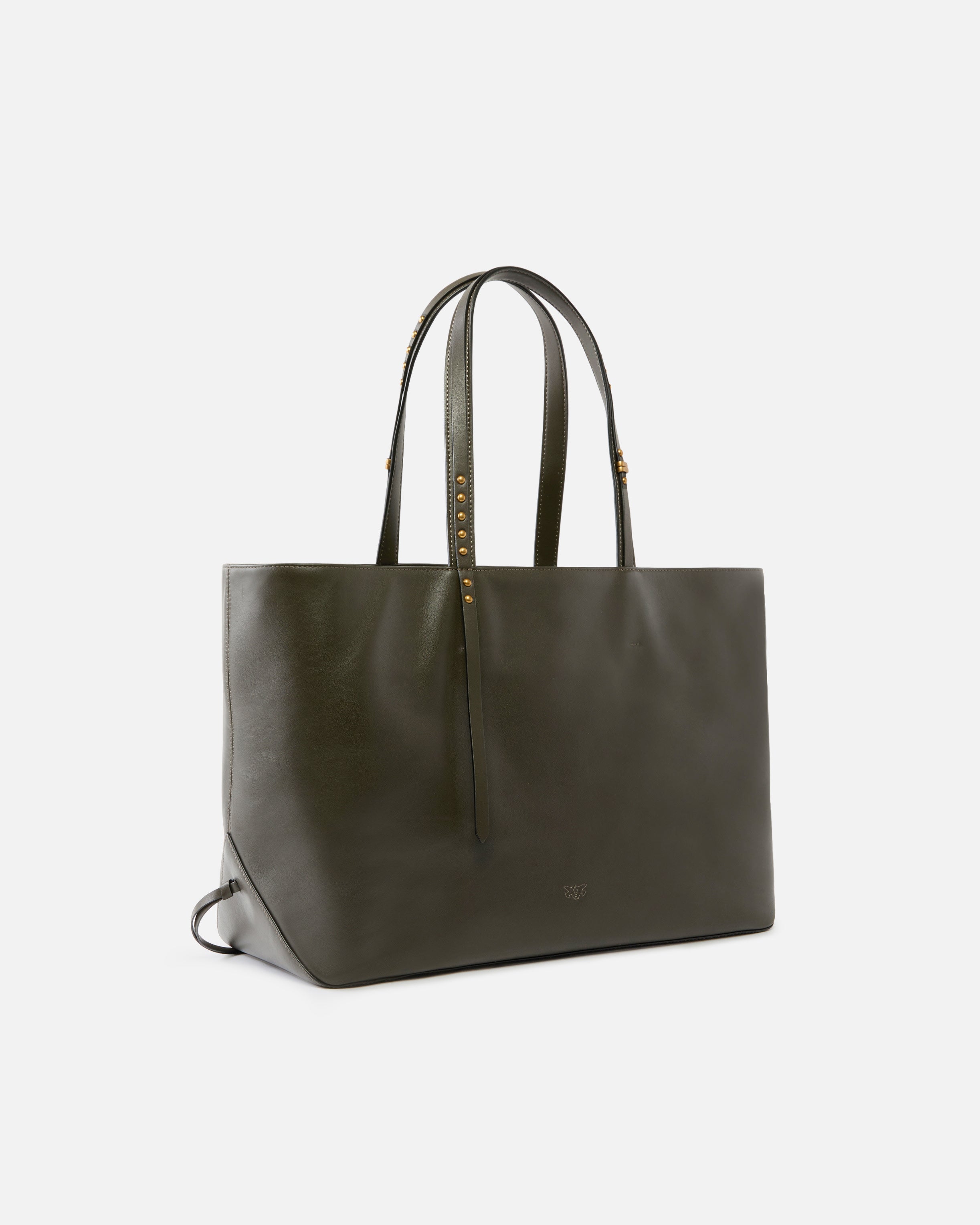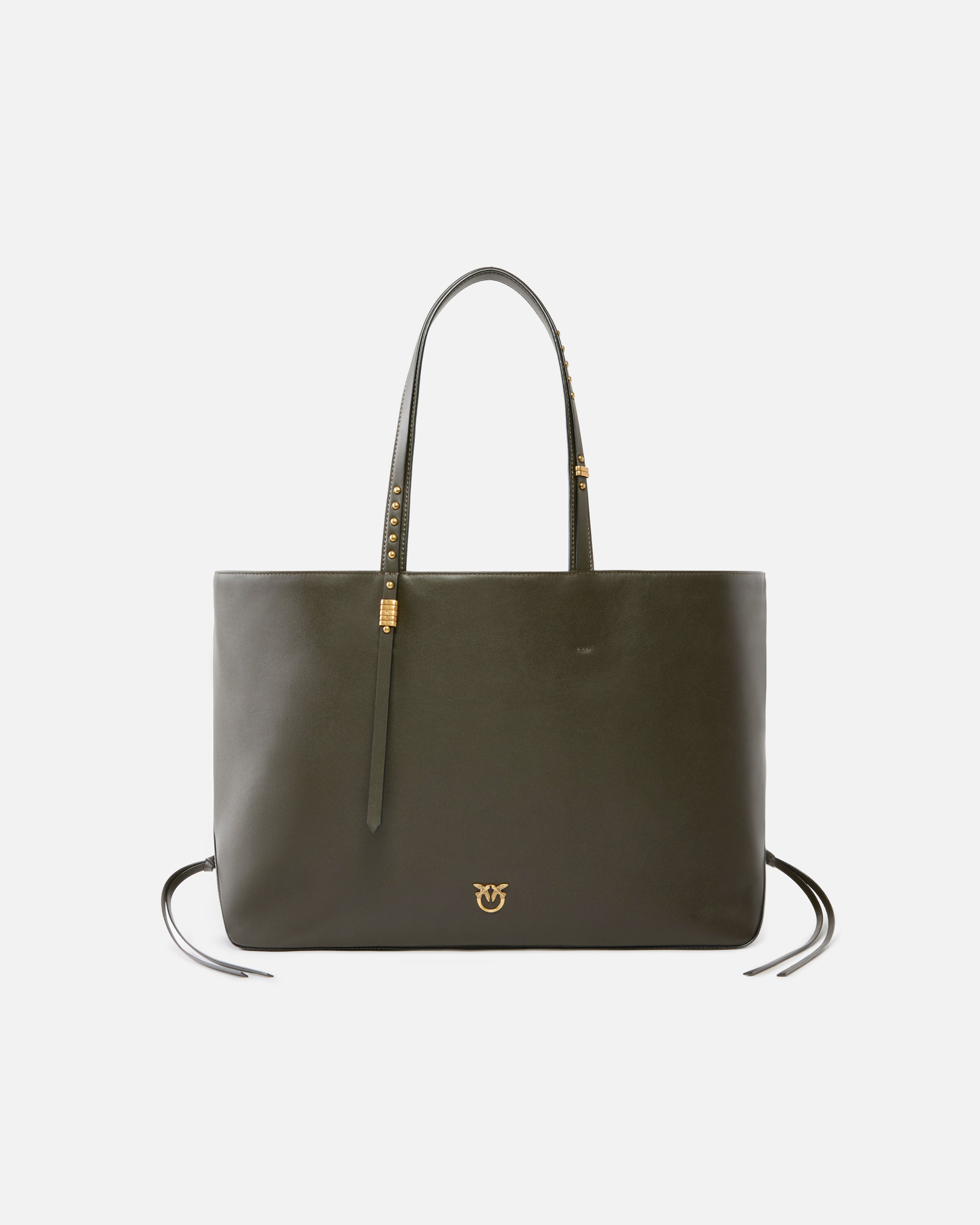 Medium-sized shopper bag with an elongated shape, made from soft leather and customised with metal decorative elements along the upper handles: a series of small round studs and rings arranged to form the PINKO logo lettering. Designed for comfortable shoulder wear thanks to its two handles, the style is enhanced by side straps at the bottom and a small metallic detail depicting the iconic Love Birds Diamond Cut logo on the front. This accessory, perfect for carrying your essentials with you throughout the day, is the solution you've been looking for to give your outfits a touch of elegance without sacrificing functionality. Activate your PINKO bag: verify the authenticity of your product and access a personalised experience by scanning the Love Birds embroidery on the back of the bag with your smartphone! - CABAS CLASSIC BAG