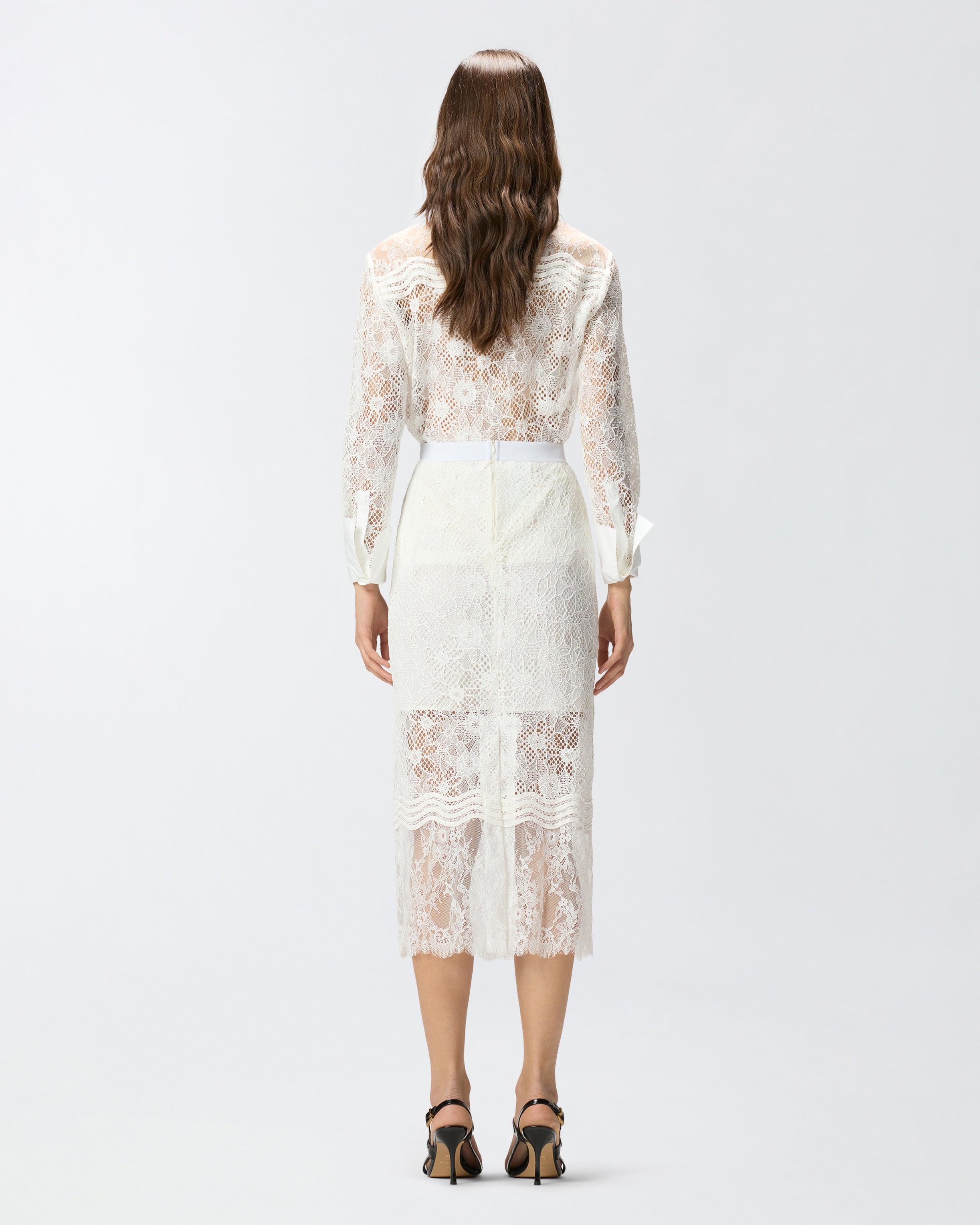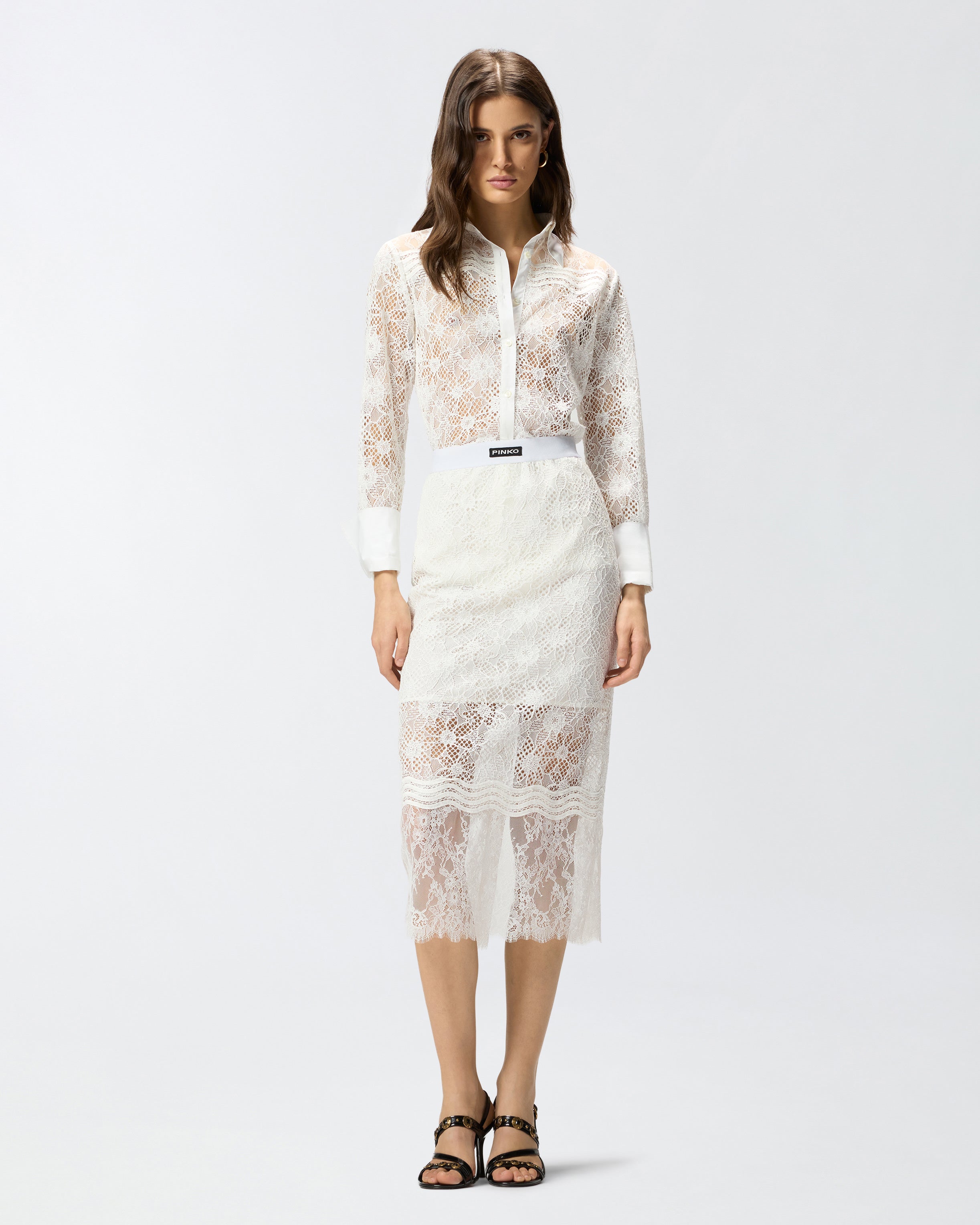 Slim-fitting midi skirt with a comfortable waistband and elegant central front and back slits, customised with a label featuring the emblematic PINKO logo lettering on the front. Featuring a rear invisible zip to make it easier to put on and a partial lining to reduce transparency, the design is entirely decorated with an intricate mix of different types of lace, each with its own distinctive character: rebrodé lace stands out for its raised, textured effect, the finer, lighter Chantilly lace finishes the trims, and the macramé lace enriches the wavy appliqués on the lower section. The result is a skirt with a three-dimensional, graphic look that still retains a hint of sheer sensuality: wear it for special occasions or evening looks with the matching shirt, or pair it with a colourful crop top for a refined contrasting effect. - HARMONIE SKIRT