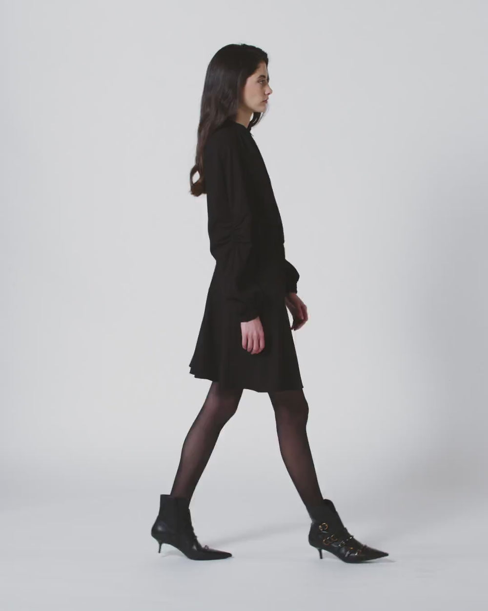 Short dress in flowing stretch technical viscose fabric with a slightly flared skirt, a Mandarin collar and long puffed sleeves that end in stretch cuffs. A comfortable trekking-inspired drawstring on the waist allows you to adjust the fit. This fitted style is more cinched on the sides. Zip fastening on the front. This dress is as elegant as it is versatile: wear it with a pair of ballet flats for a daytime look or with high heels to elevate your special-evening outfit.
