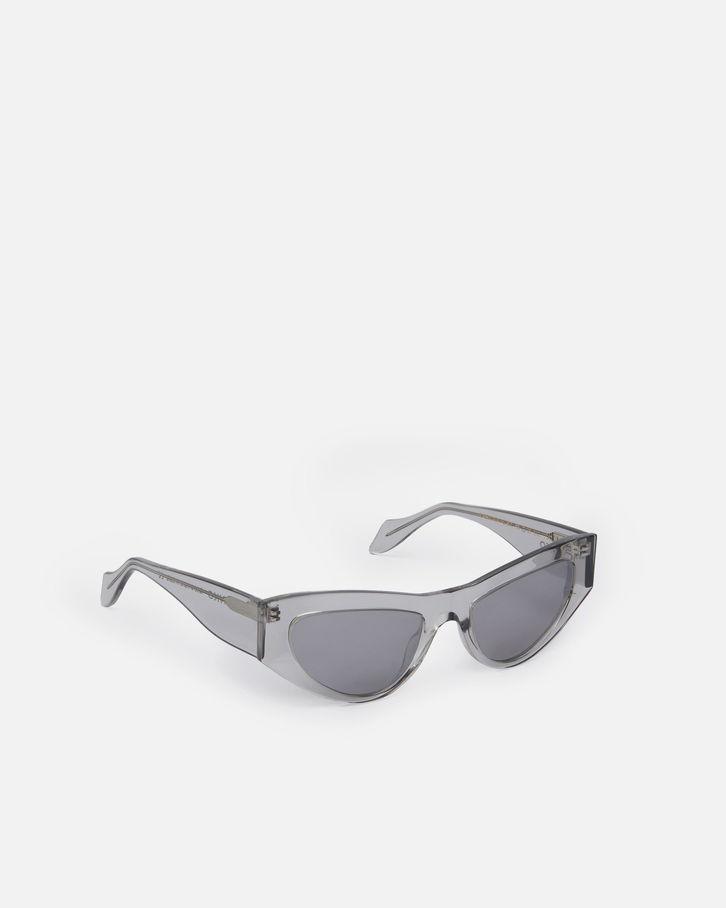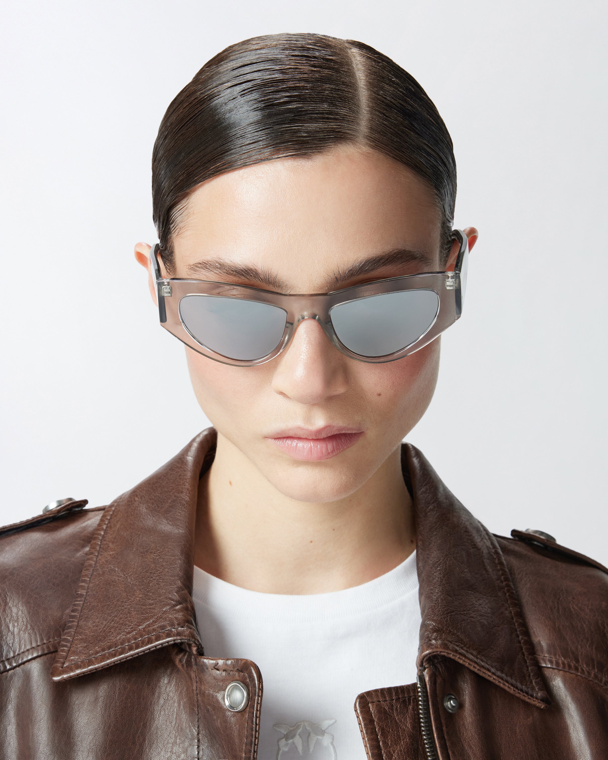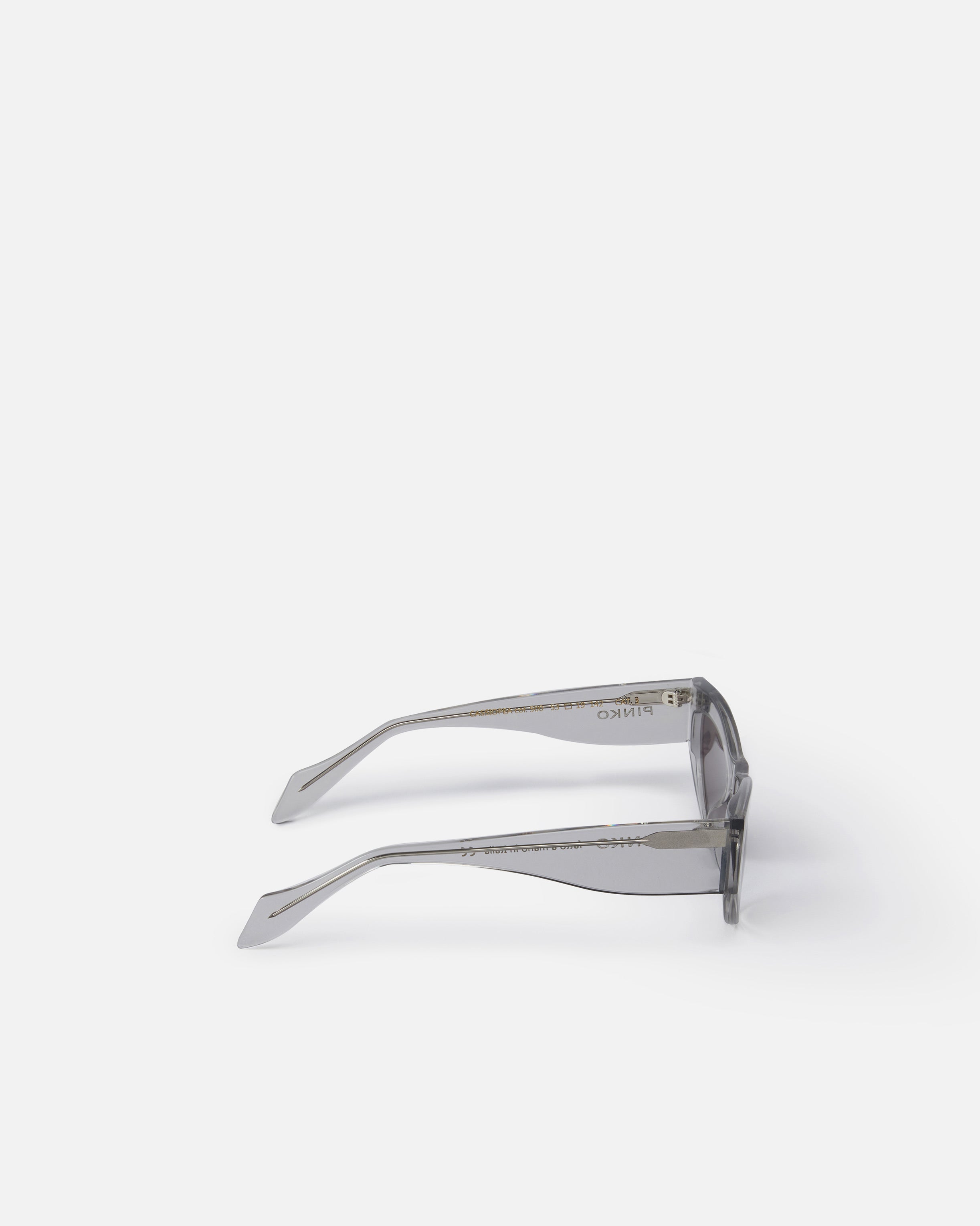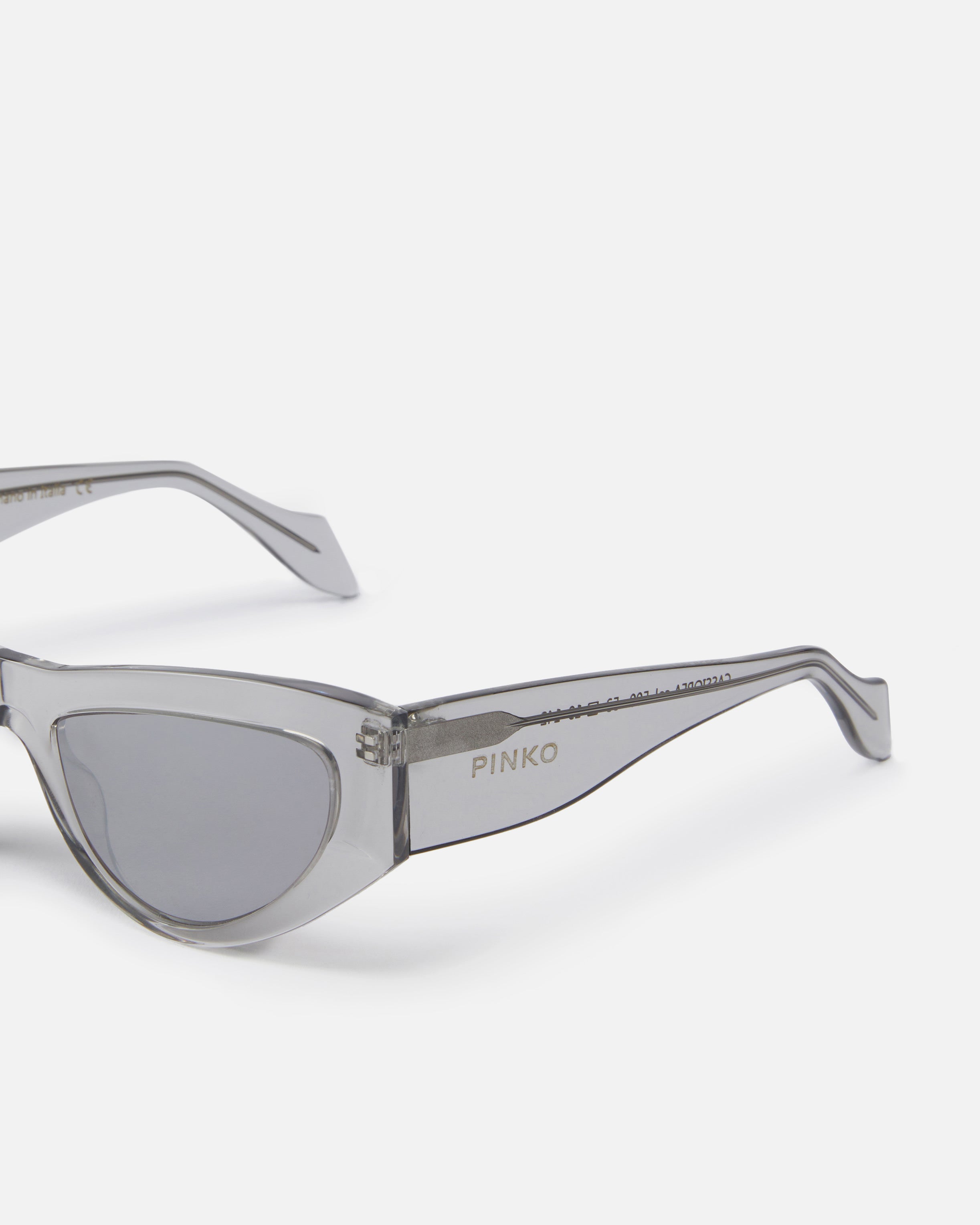 Sunglasses with elongated and pointed cat-eye shape, made from lightweight, transparent cellulose acetate and customised with the PINKO logo on the side of the temples. These sunglasses combine the elegant and somewhat retro style of cat-eye lenses with a bold, slightly oversized frame and futuristic mirror-finish lenses. From designing the model to creating the finished glasses, this capsule collection is produced entirely in Italy. Even the small parts, such as front hinges, temple cores and screws, are all purchased from Italian companies.