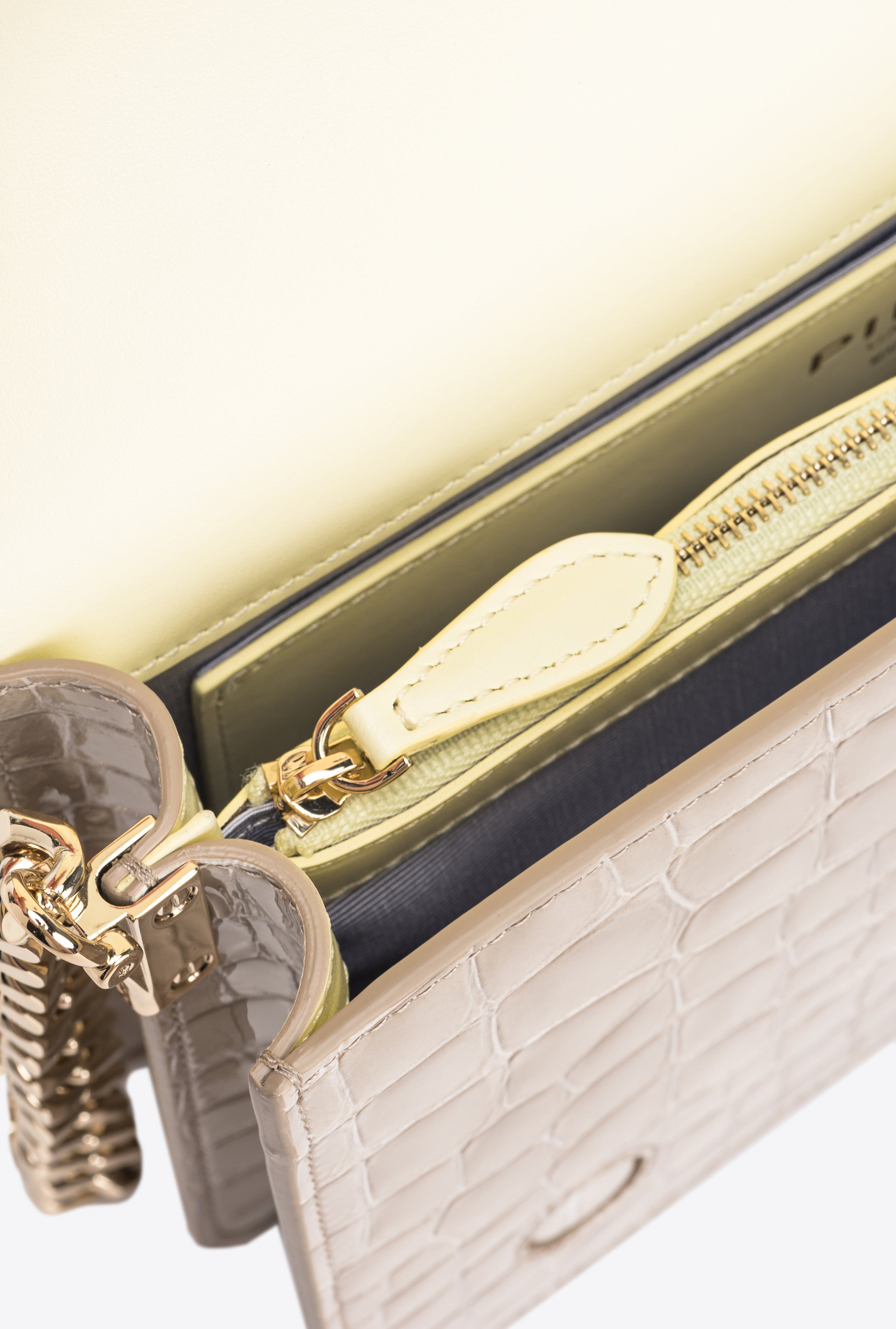Classic Love Bag Click made from shiny and slightly embossed crocodile-print leather in a combination of two different tones. The press-stud fastening is accompanied by the iconic Love Birds Diamond Cut buckle—in light gold-electroplated metal with white enamel—embellished with pavé-set black stones. Inside, it features contrasting lining, a slip pocket and a zipped divider pocket. The shoulder strap combines the classic round-link chain with a practical, adjustable leather pad. The bag is part of the Limited Edition special capsule collection which comprises PINKO Galleria-exclusive limited-edition models. Use the special NFC chip to enjoy a special experience, specific to the bag you have just bagged!