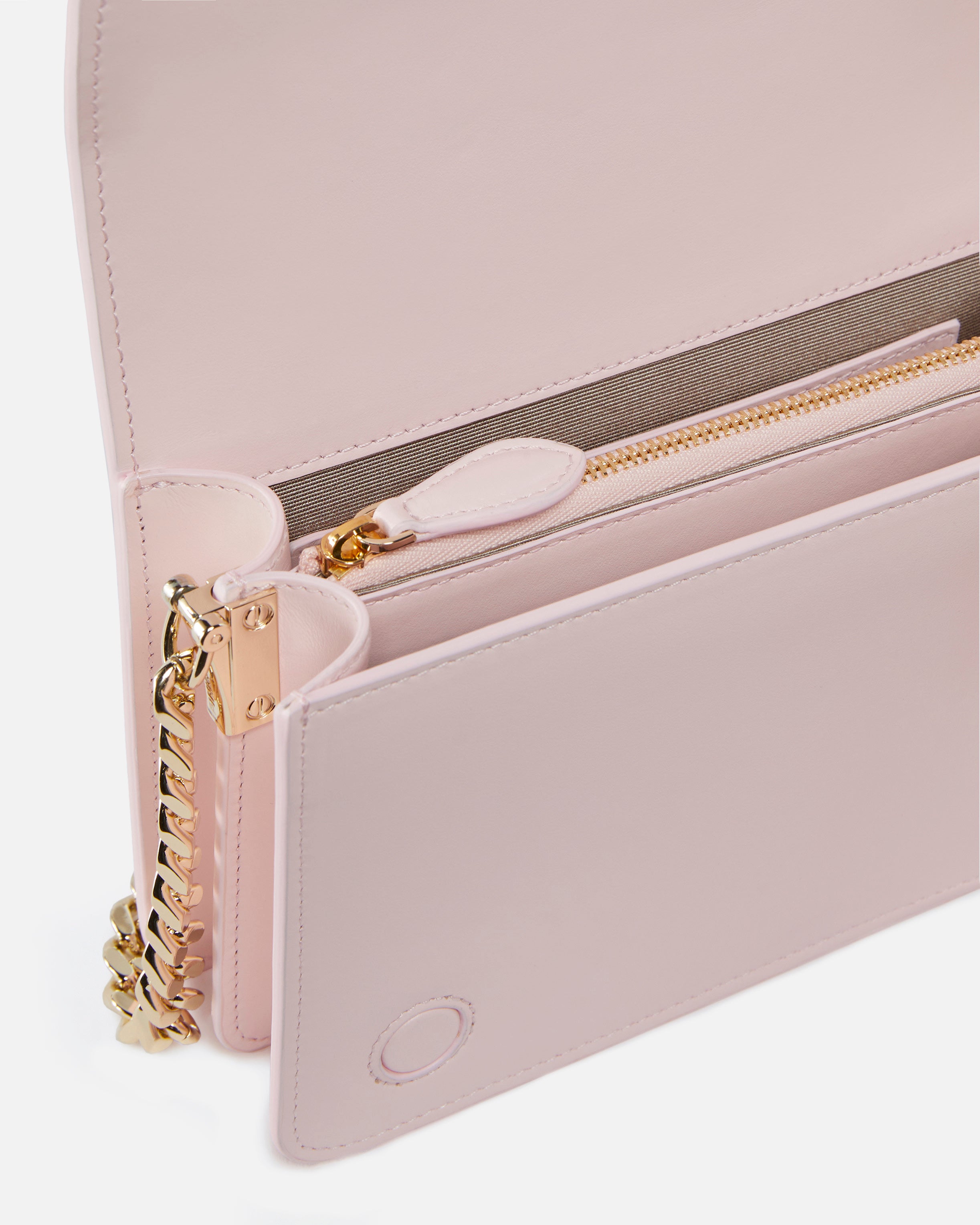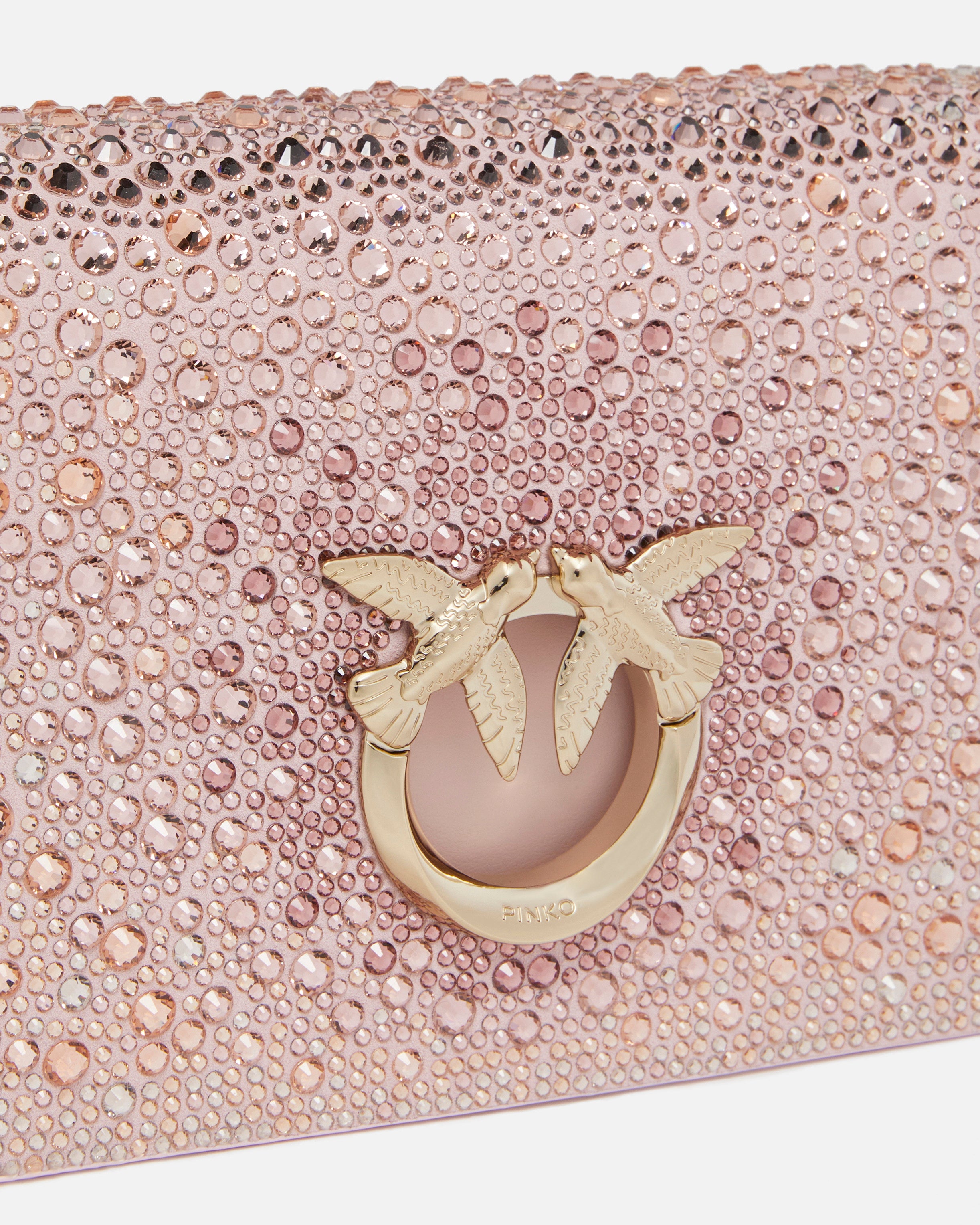 Mini Love Bag Click comprising imperfection-concealing brushed leather, in addition to suede which boasts a placed distinctive nuance, in line with the design created specifically by the PINKO team. All-over heat-transferred crystal appliqués: these comprise Europe-sourced round crystals with 8 ultra-bright facets, affixed in a secure and long-lasting way by means of the provided glue. The crystals - which come in four different sizes - are positioned, covered with a tissue and heat-pressed for several minutes. The concealed press-stud fastening is embellished by the iconic metal Love Birds Diamond Cut buckle with cut-out effect. The shoulder strap combines the classic round-link chain with practical leather shoulder padding. The bag is part of the Limited Edition special capsule collection which comprises PINKO Galleria-exclusive limited-edition models. Use the special NFC chip to enjoy a special experience, specific to the bag you have just bagged!