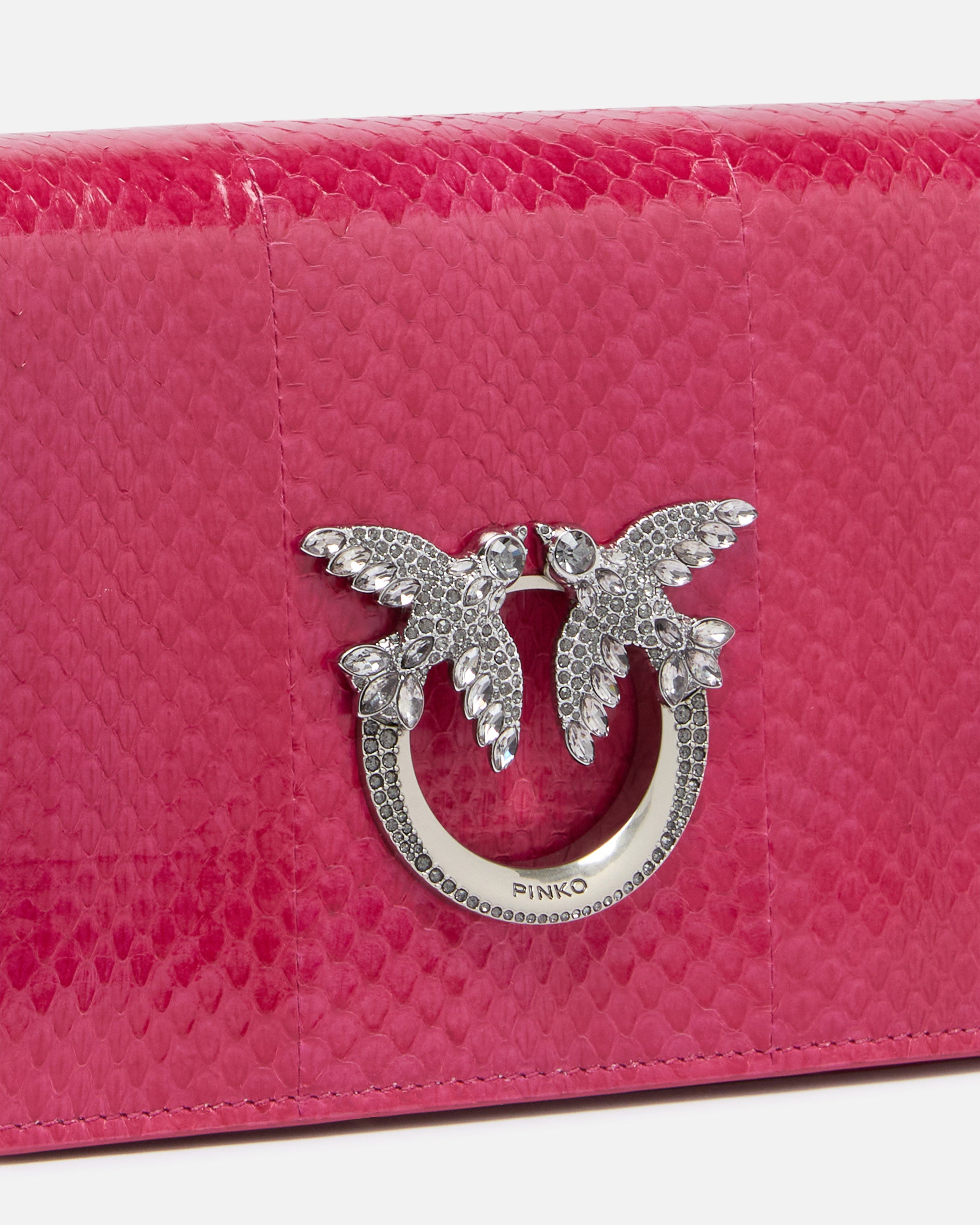 Mini Love Bag Click crossbody bag crafted from ayers reptile python skin with a distinctive glossy finish. This distinctive type of leather is placed on the bag and then applied by hand on each model: depending on the leather used, each bag is therefore utterly unique and so any imperfections are to be considered a characteristic and distinctive detail. The chain shoulder strap, complete with adjustable leather pad, means it can be comfortably carried on the shoulder. The mini bag boasts a fabric-lined interior and a zipped divider pocket. The iconic metal Love Birds Diamond Cut buckle is made even more exquisite by the crystal pavé appliqué, sure to make all the special occasions in which you will wear it unique. The bag is part of the Limited Edition special capsule collection which comprises PINKO Galleria-exclusive limited-edition models. Use the special NFC chip to enjoy a special experience, specific to the bag you have just bagged!
