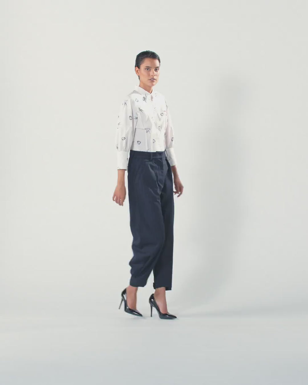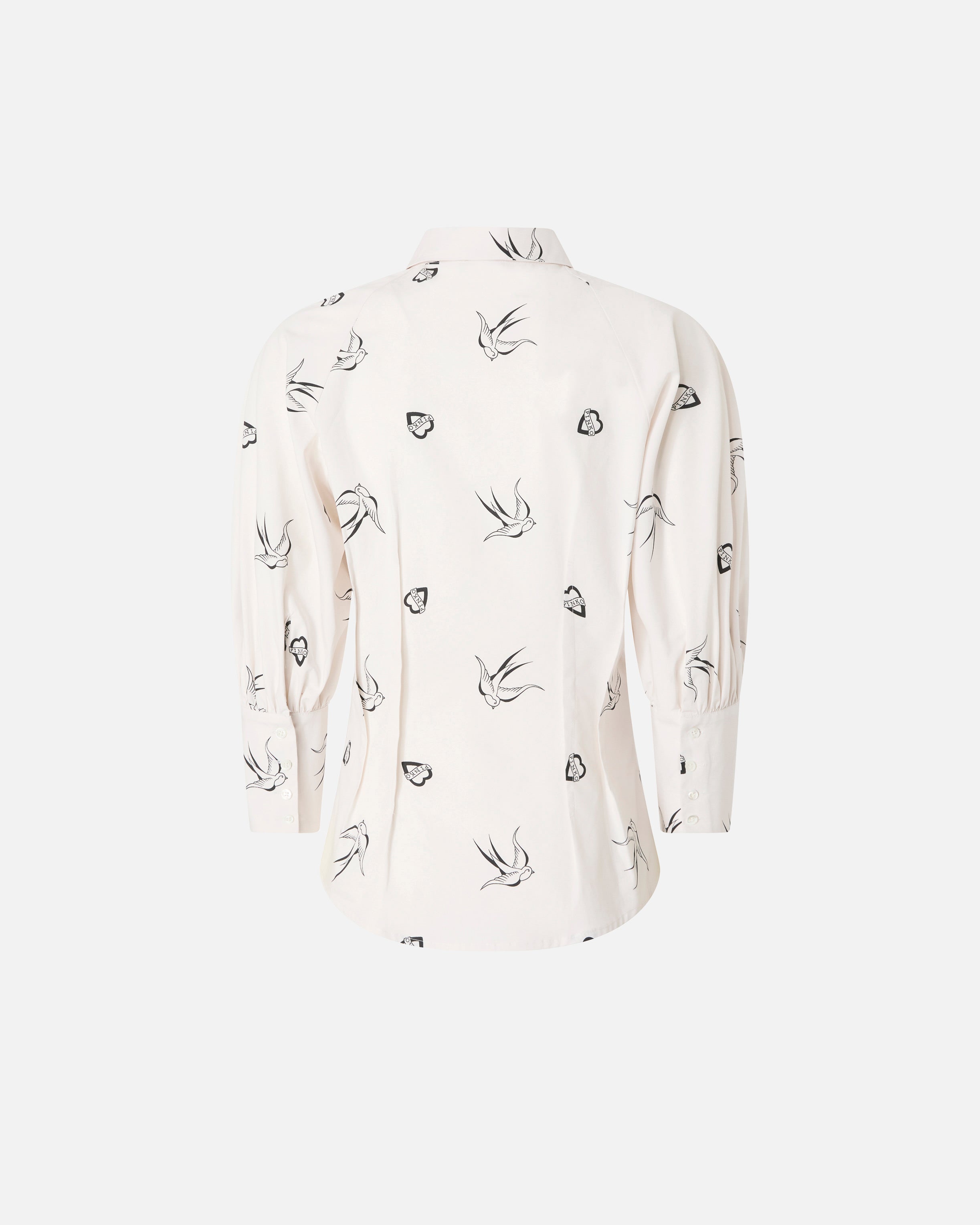 Women's shaped shirt with a loose top section, featuring a rounded front and back hem, a classic collar and balloon sleeves completed by buttoned cuffs. The pure cotton poplin fabric with a soft yet compact hand features an all-over print inspired by sailors' tattoos, alternating with the brand's iconic symbols: birds and the PINKO lettering logo. The front, on the left side, is further finished with the contrasting embroidered lettering logo.