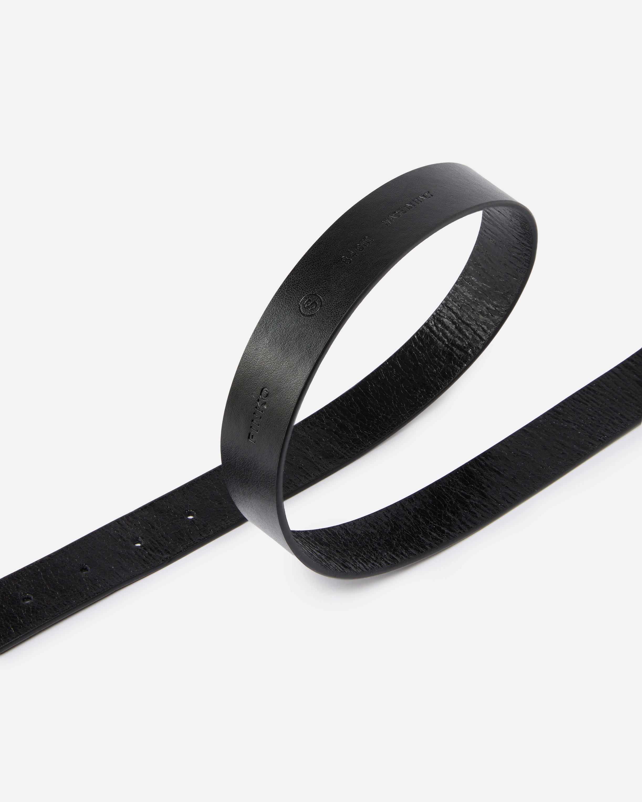 3 cm belt in soft, shiny leather. The model stands out for its alternating leather loops—embellished with small round metal studs—and faceted loops made entirely from metal for a shiny, eye-catching touch. The accessory is complete with a semi-oval-shaped buckle finished with the iconic engraved PINKO logo lettering.