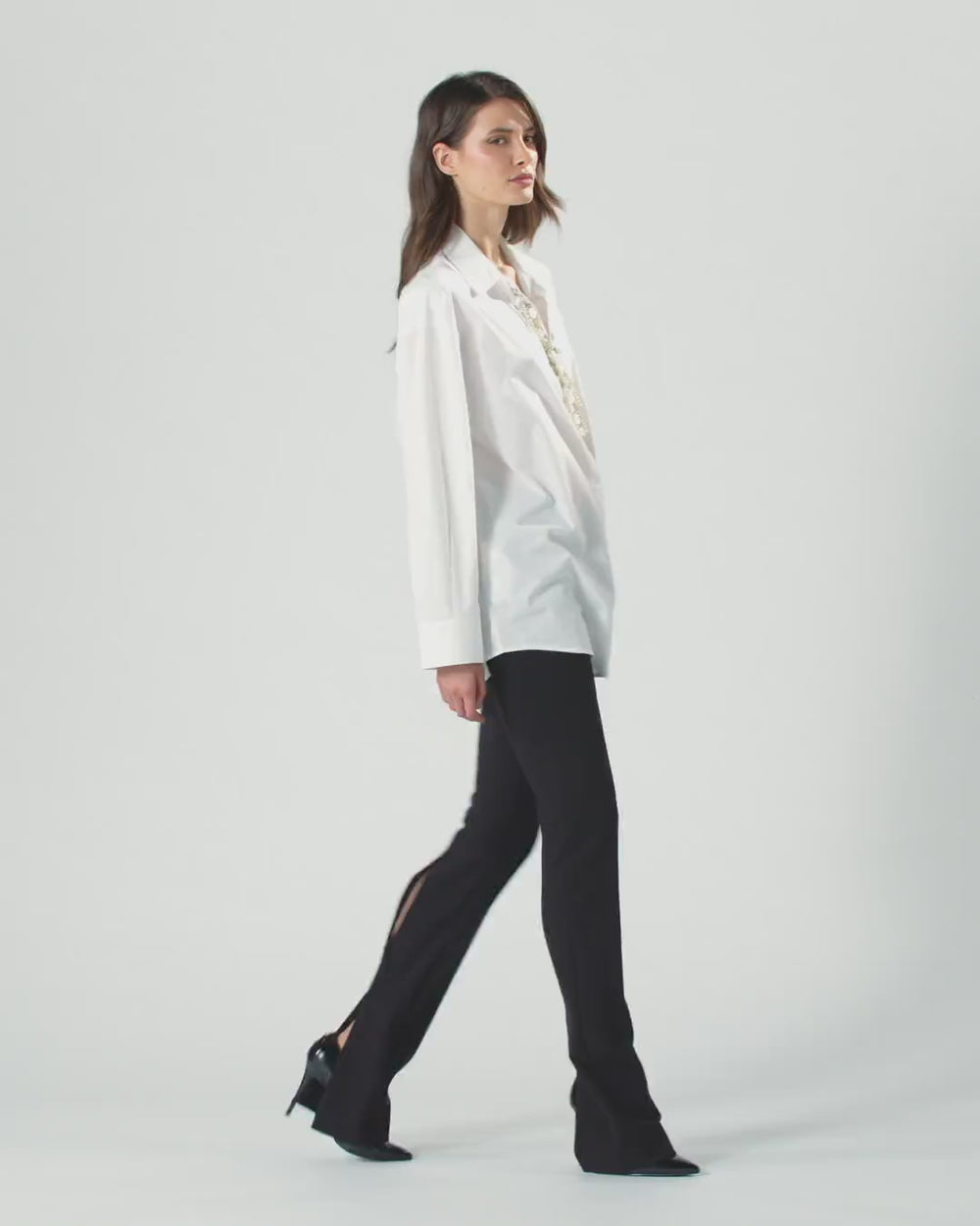 Slightly oversized classic shirt in pure cotton poplin. The collar opens into a deep V-neck decorated with fine handmade embroidery with glass and metal chain appliqués with rhinestones, sewn one by one, to add movement and shimmer to the piece. The relaxed fit and slightly low set-in long sleeves complete the style of this shirt, which pairs effortlessly with a mini skirt and printed jacket for a striking, feminine everyday look.