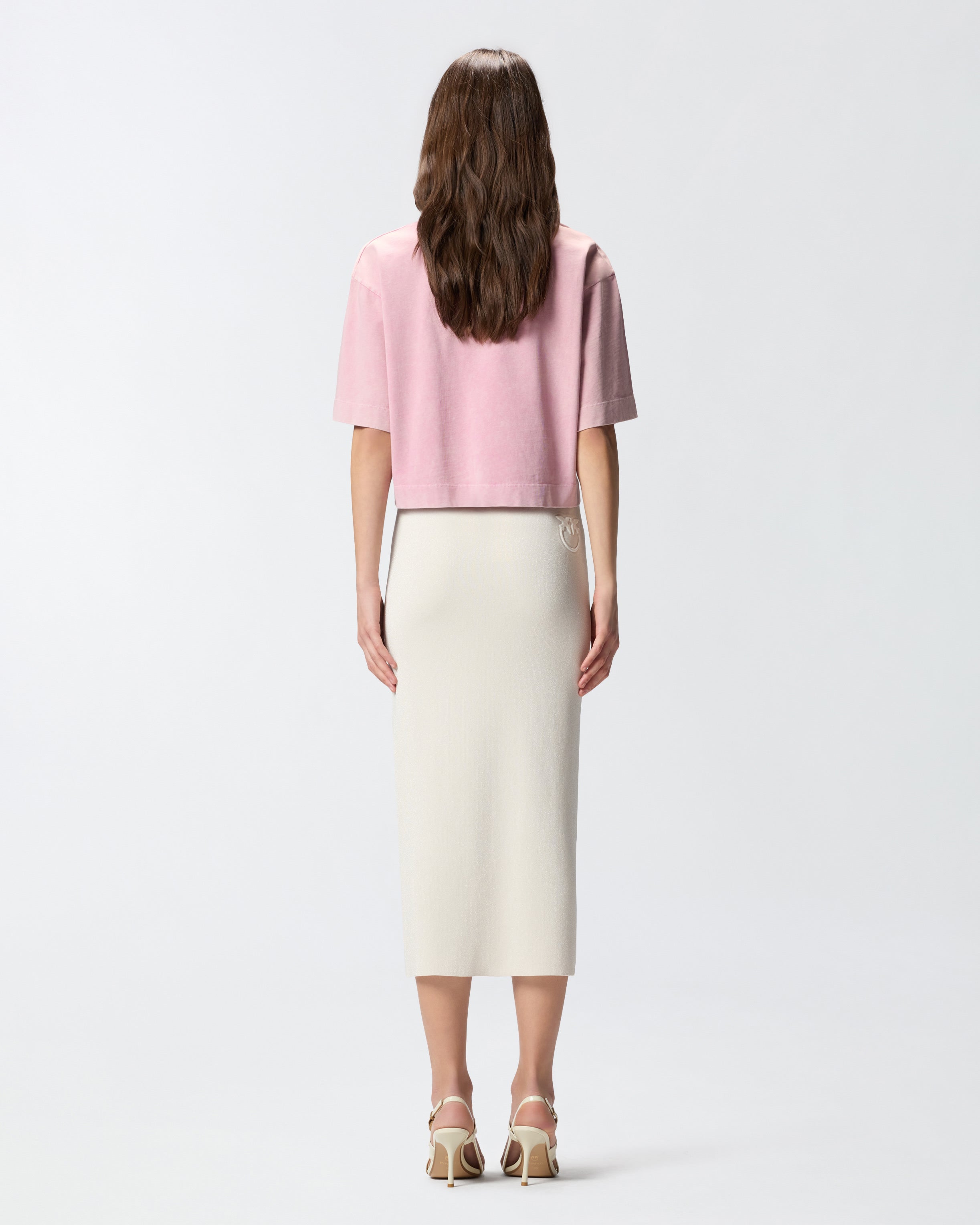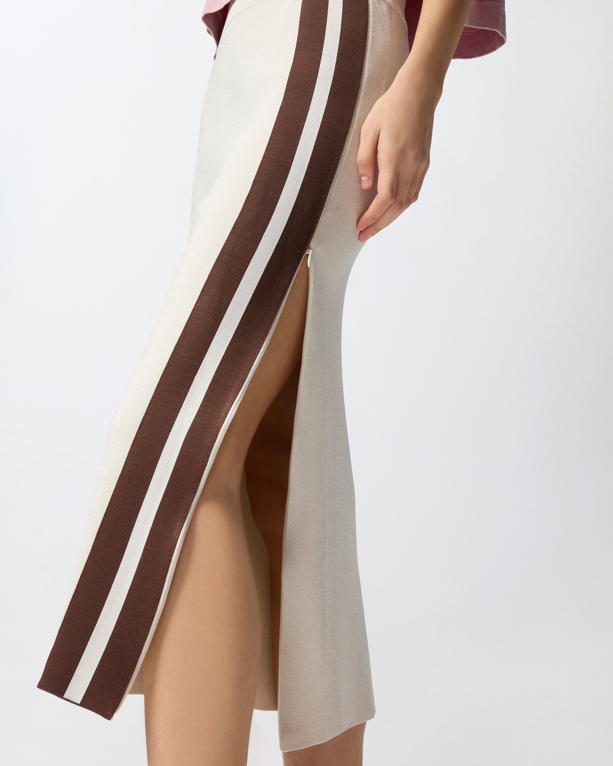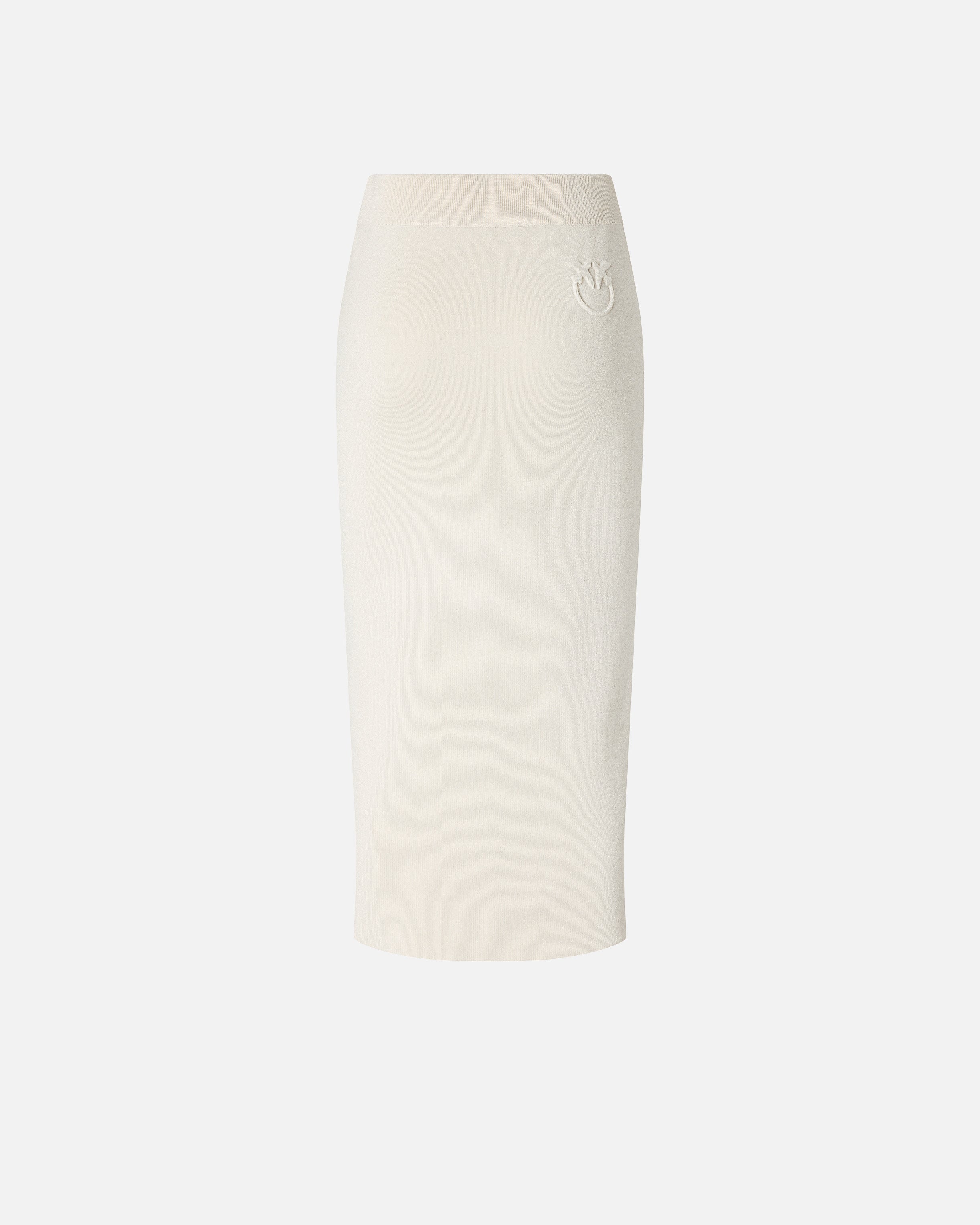 Slim-fit midi skirt with a convenient ribbed waistband that makes it even more comfortable to wear. The garment focuses on a blend of functionality and glamour in true PINKO style, combining a very feminine silhouette with a sportier fabric: a sweatshirt-effect pique enhanced by a delicate shiny yarn and two contrasting side stripes at the front. The style, which is also customised with the Love Birds logo in tone and embossed on the back, lends itself to dynamic and contemporary looks: try it on with the matching sweatshirt for a daytime outfit with a slightly sporty feel. Pair the design with trousers of the same material for a sporty look par excellence. - ARCOBALENO SKIRT