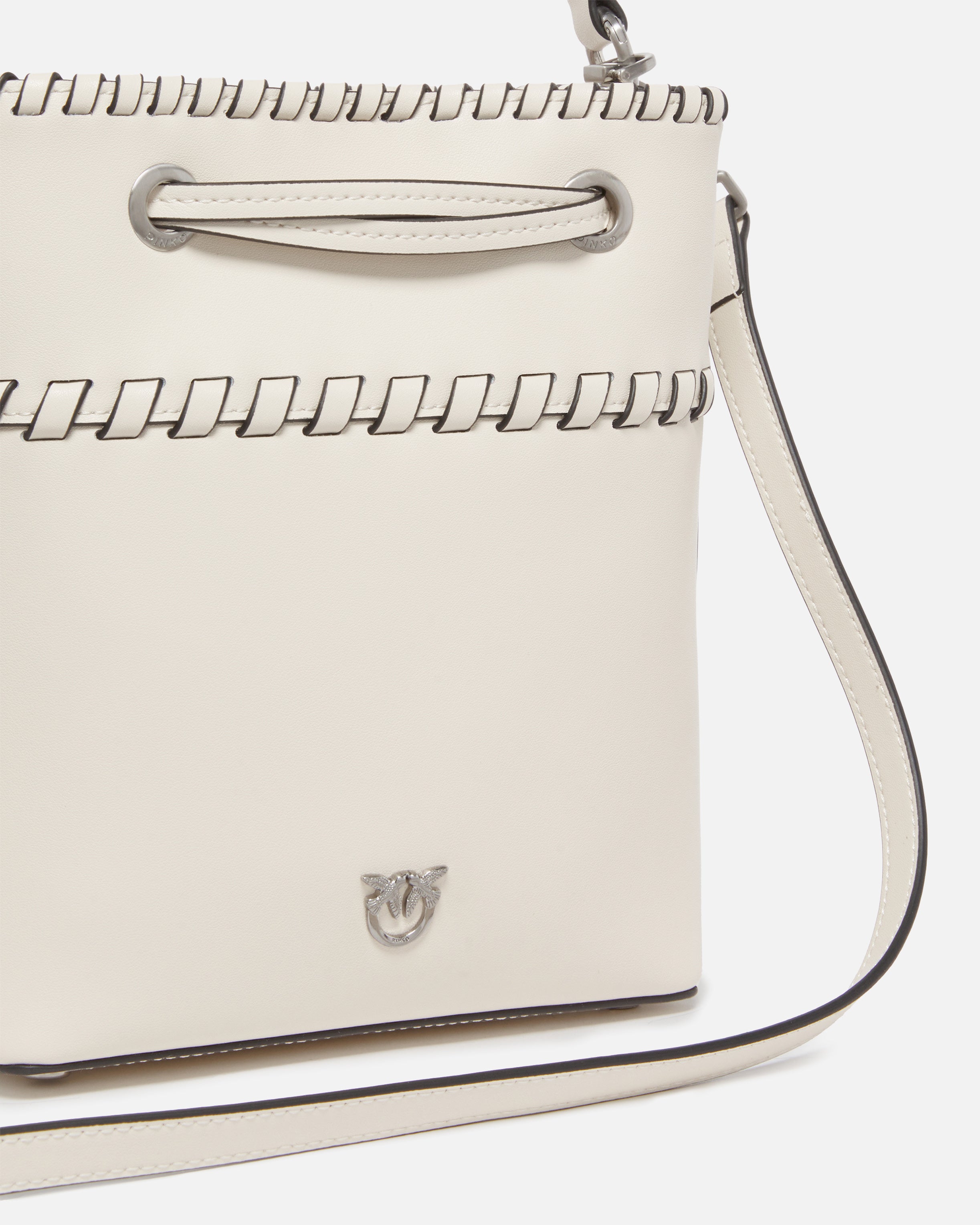 Small bucket bag made of soft silk-hand leather and equipped with cotton lining. Featuring an adjustable and removable leather shoulder strap and a top handle for carrying by hand or on the shoulder, the bag is extremely versatile and practical. A signature accessory with endless looks, this handbag features a drawstring to adjust its pouch-style closure. The design, embellished with refined threading, is completed by the Love Birds logo that conveys the brand's inimitable style. Activate your PINKO bag: check the authenticity of your product and access the personalized experience by bringing your smartphone close to the Love Birds embroidery on the back of the bag!