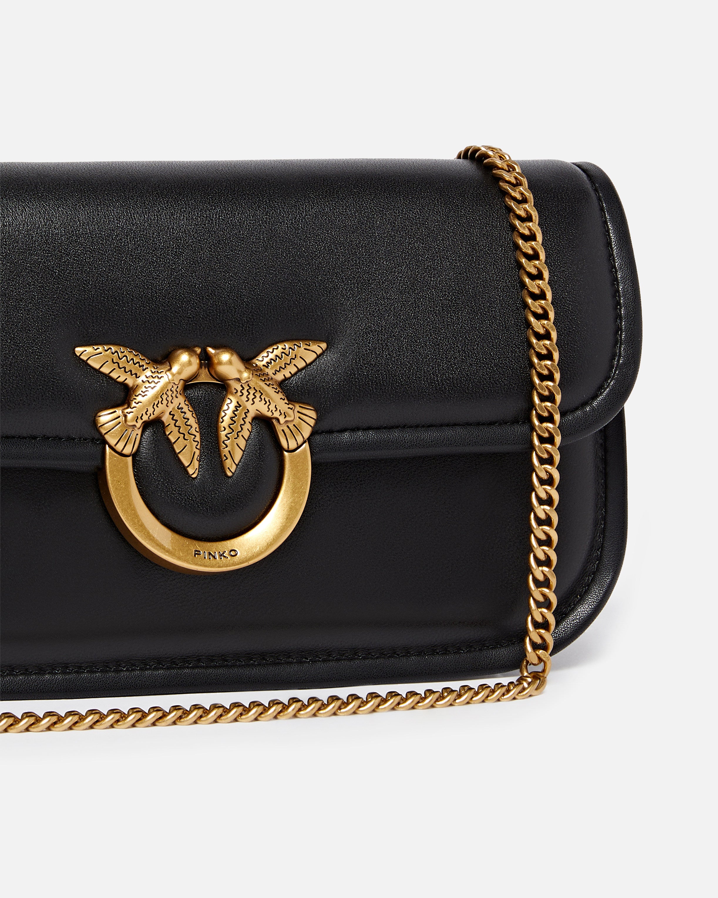 Small Love Bag Box bag with an elongated rectangular design in soft nappa leather, with cotton lining and inner zip pocket to keep your essentials safe. The accessory can be personalised according to your needs and occasions of use thanks to two different removable shoulder straps: an adjustable leather one, for carrying it over your shoulder, and a shorter one with a thin metal chain, for carrying it by hand. The accessory sports bold and personal allure, while the Love Birds Diamond Cut buckle embodies the inimitable PINKO style. Activate your PINKO bag: verify the authenticity of your product and access a personalised experience by scanning the Love Birds embroidery on the back of the bag with your smartphone!