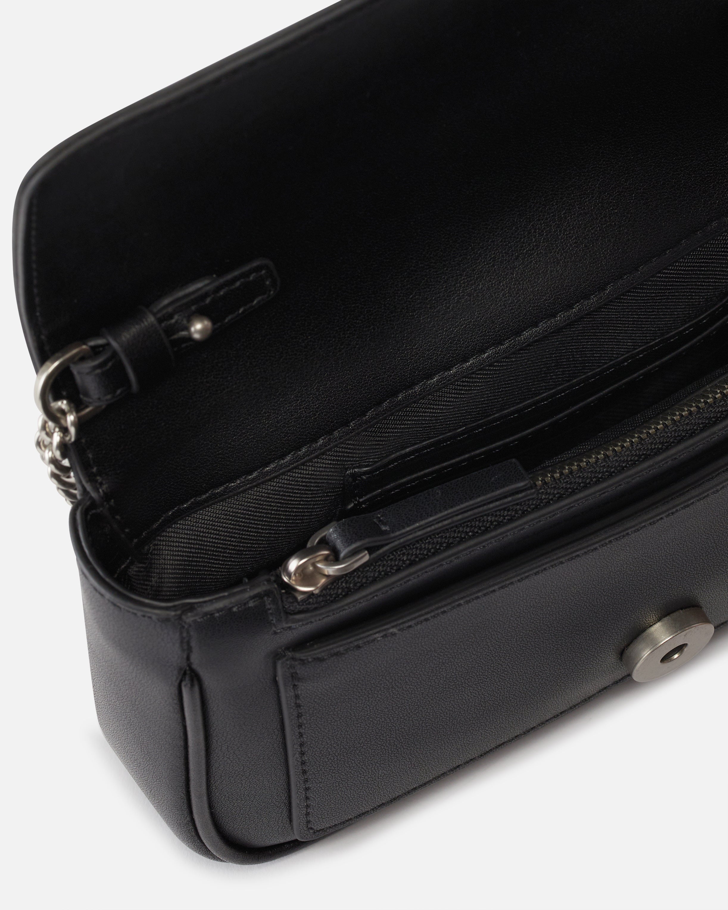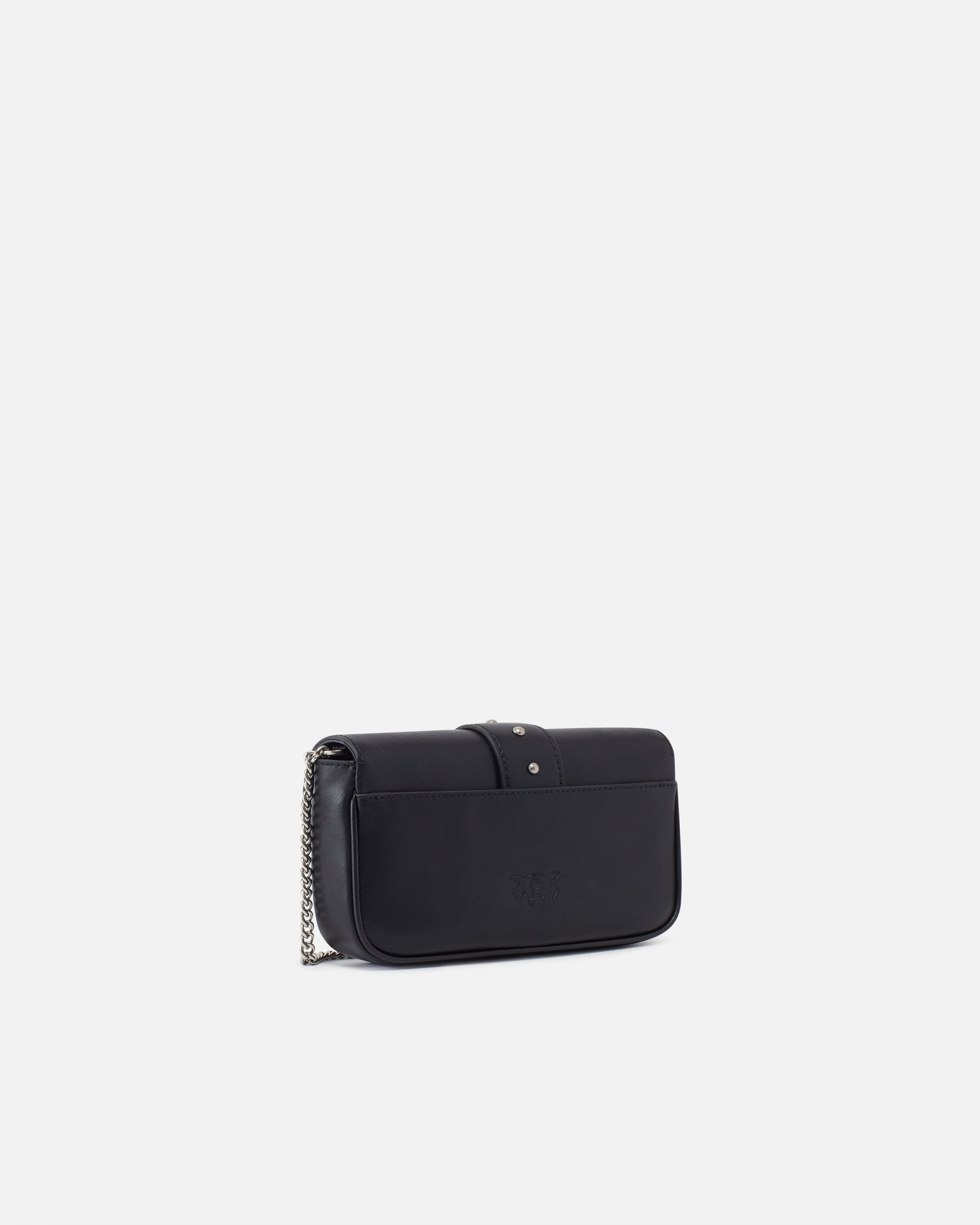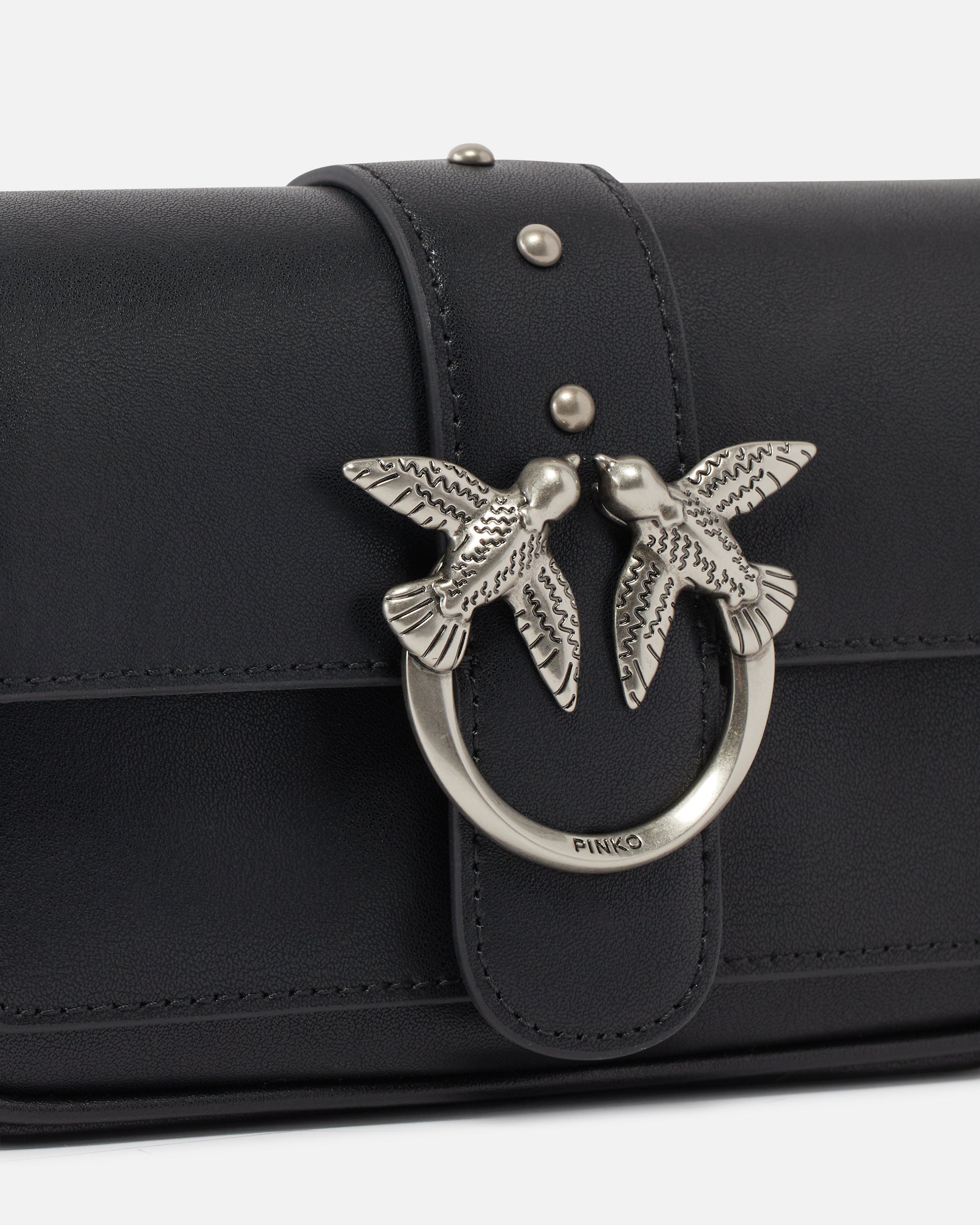 Pocket Love Bag One in soft, silky leather. The micro-studded leather strap fastening is complete with a Love Birds Diamond Cut buckle. This accessory is lined with technical fabric, and has an inner zipped pocket and card slots. Removable thin metal round-chain shoulder strap.
