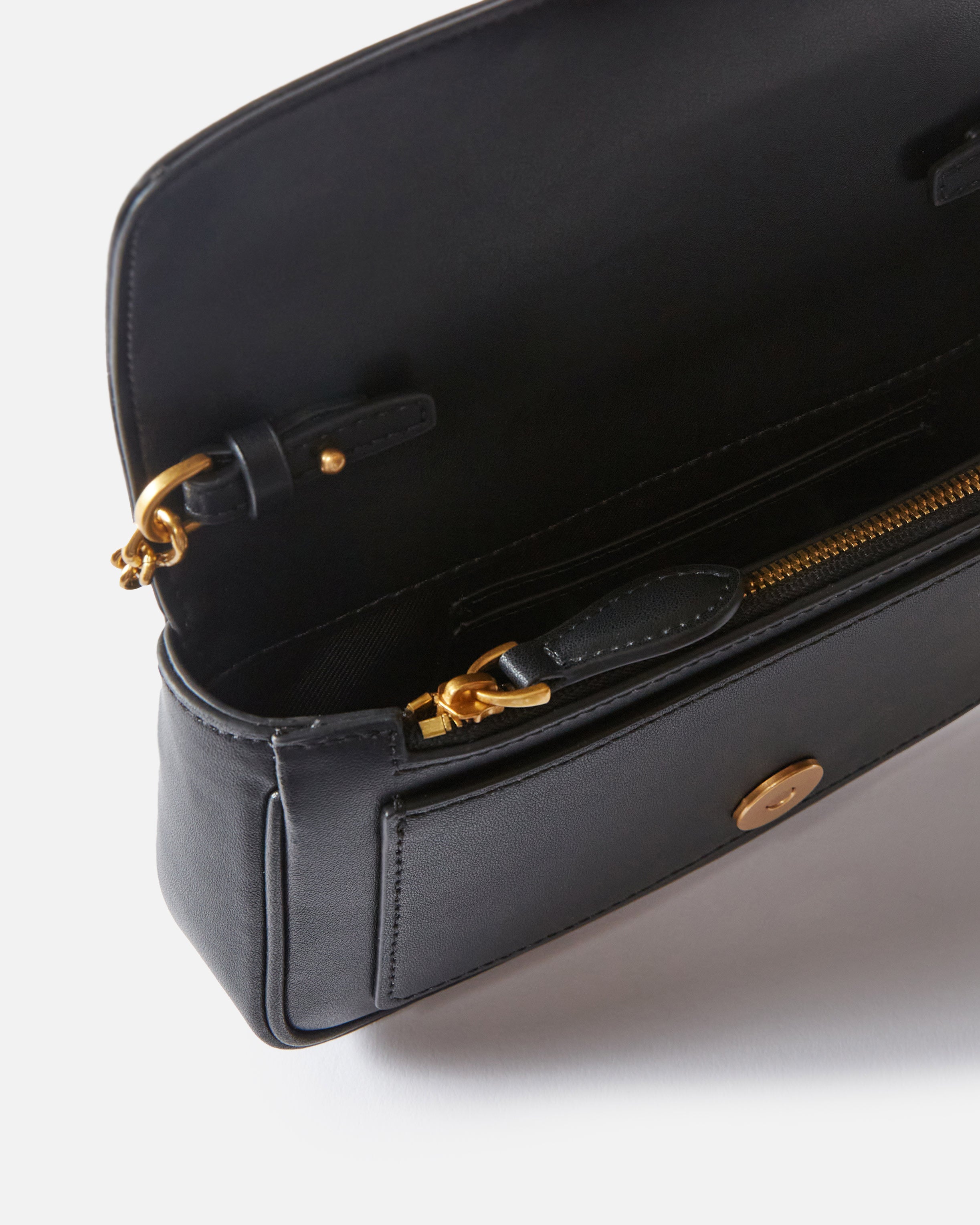 Pocket Love Bag One in soft, silky leather. The micro-studded leather strap fastening is complete with a Love Birds Diamond Cut buckle. This accessory is lined with technical fabric, and has an inner zipped pocket and card slots. Removable thin metal round-chain shoulder strap.