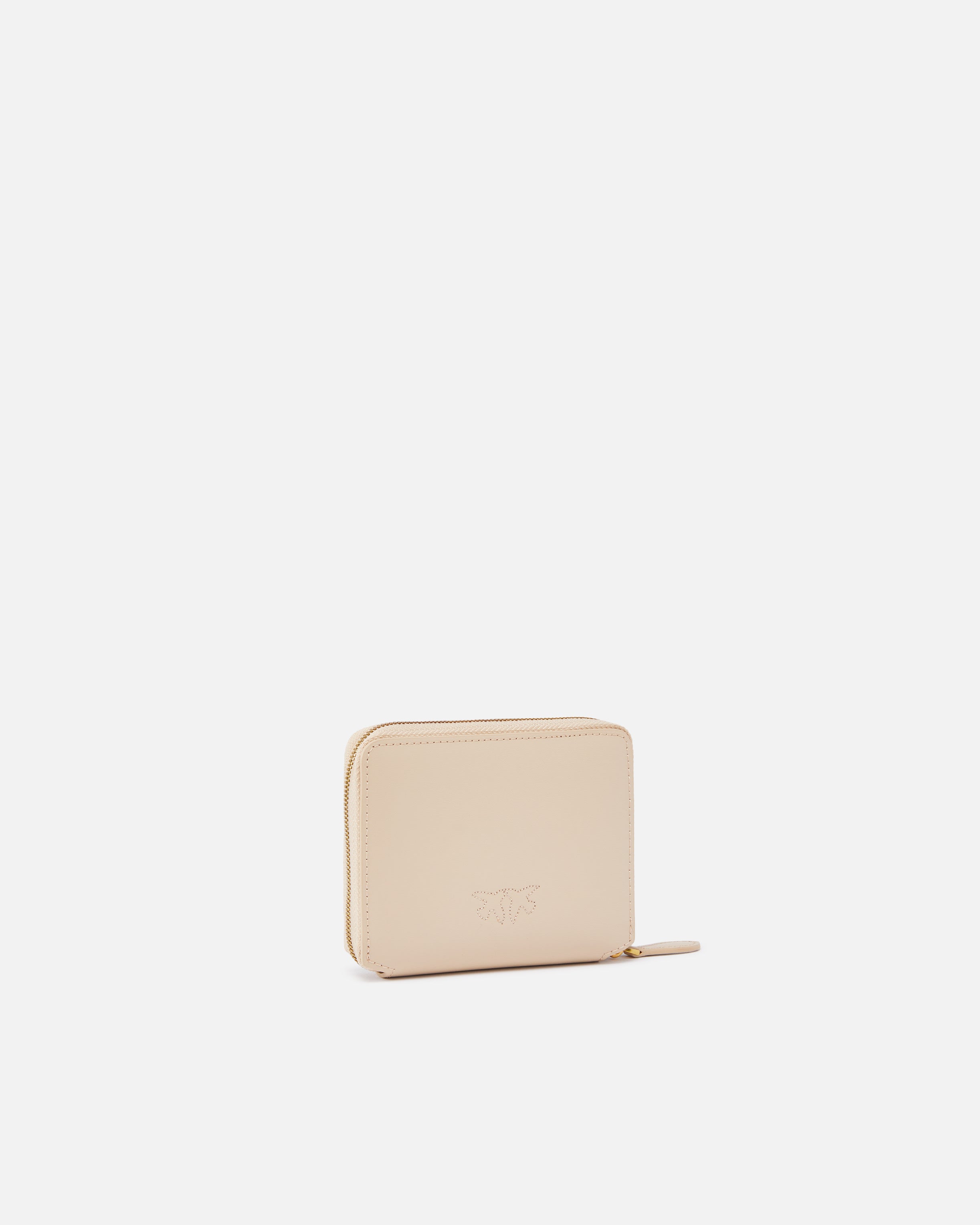 Square-shaped zip-around wallet in soft, silky leather, featuring the Love Birds Diamond Cut plaque on a leather base. Polycotton-lined interior. Zip fastening.