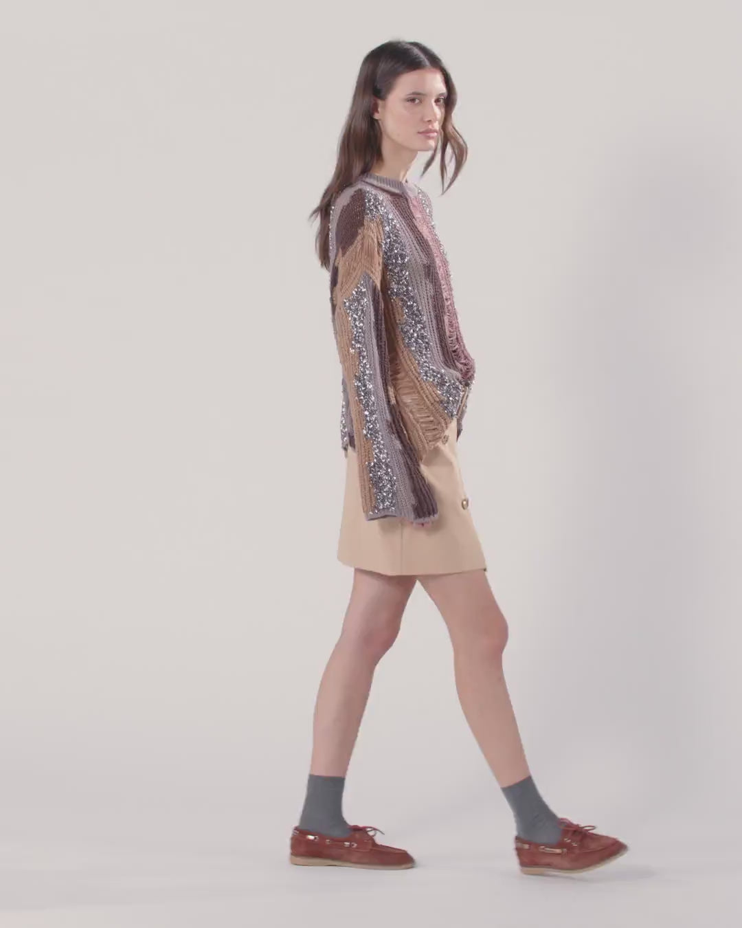 Cotton-blend sweater with all-over vertical motif comprising a refined inlay with yarns of different colours and detailing, including metal wool that gives the garment a radiant touch. This model features a crew neck and slightly dropped shoulders, and is complete with a label sporting the PINKO logo lettering on the back, representing the brand's DNA.