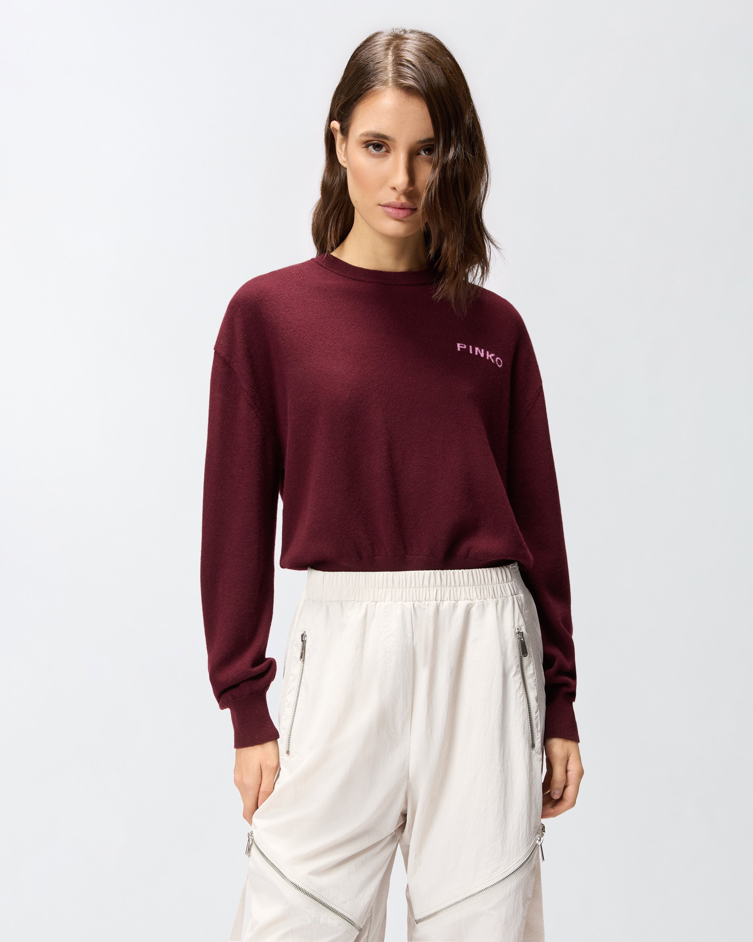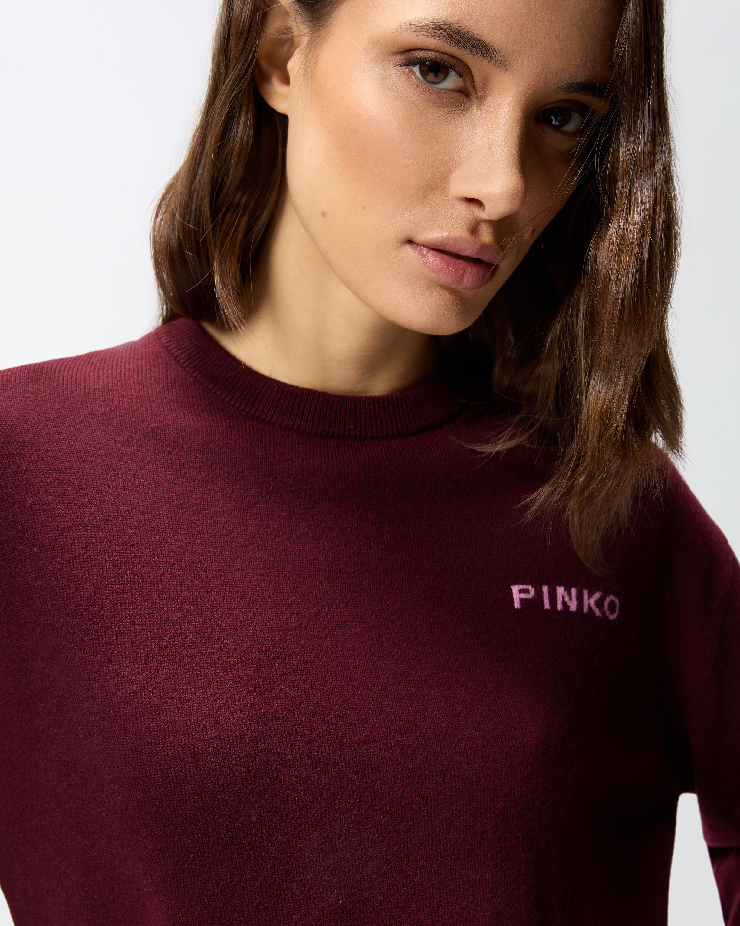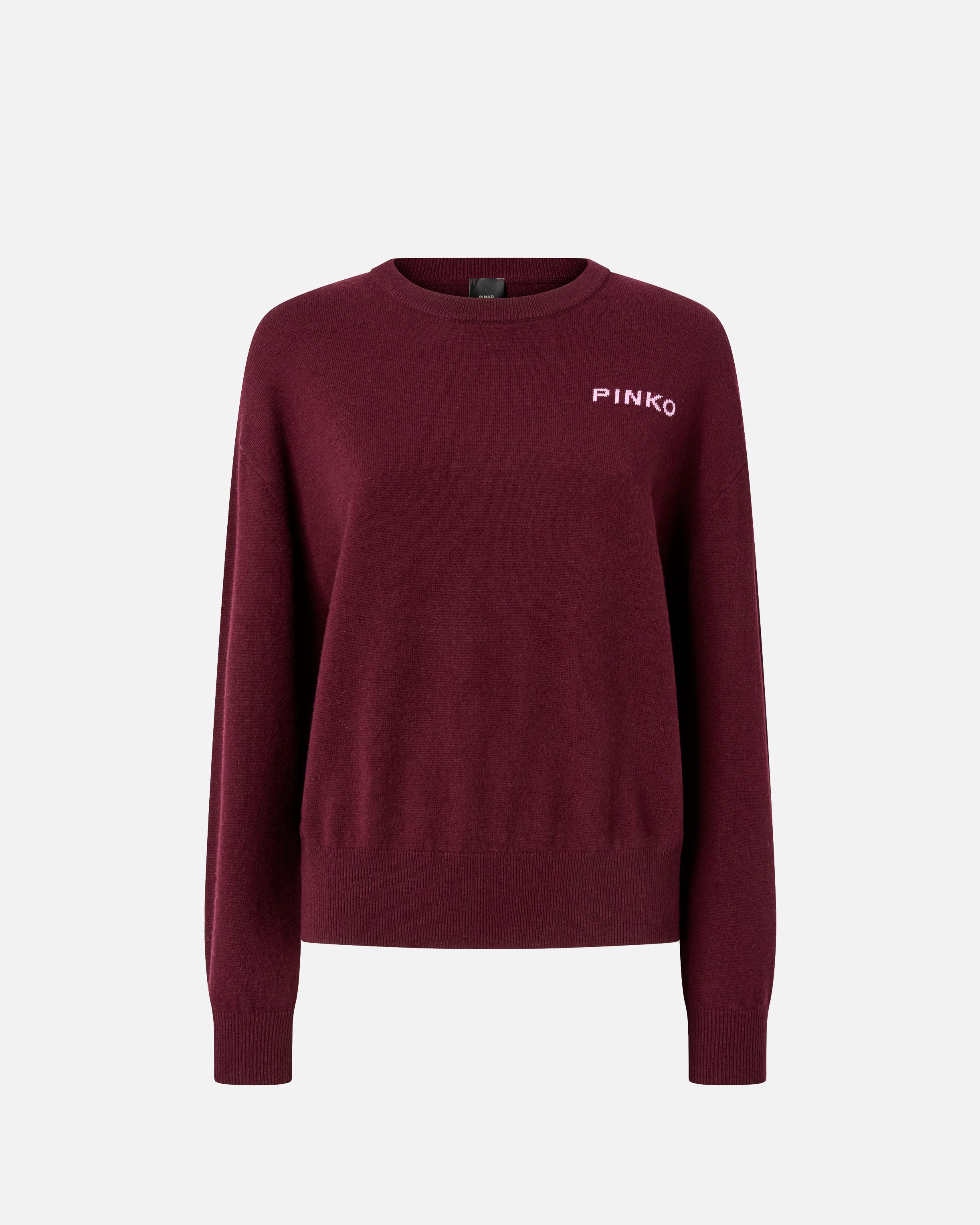 Long-sleeved crew-neck sweater in a fine wool and cashmere blend. The inimitable style of the brand is expressed to the fullest in this garment, embellished by the Love Birds maxi-logo on the back and the contrasting PINKO lettering logo on the front left side. The piece has undergone finishing tests to minimise the possible formation of pilling, ensuring greater fabric softness and durability. The design is completed with a ribbed crew-neck, hem and cuffs.