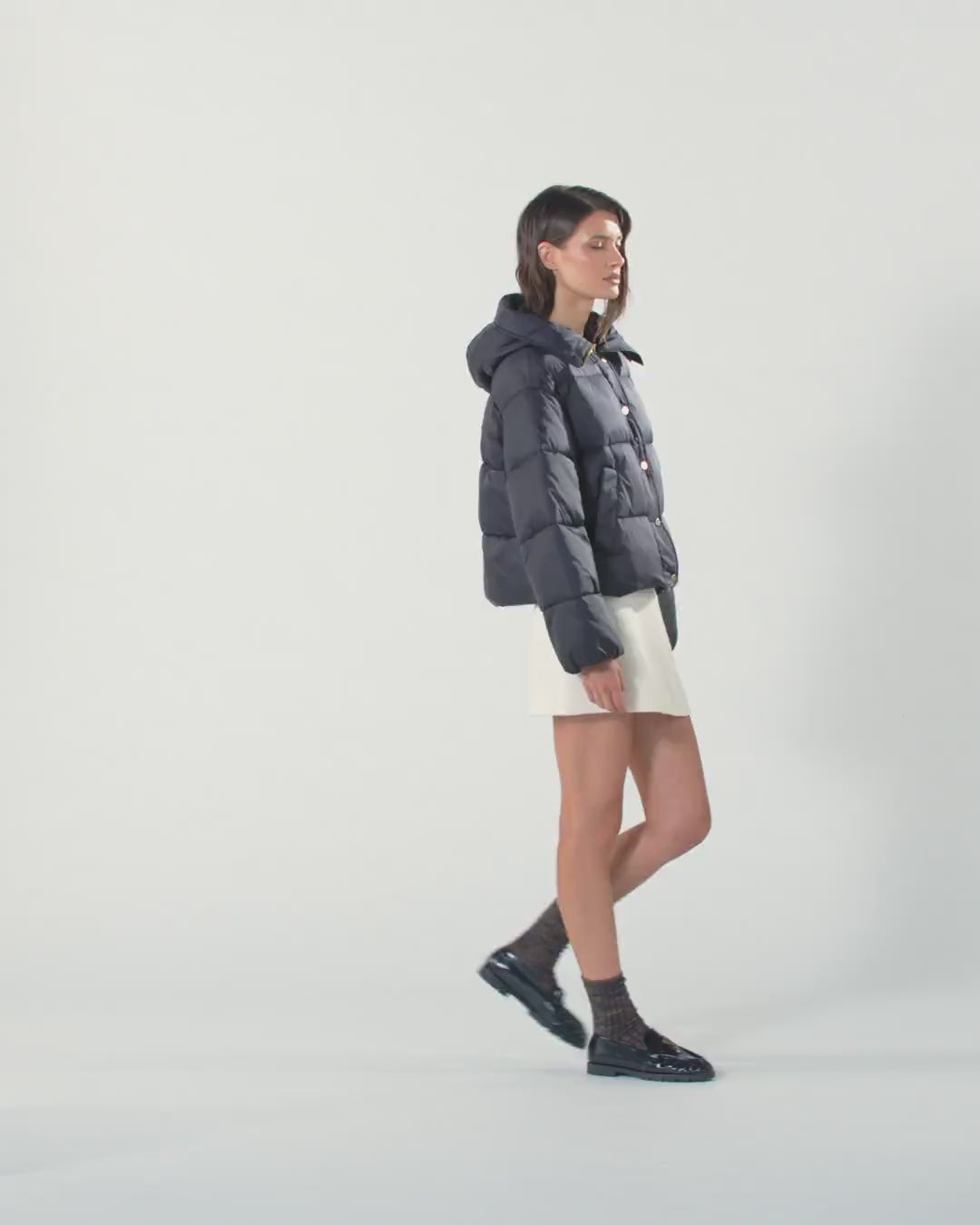 Down jacket in padded technical fabric with special semi-glossy finish. The style features a large cosy hood with an adjustable drawstring and comfortable vertical welt pockets. Metal press-stud fastening. The cropped cut of the puffer jacket makes it the perfect everyday outerwear to tackle the first cold days of the season.