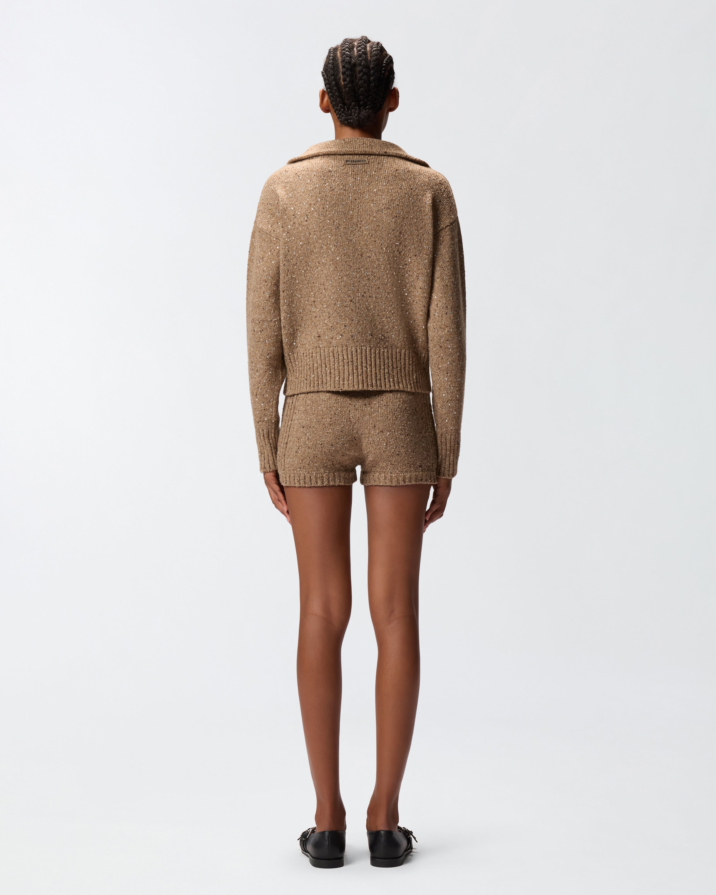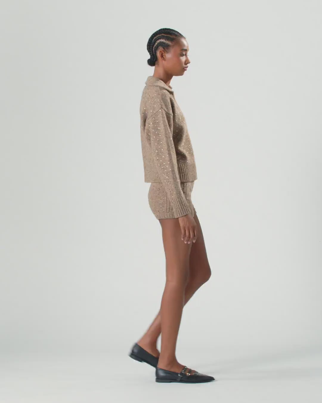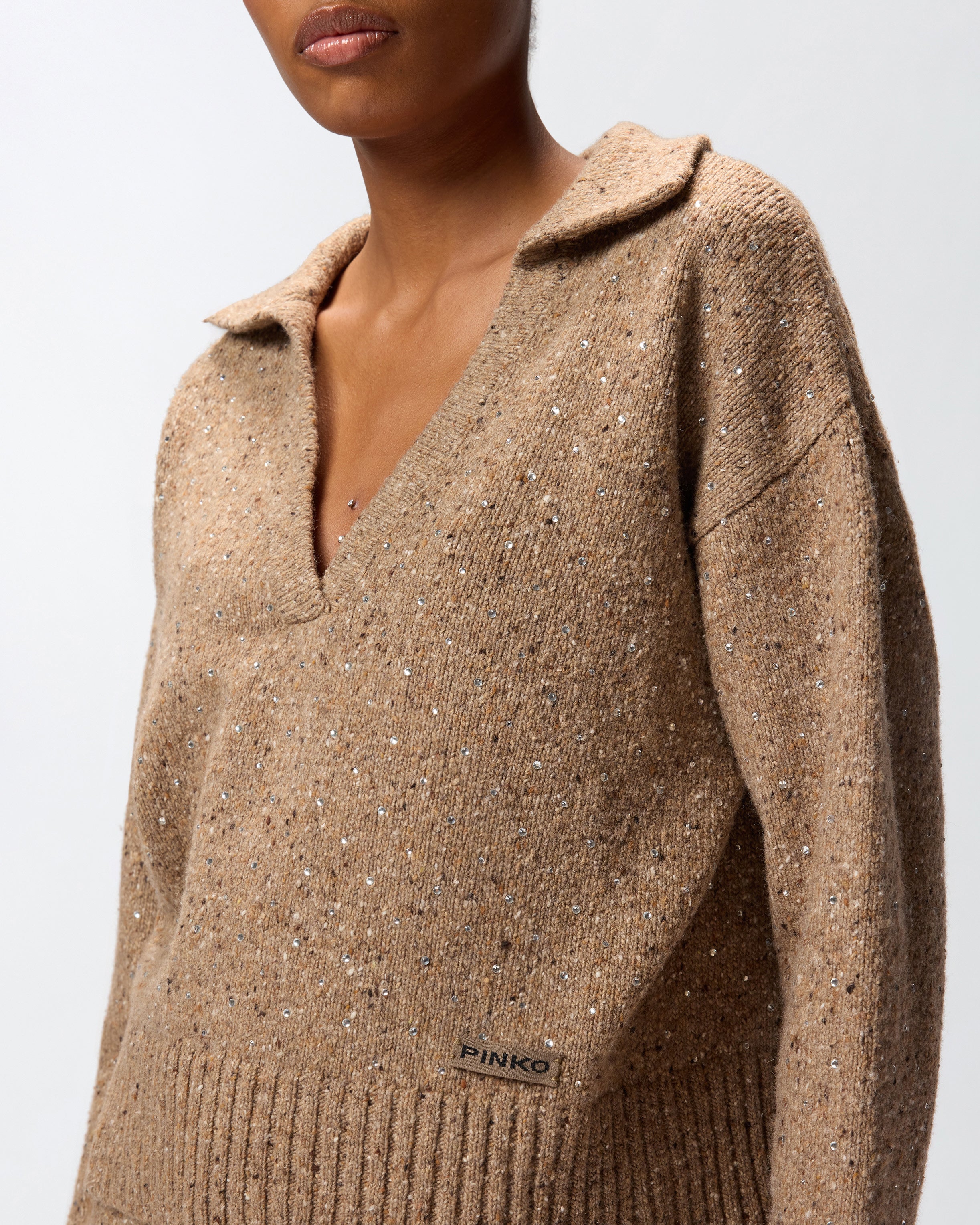 V-neck sweater with a polo-style collar and long sleeves made from soft knop jacquard fabric, embellished with shiny rhinestone appliqué all over. The hem and cuffs are ribbed, while the tone-on-tone label with the PINKO lettering logo stands out on the side of the front. The piece has undergone finishing tests to minimise the possible formation of pilling, ensuring greater fabric softness and durability. The sweater is casual, thanks to the relaxed fit, and at the same time feminine, thanks to the rhinestones that enhance the design.