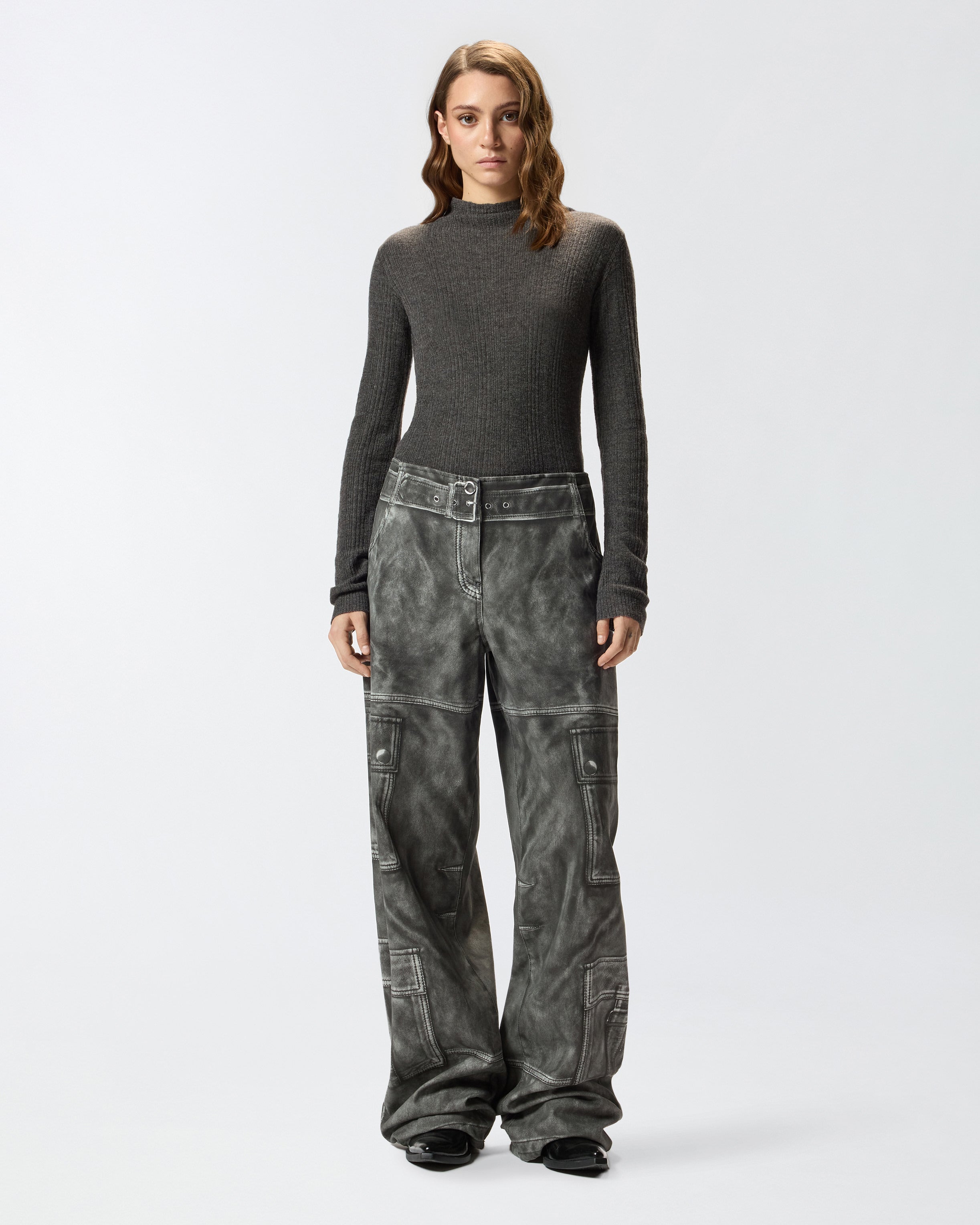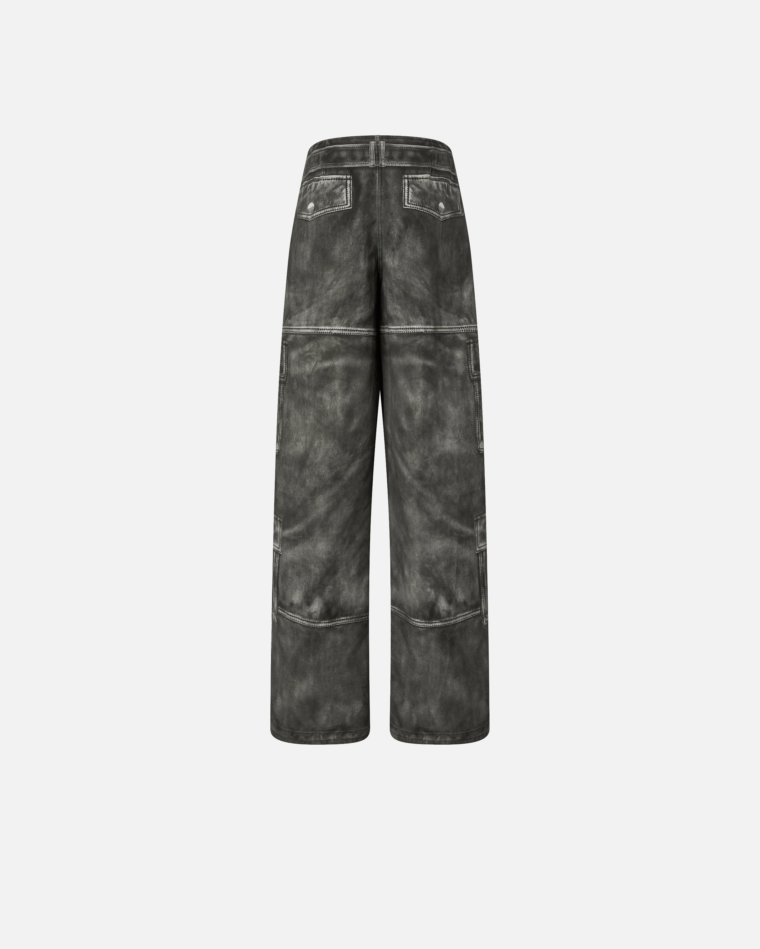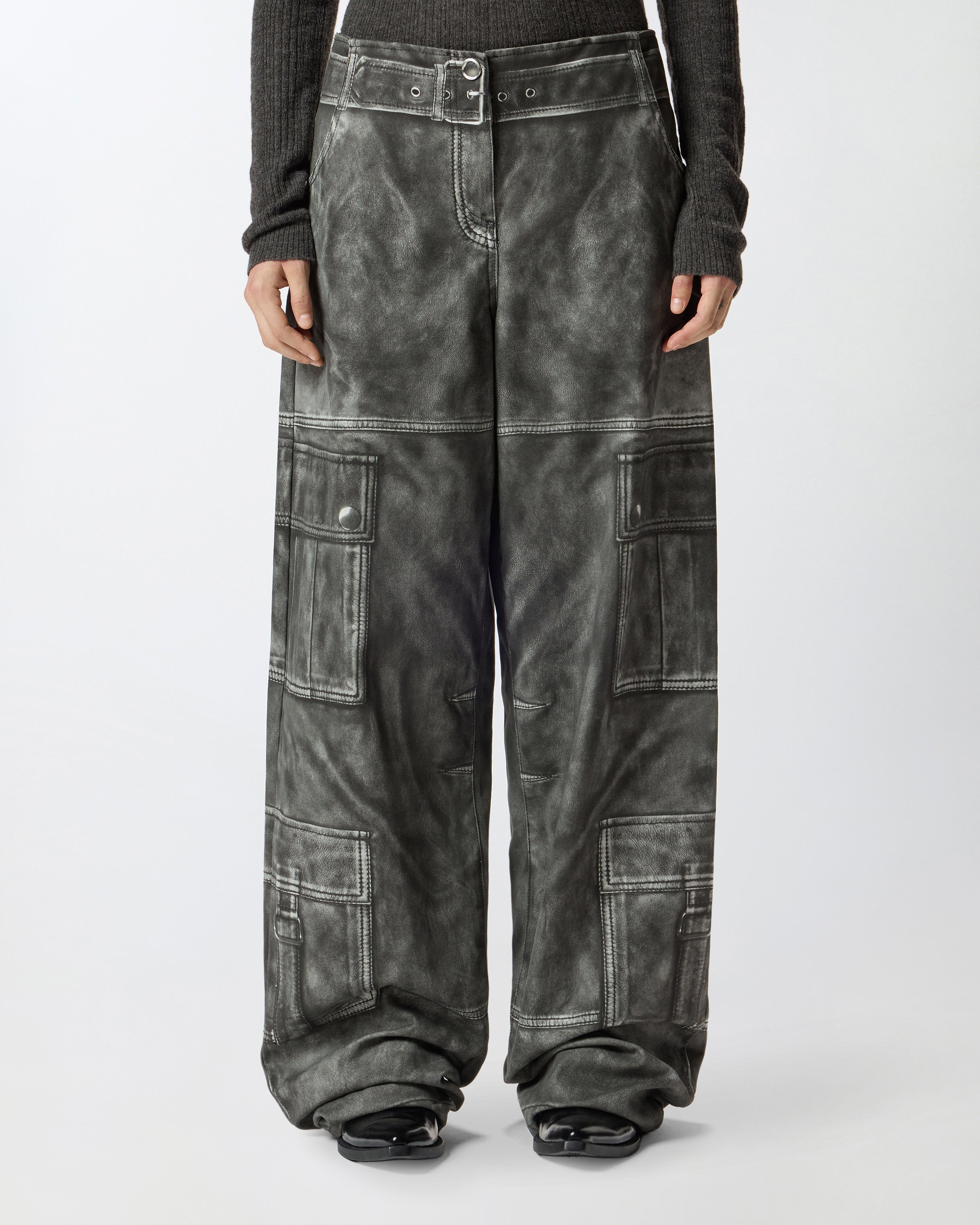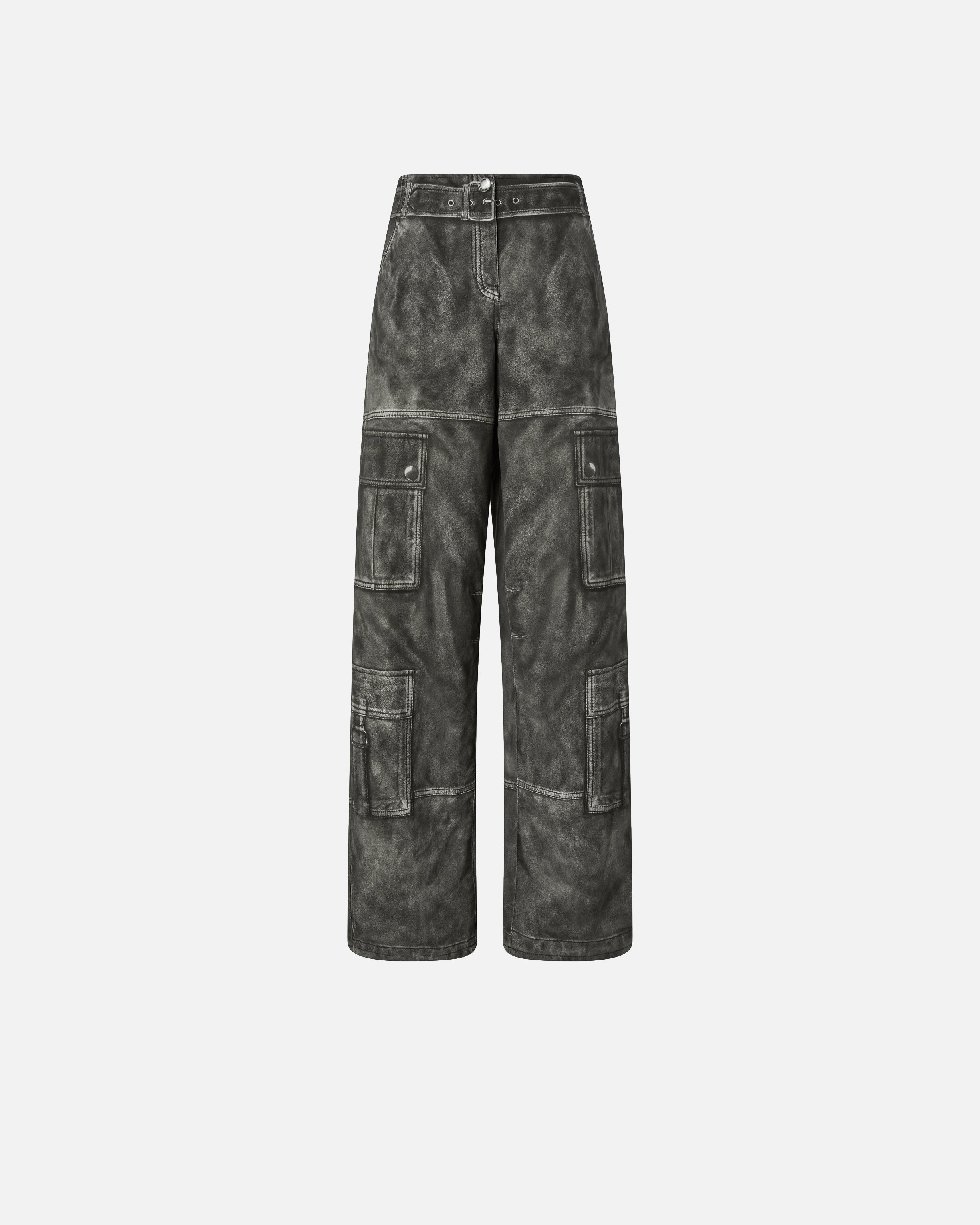 Cotton wide-leg trousers. The distinctive detail of this style lies entirely in the print, which exploits the trompe-l'œil technique to recreate a vintage leather effect on the cotton base and elements and details that are not real, but printed. Every model meticulously reproduces the nuances and textures typical of leather, as well as all the distinctive details of cargo trousers, such as the pockets along the legs, the back pockets, the waist belt, the fastening, the buttons and the top-stitching. Add these relaxed-style trousers to your wardrobe and be amazed by the quality and innovation in pure PINKO style.