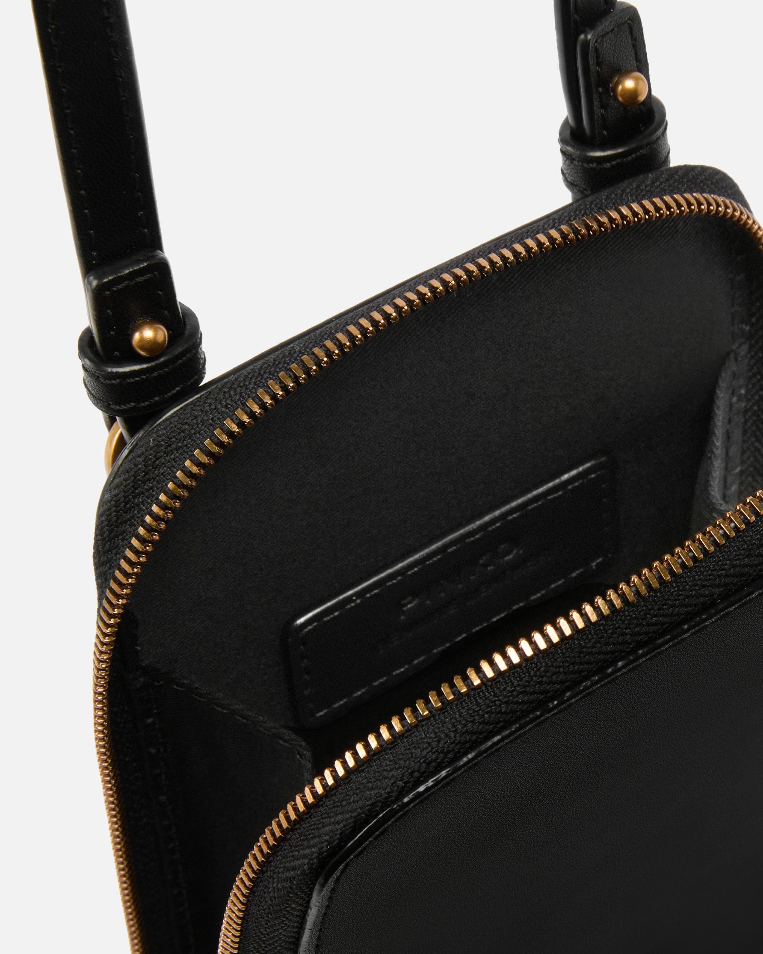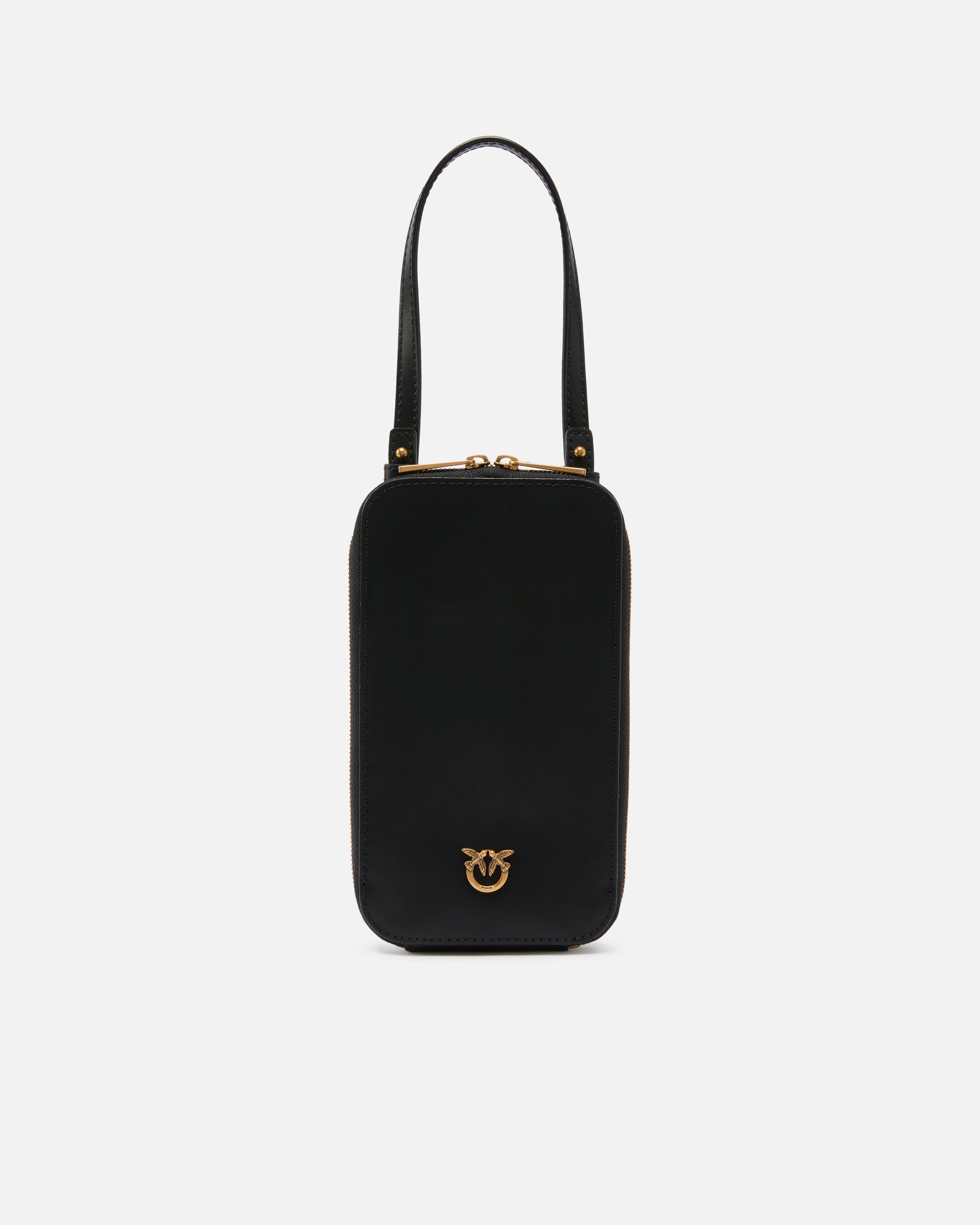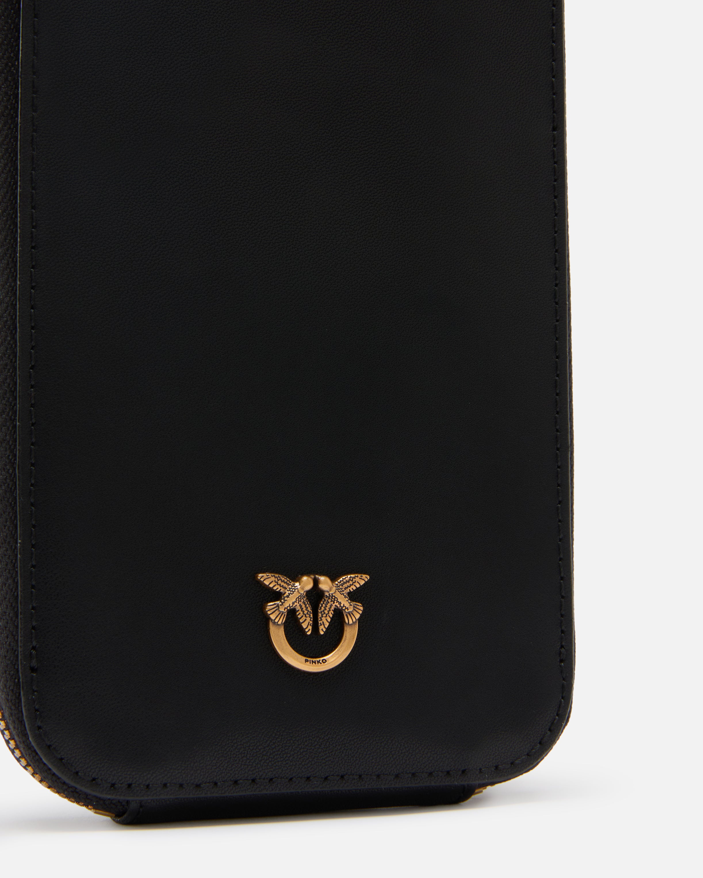 Smartphone case in soft, silky leather with a fixed top handle and two straps which are removable thanks to the carabiner, all three of which are in leather, so you can wear it as you wish and carry it with you at all times. The model is also enriched by a small plaque depicting the iconic Love Birds Diamond Cut logo on the front and features a zip-around fastening that reveals an interior lined in cotton drill fabric with branded plate. Activate your PINKO accessory: verify the authenticity of your product and access a personalised experience by scanning the Love Birds embroidery on the back with your smartphone! - PHONE CASE