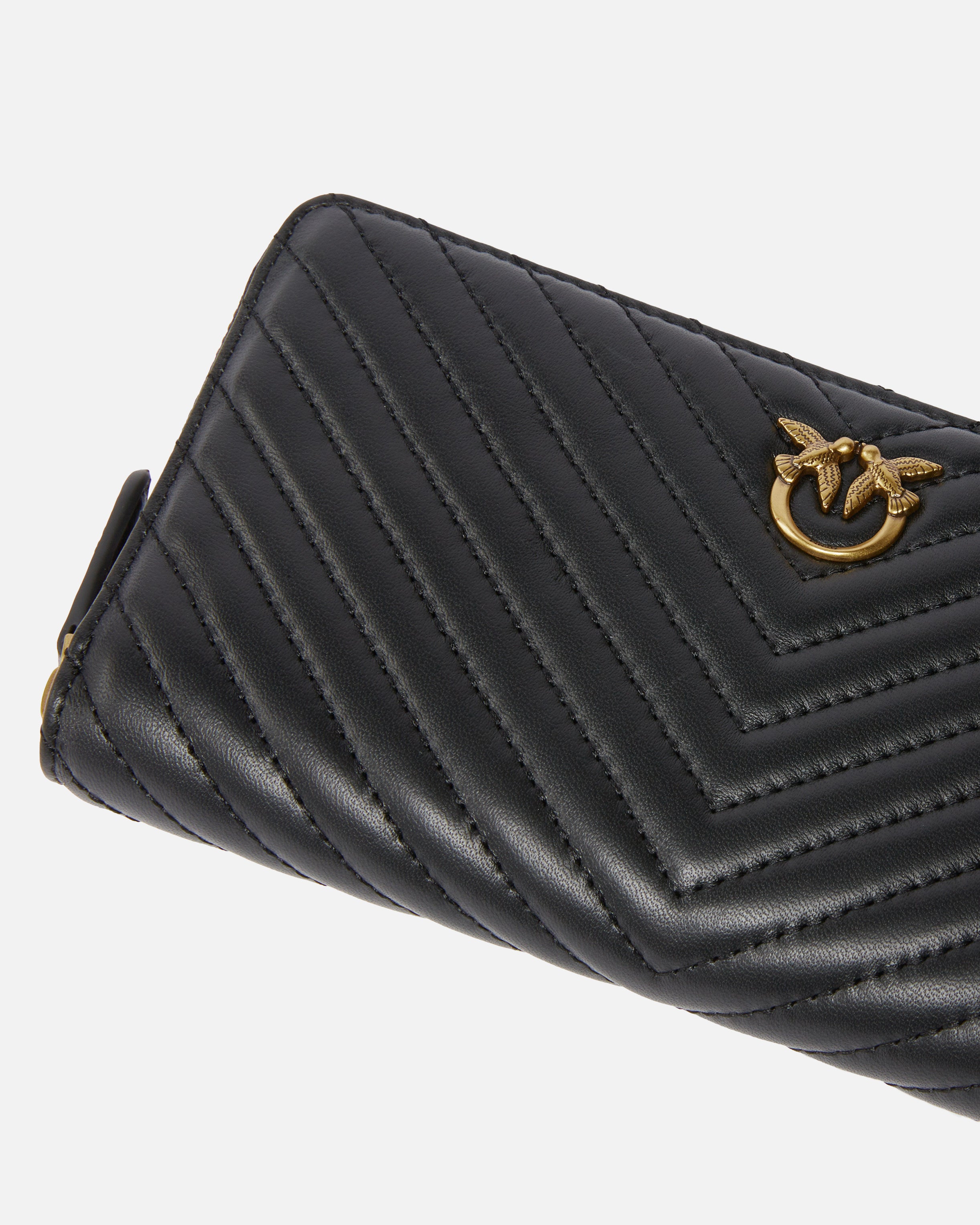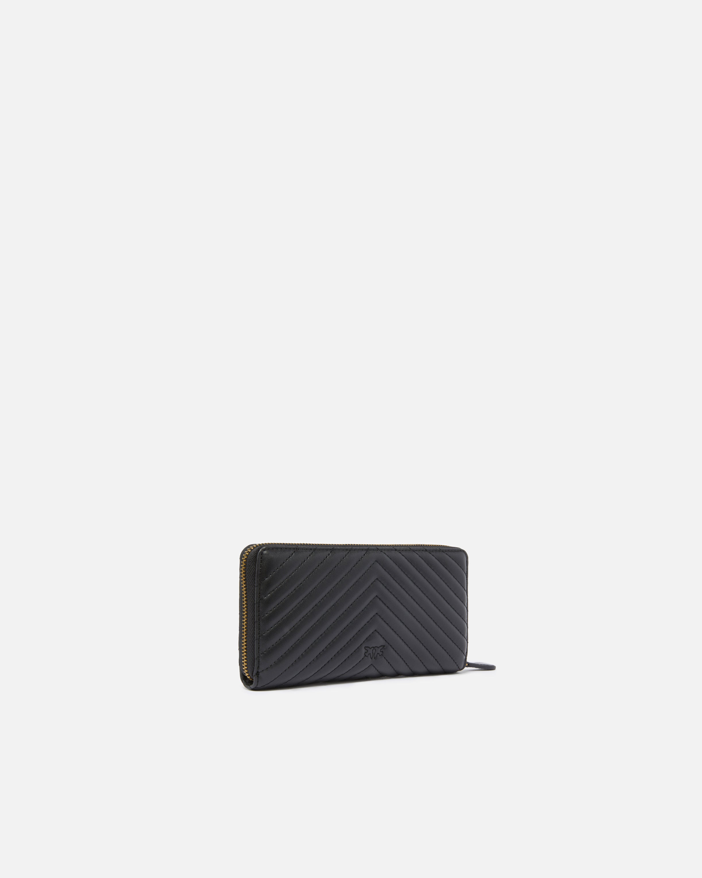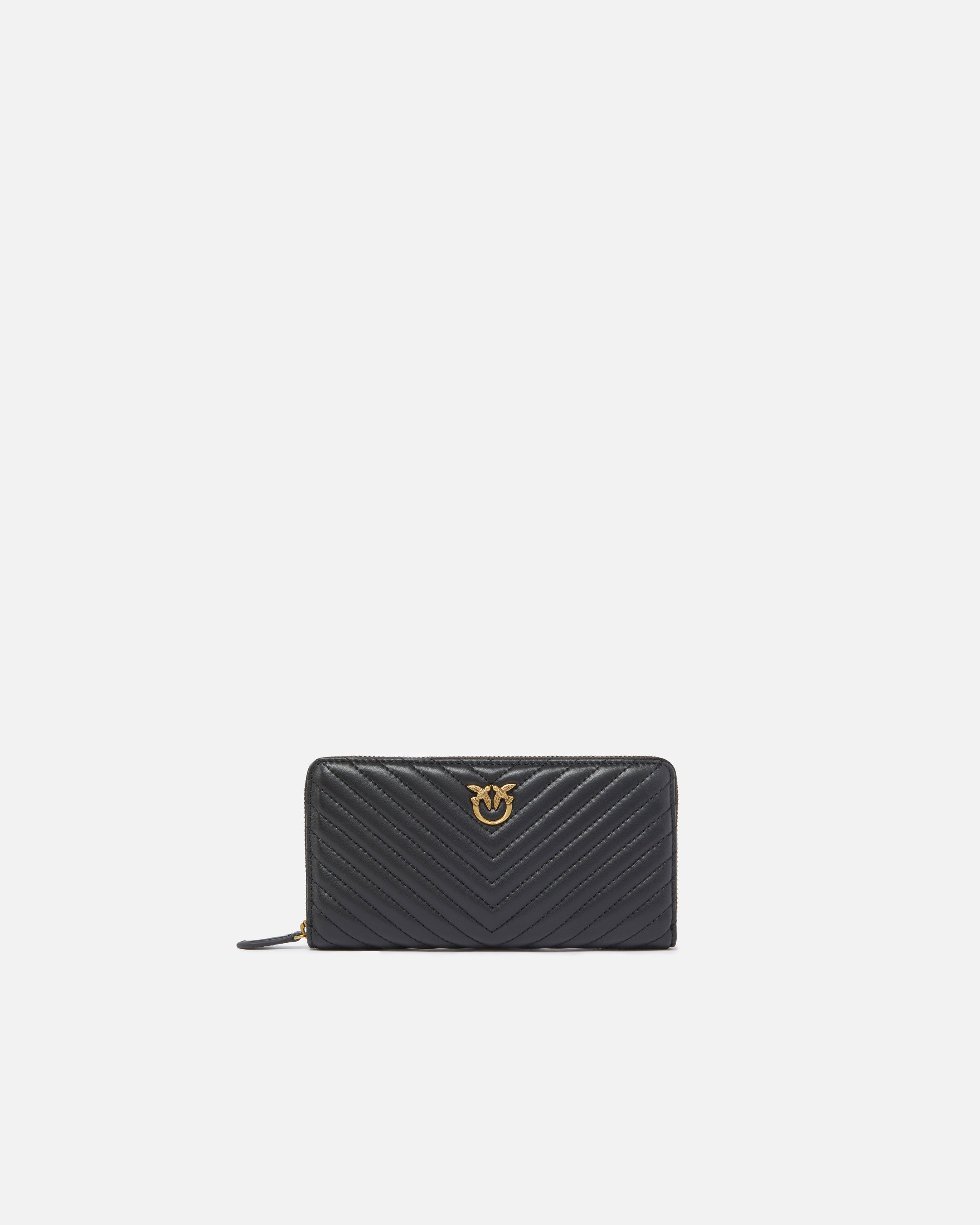 Zip-around wallet in nappa leather with chevron pattern, customised with the Love Birds Diamond Cut plaque on a leather base. The microfibre-lined interior is divided into four compartments, one of which is zipped and two of which have card slots.
